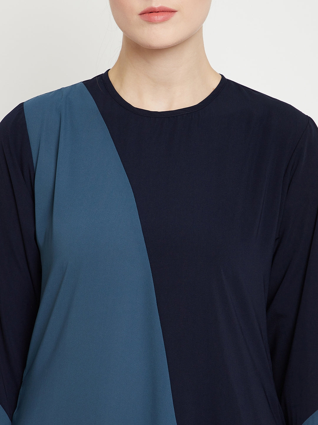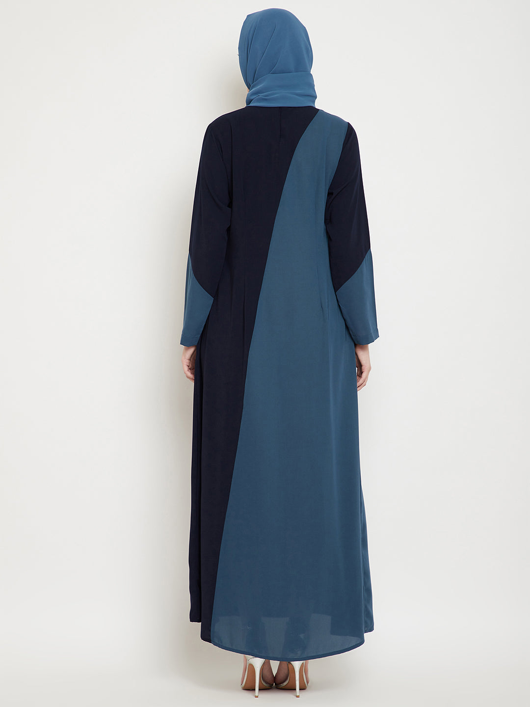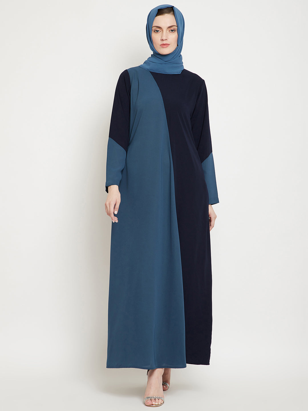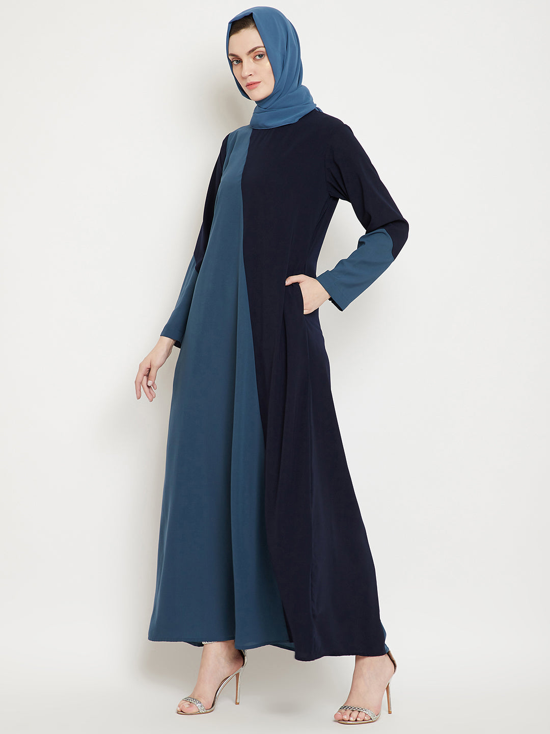 Nabia's Abaya Dress for women is a sophisticated choice in a grey and blue color combination, crafted from luxurious Nida Matte fabric. With both side pockets for added convenience, it seamlessly blends style and practicality. This abaya dress is perfect for contemporary Muslim women seeking a modern yet modest look.