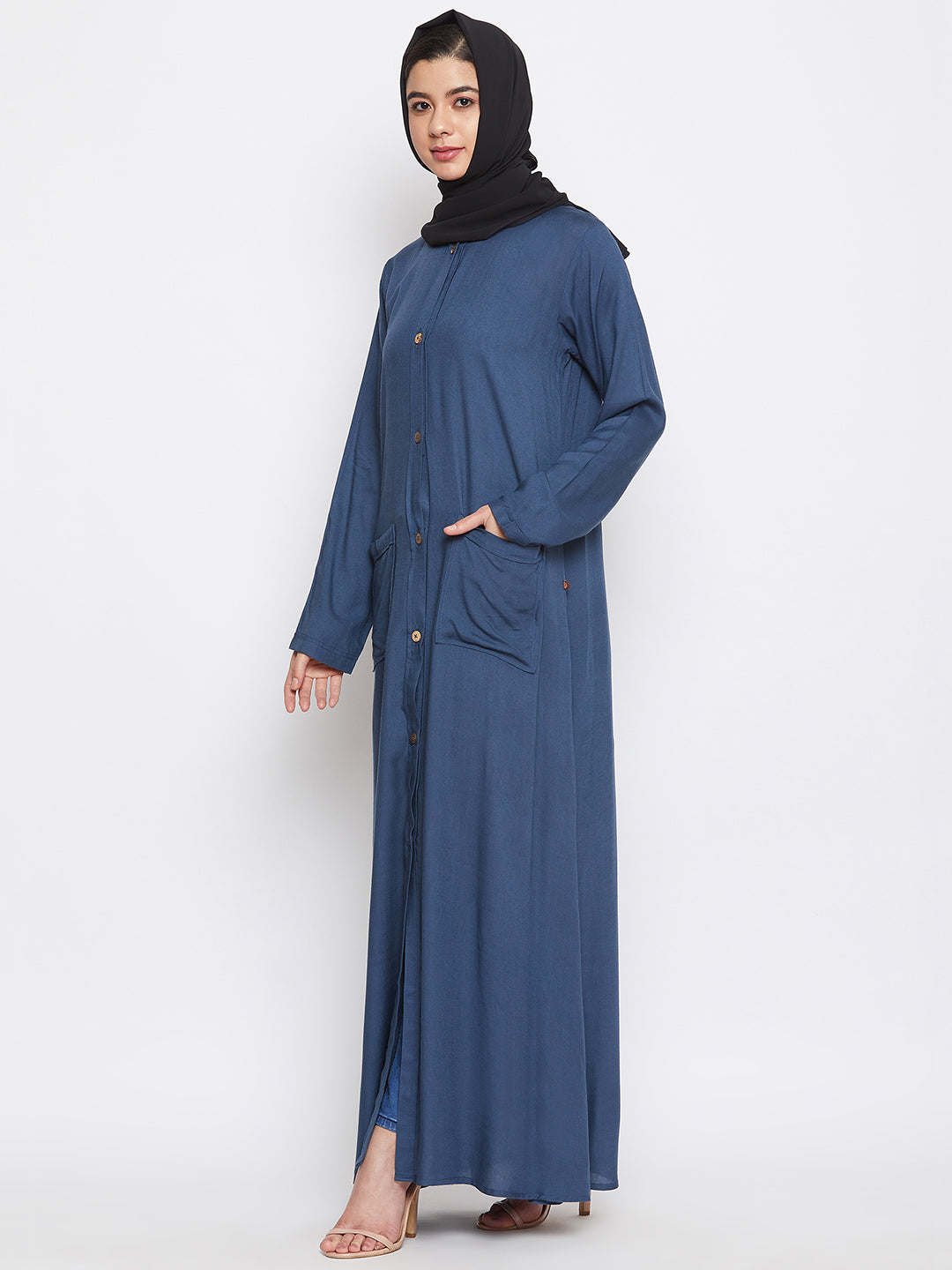 Nabia's Grey Front Open Abaya for women is a graceful choice in Rayon fabric. Featuring a front button closure for added elegance, it also includes two practical patch pockets, making it a perfect blend of style and functionality. This abaya is ideal for modern Muslim women seeking both modesty and convenience.