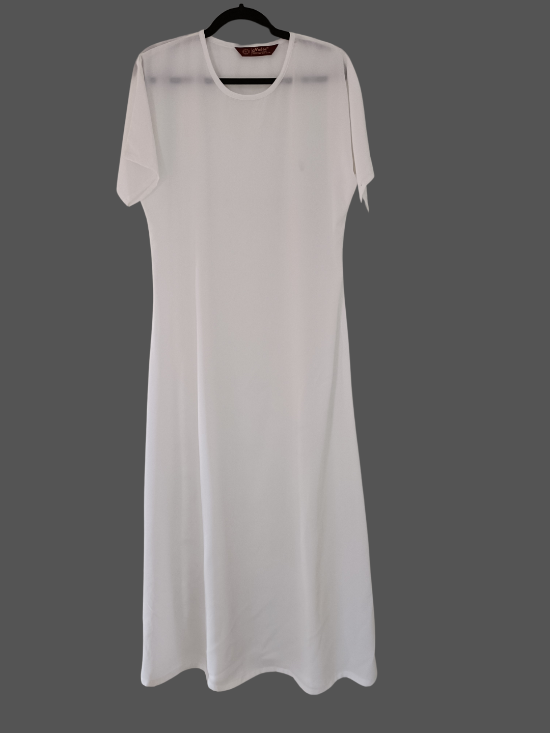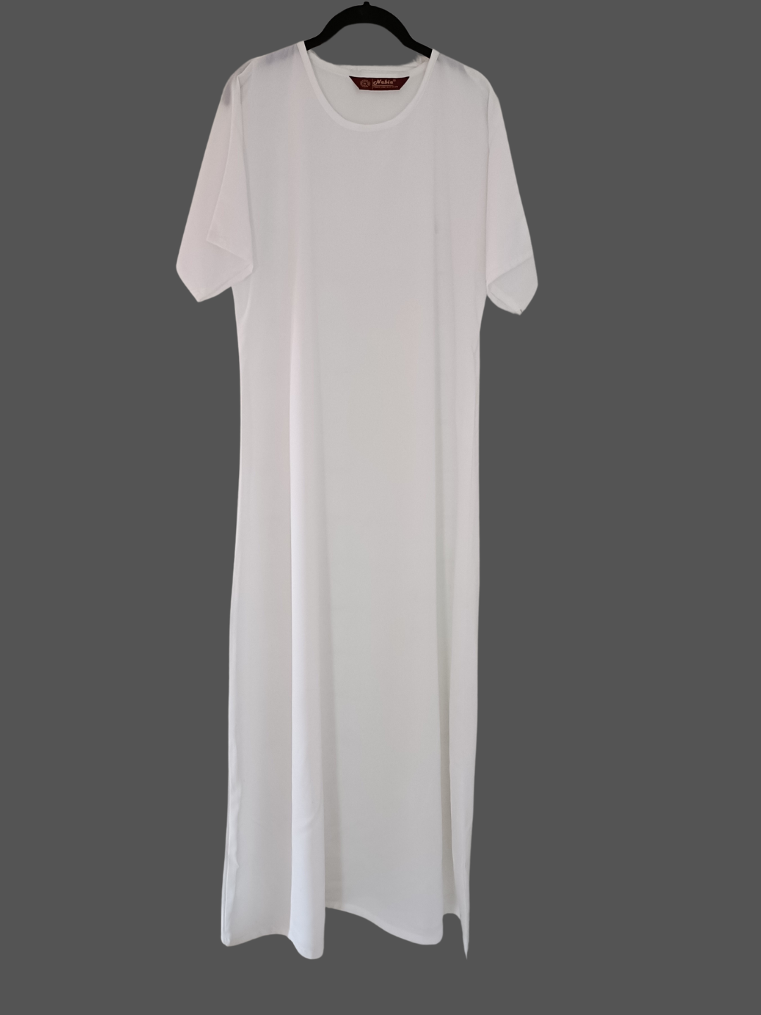 Enhance your look with our White half-sleeve inner layering slip in solid Nida Matte fabric. Its full-length design adds effortless elegance, pairing beautifully with trench coats, jackets, kimonos, and open abayas. Offering versatile style and timeless coverage, this slip is a perfect layering essential for any occasion.