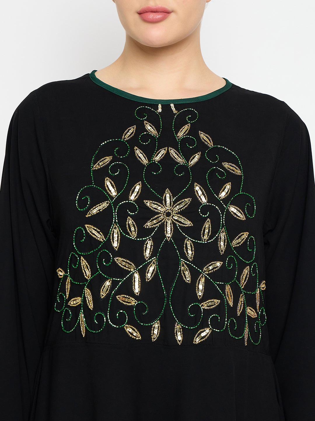 This Black Luxury Abaya, crafted from Nida Matte fabric, is perfect for festive and party occasions. It features delicate handwork detailing, piping details on the both sleeves and a modest, latest design, ensuring both elegance and comfort. Ideal for Islamic women, this abaya combines style and modesty seamlessly, making it a sophisticated and comfortable choice for any special event.