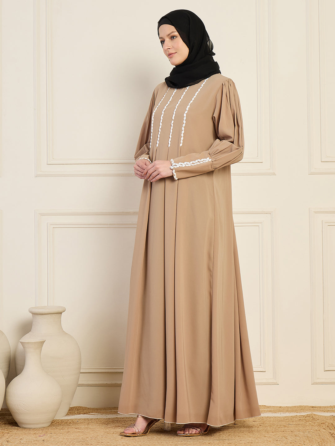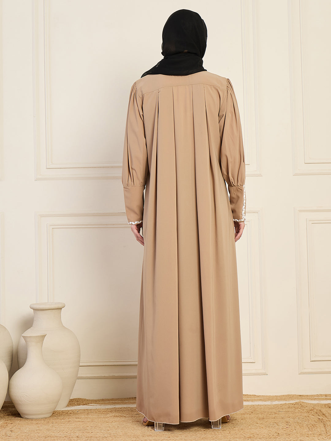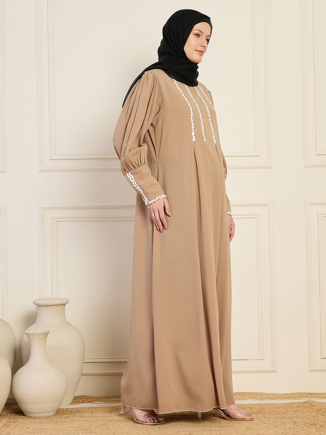 The Nabia Beige luxury abaya burqa beautifully balances elegance and modesty, designed exclusively for Islamic women. Crafted from premium nida matte fabric, it features intricate handwork detailing that adds a sophisticated charm. The zip on the cuffs offers a modern, stylish touch, while the round neck design enhances its refined appeal. Perfect for any occasion, this abaya seamlessly blends fashion with modesty, making it an essential addition to the wardrobe of women seeking timeless grace and contemporary style.
