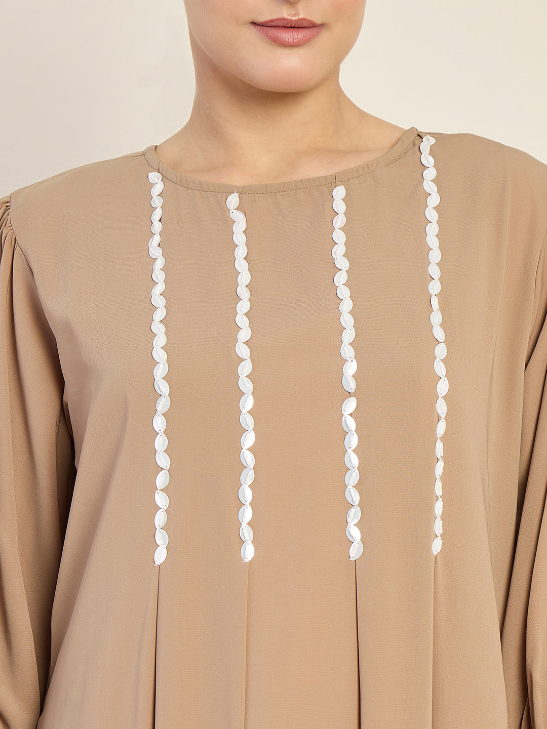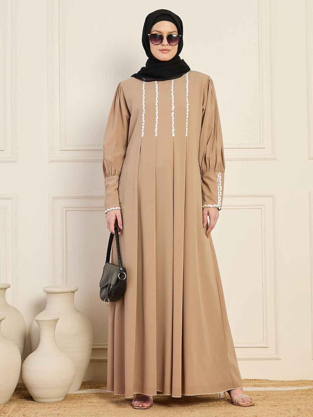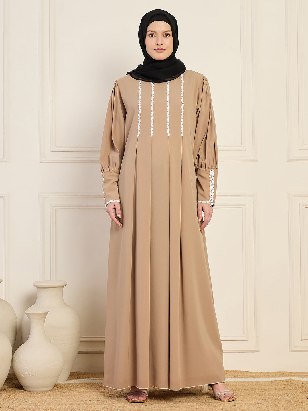 The Nabia Beige luxury abaya burqa beautifully balances elegance and modesty, designed exclusively for Islamic women. Crafted from premium nida matte fabric, it features intricate handwork detailing that adds a sophisticated charm. The zip on the cuffs offers a modern, stylish touch, while the round neck design enhances its refined appeal. Perfect for any occasion, this abaya seamlessly blends fashion with modesty, making it an essential addition to the wardrobe of women seeking timeless grace and contemporary style.
