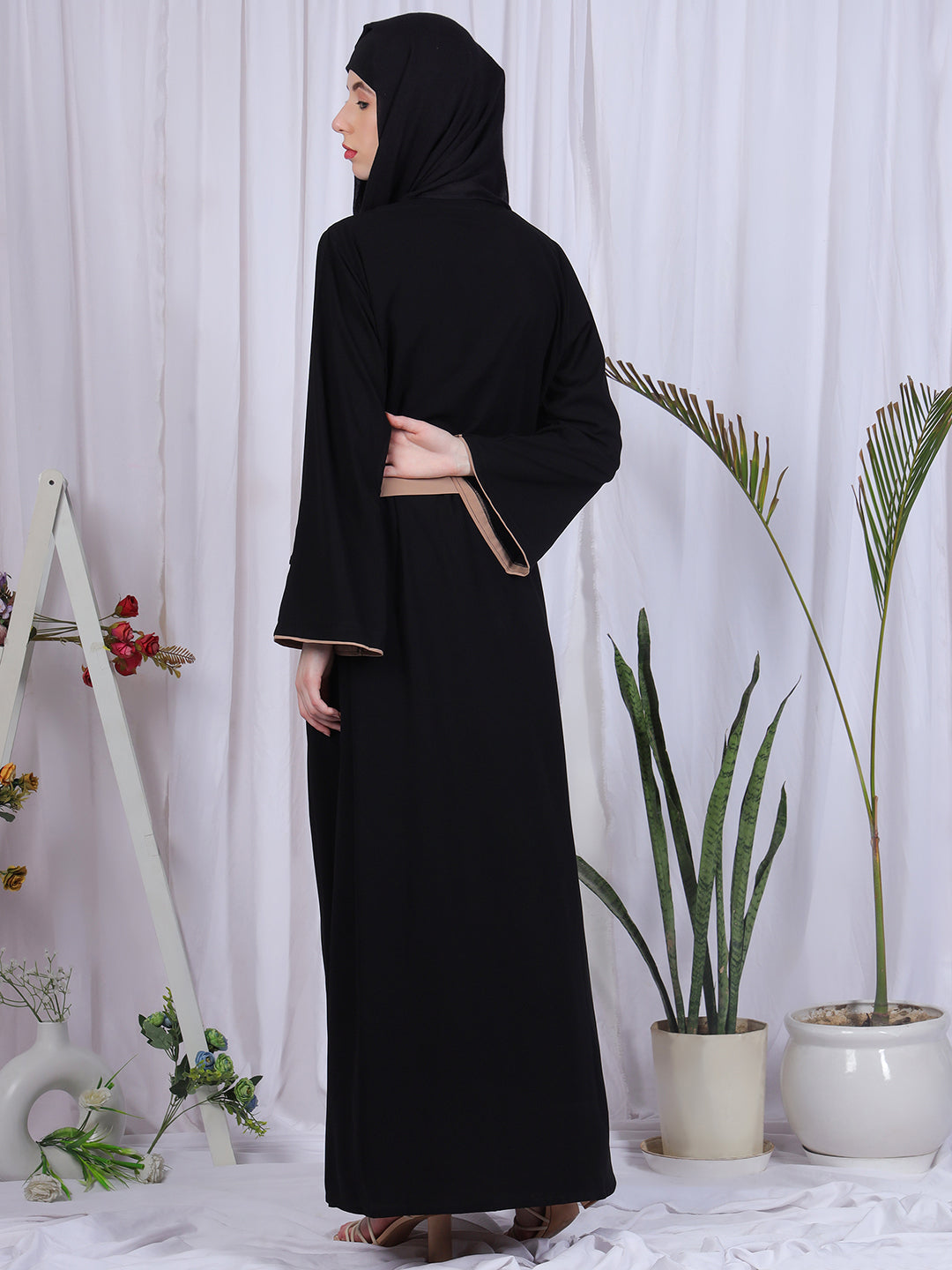 Elevate your style with inner included the Black Solid Front Open Shrug Abaya Burqa. Featuring long, free sleeves, a round neck, and a belt, it offers a loose, comfortable fit. Made from nida matte fabric, this shrug is perfect for Islamic and Muslim women, adding a chic touch to any outfit. Ideal for various occasions, it combines modesty with contemporary flair.