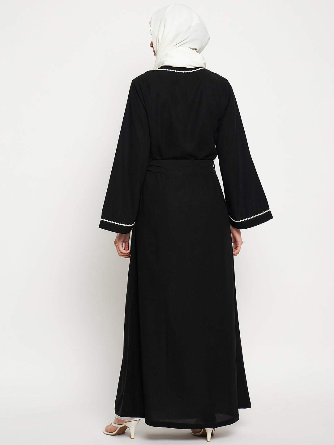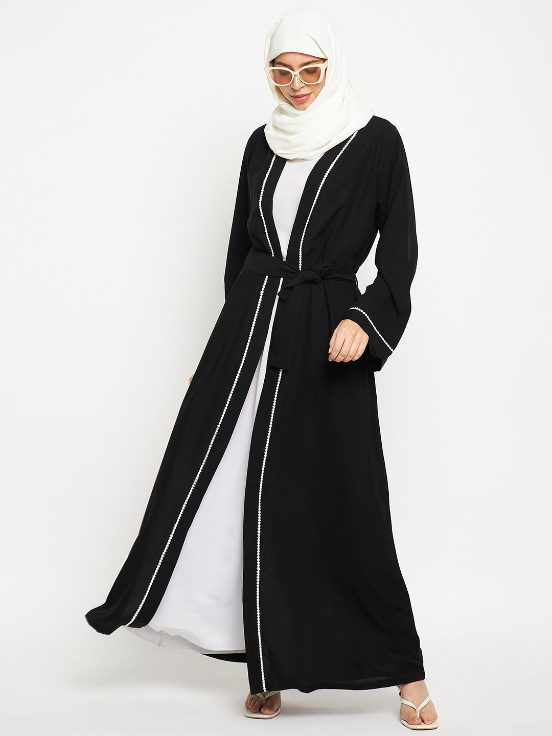 The Nabia black inner included shrug-style abaya for women is a blend of modesty and style. It's beautifully designed with white lace on the front and sleeves, creating an elegant contrast. Made from nida matte fabric, it offers both comfort and sophistication, making it a perfect choice for various occasions.