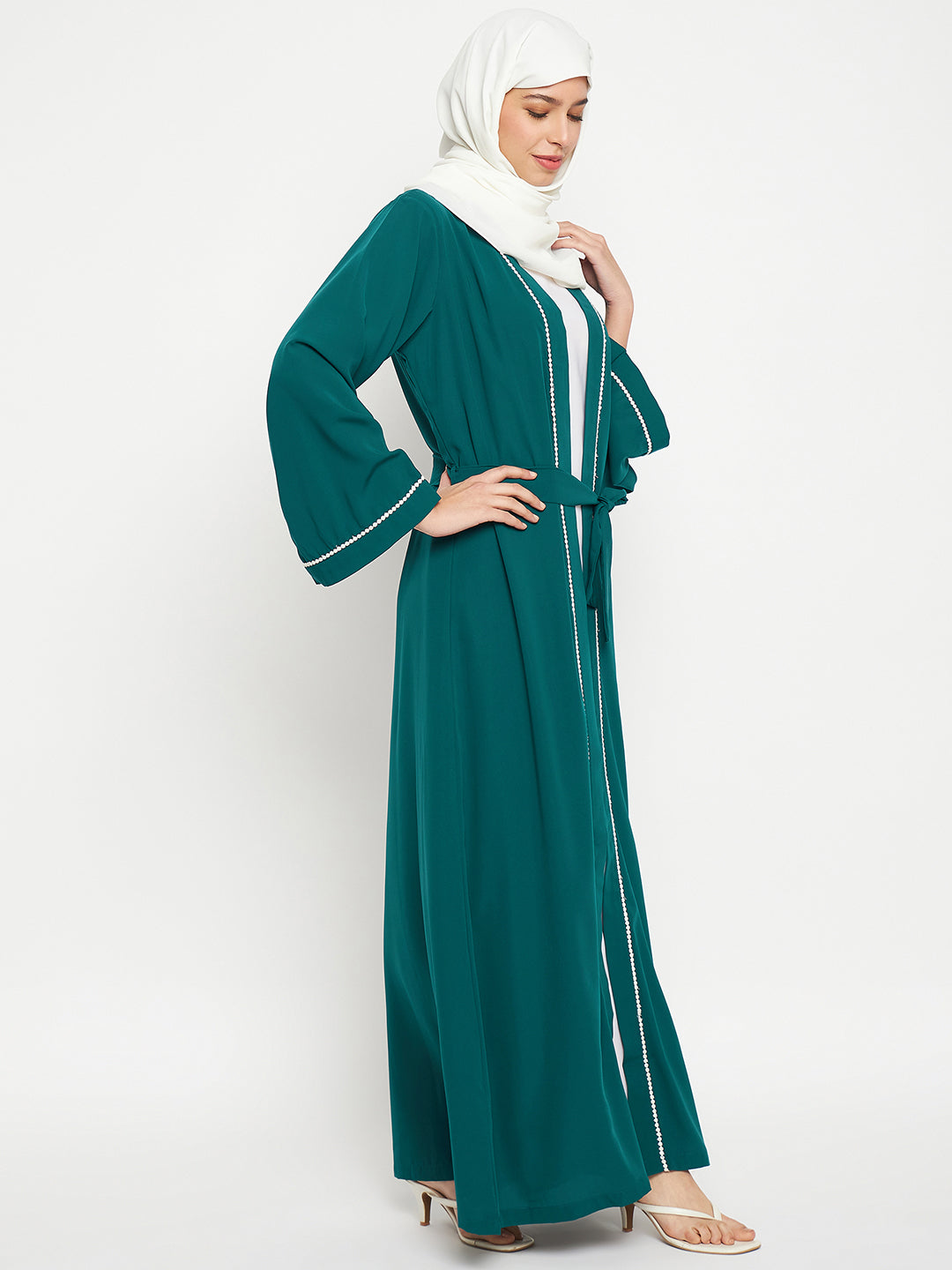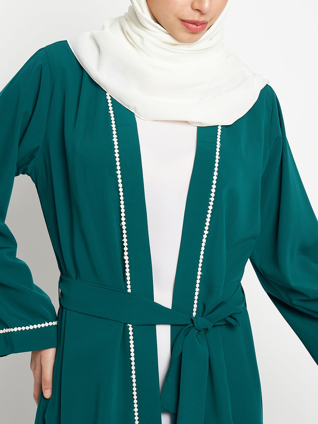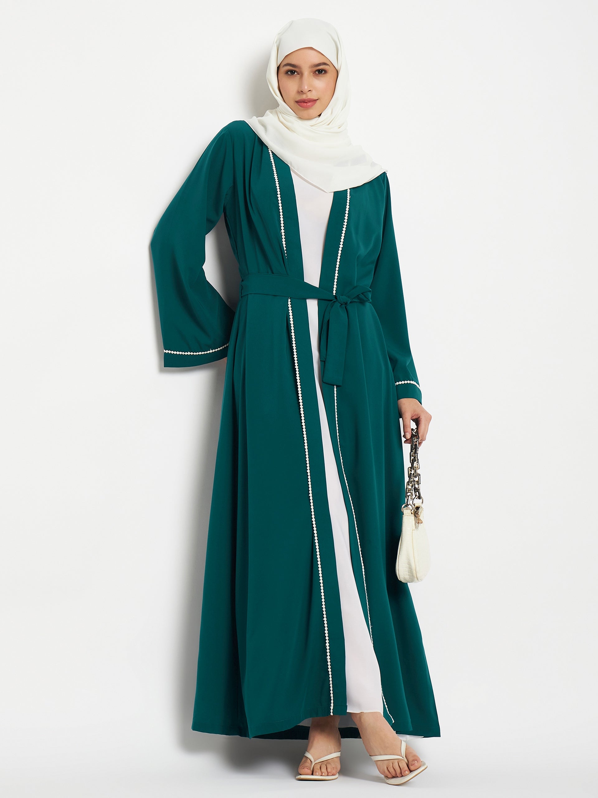 The Nabia inner included bottle green shrug-style abaya for women is a blend of modesty and style. It's beautifully designed with white lace on the front and sleeves, creating an elegant contrast. Made from nida matte fabric, it offers both comfort and sophistication, making it a perfect choice for various occasions.