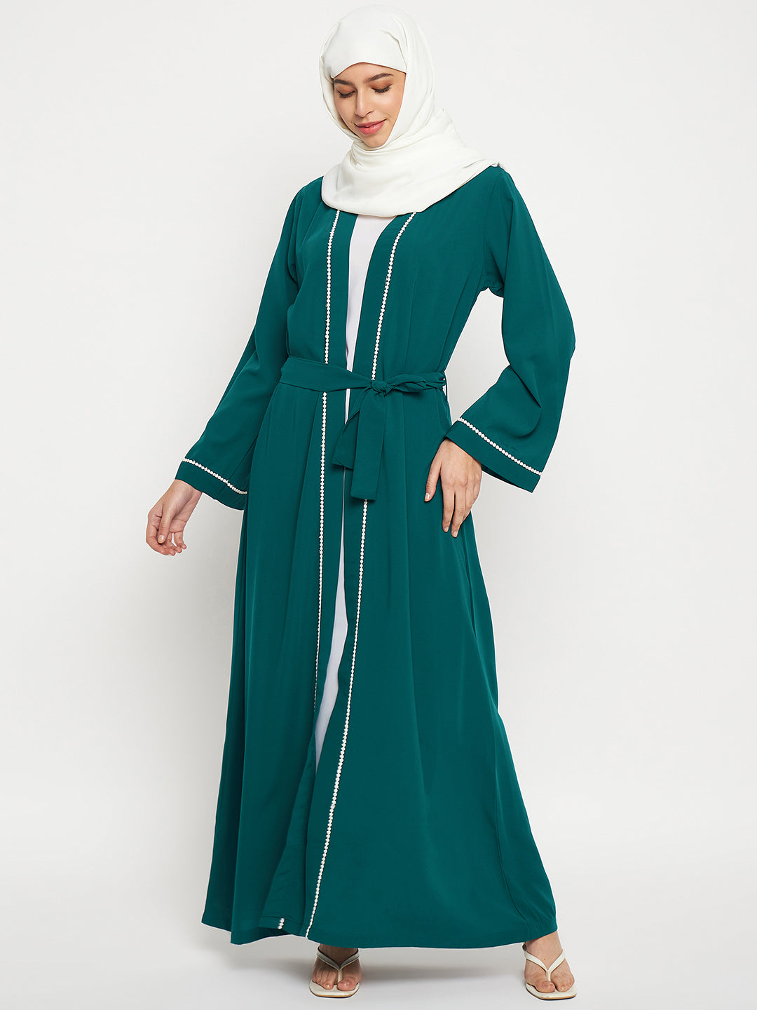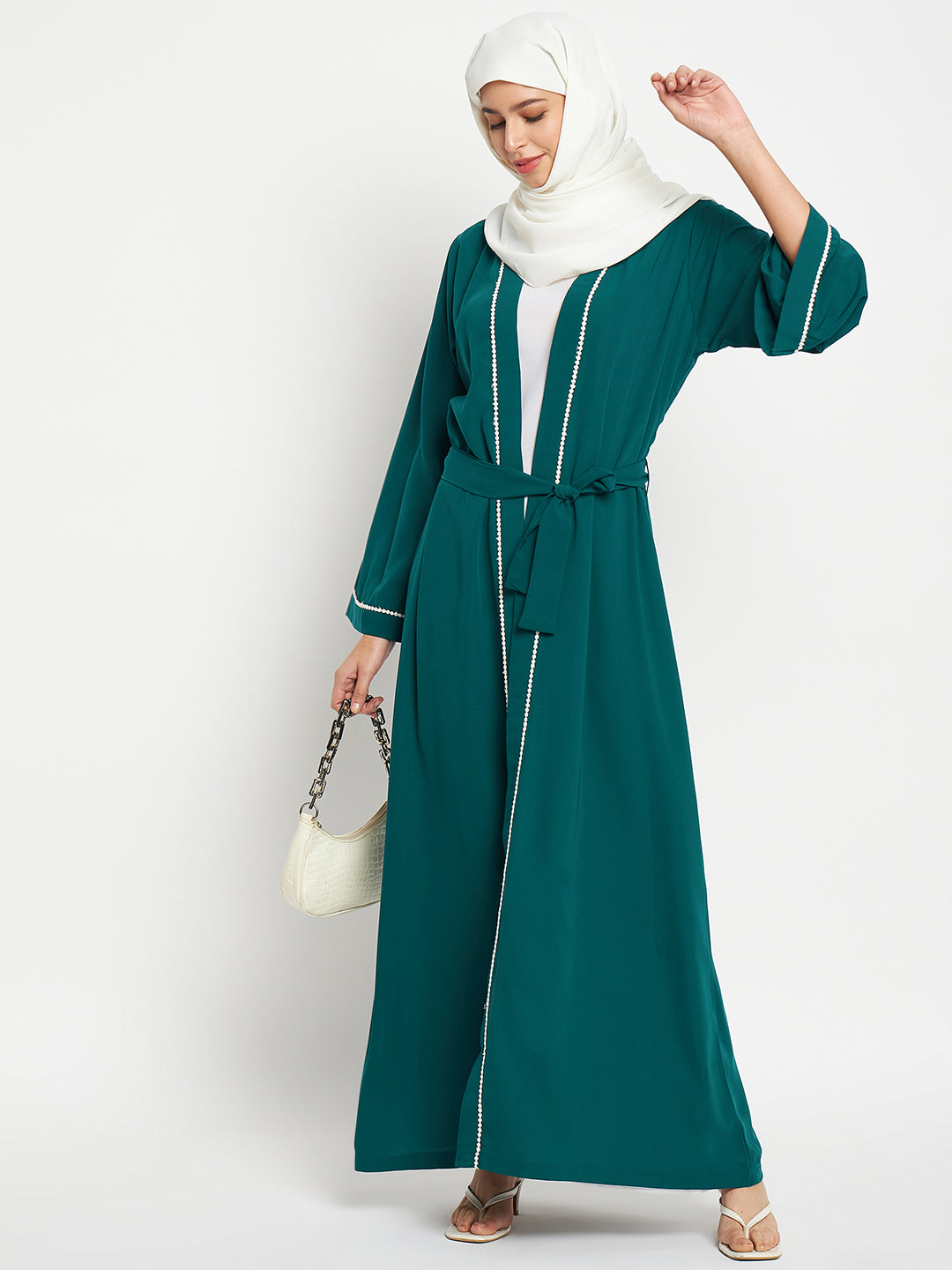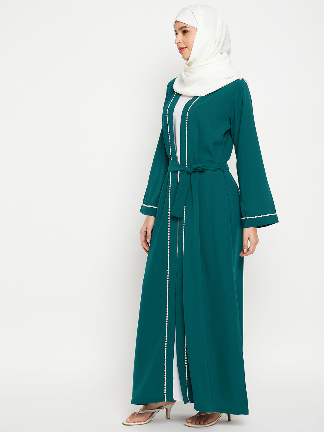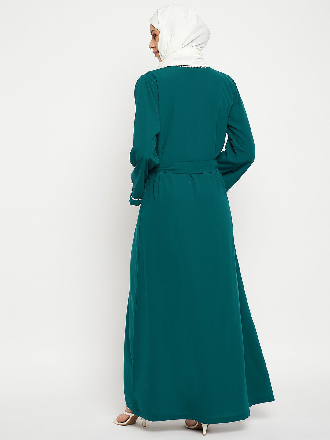 The Nabia inner included bottle green shrug-style abaya for women is a blend of modesty and style. It's beautifully designed with white lace on the front and sleeves, creating an elegant contrast. Made from nida matte fabric, it offers both comfort and sophistication, making it a perfect choice for various occasions.