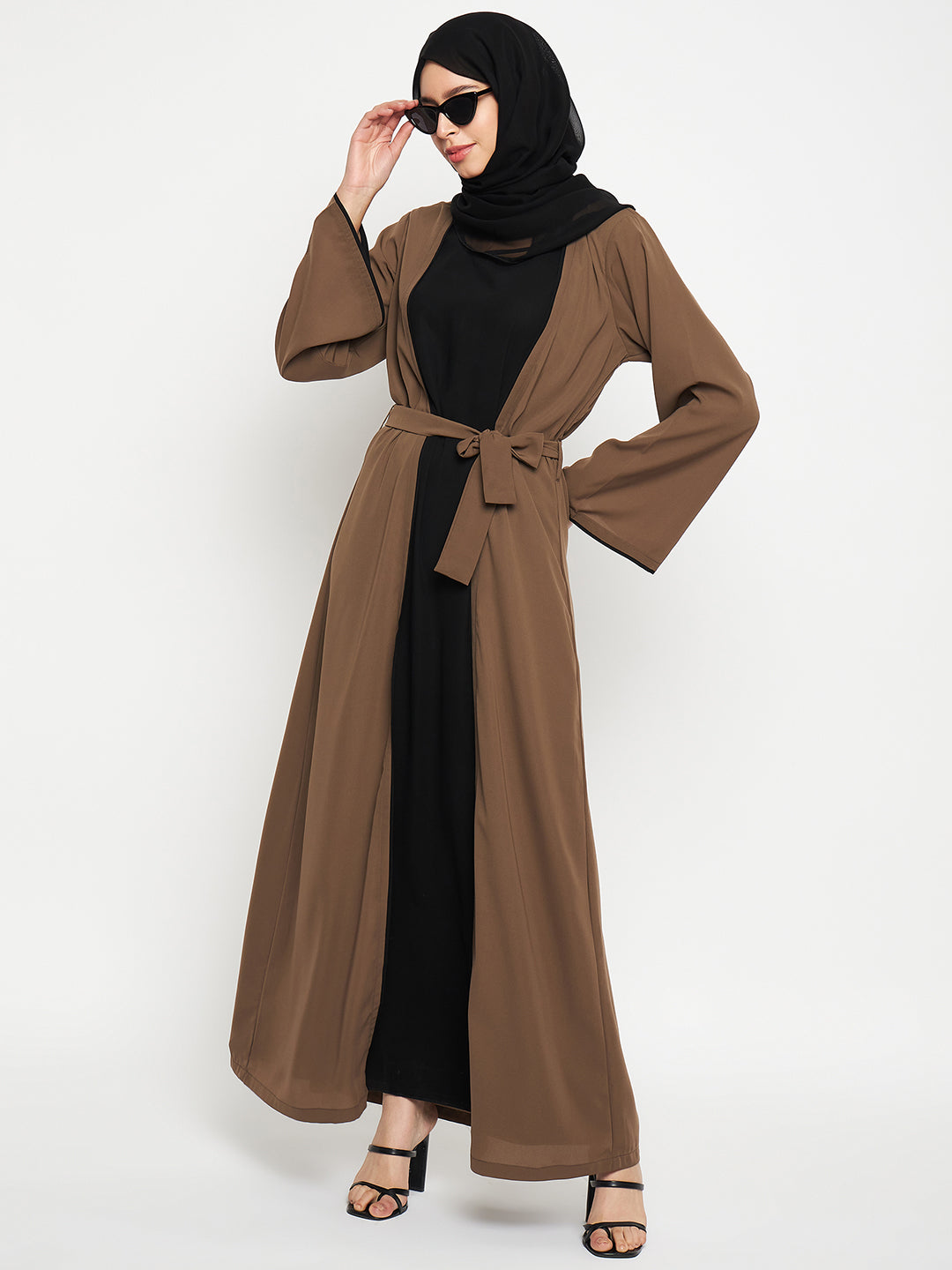 Introducing a vibrant Oat Solid Front Open inner part included Shrug abaya burqa, featuring long and free sleeves, a round neck, belt and a loose fit. Crafted from nida matte fabric, it provides a relaxed and comfortable feel, tailored for Islamic and Muslim women, adding a stylish touch to your wardrobe for various occasions.