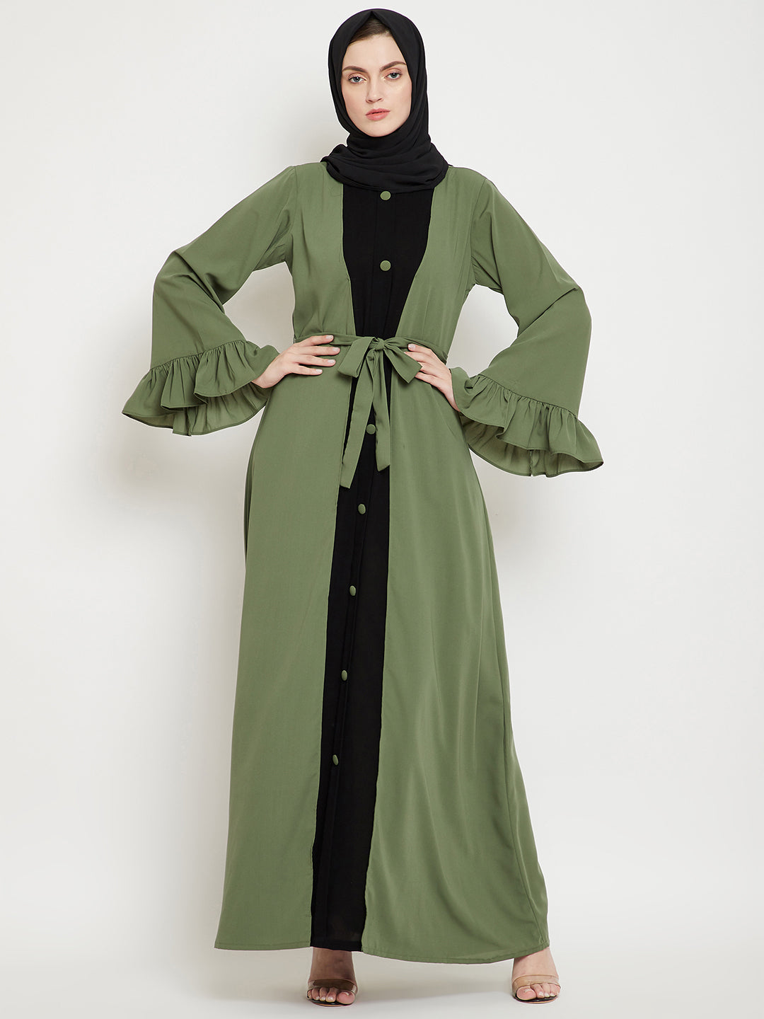 Nabia offers an exceptionally unique Abaya with two captivating color schemes. This features a beautiful combination of two distinct colours. . Made for your modesty and elegance while being a perfect comforting wear, it is adorned with two color combination, long bell sleeves, and round neck. The A-Line fit ensures supreme comfort and free movement while you are wearing it.