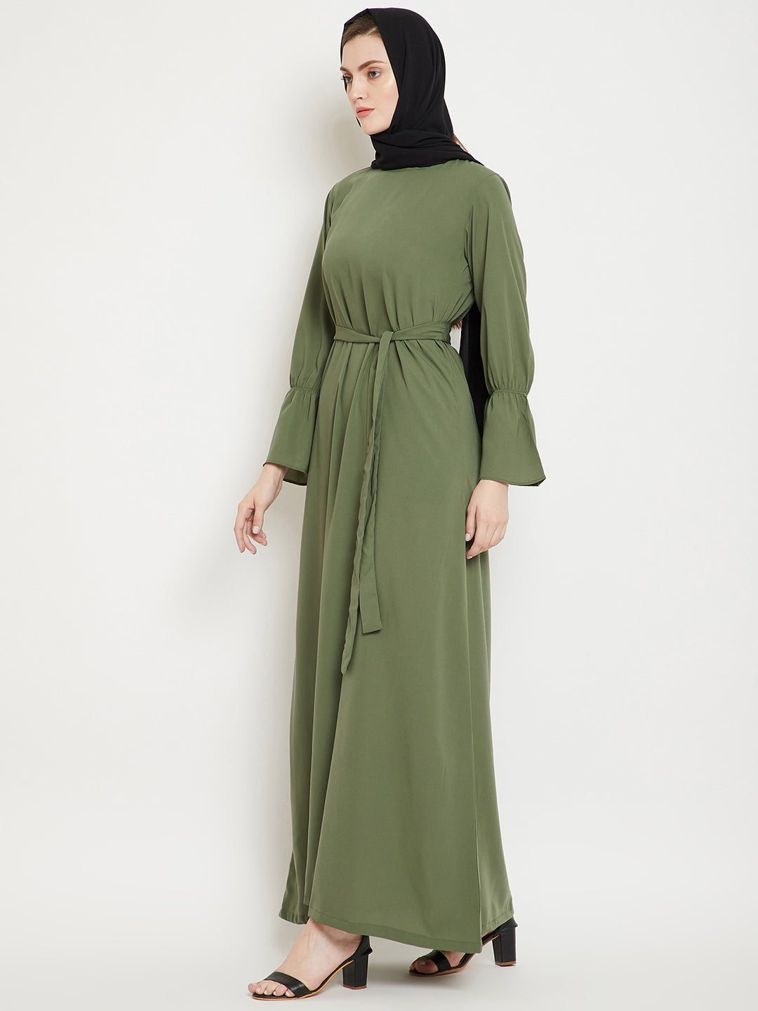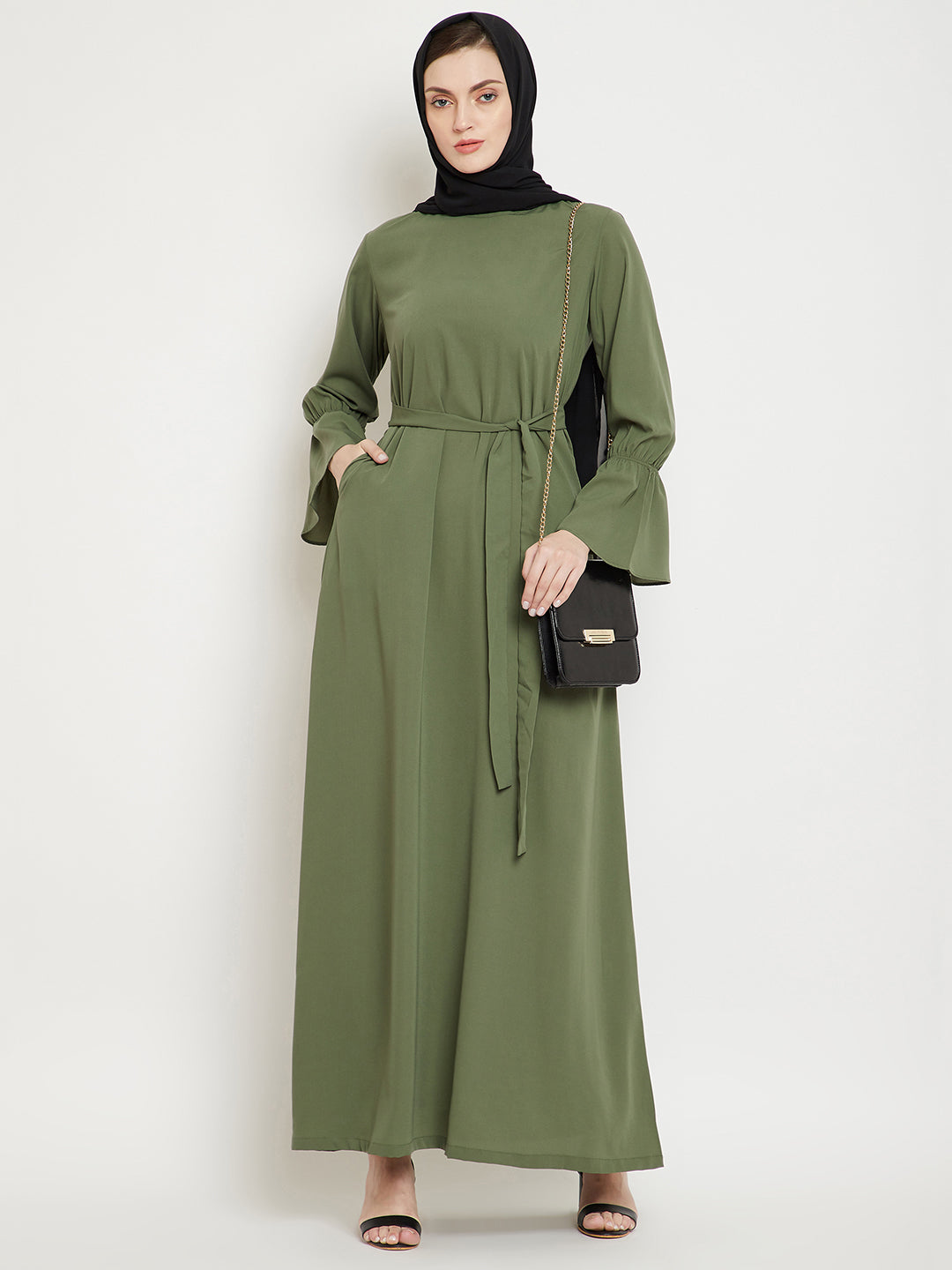 A solid-colored jade green makes a bold fashion statement that effortlessly elevates your look for any occasion. The round neck and long bell sleeves Abaya is crafted from a smooth Nida Matte fabric. While perfect for a casual, everyday style, it also holds its own at various events. This contemporary choice is versatile, allowing you to flaunt it year-round.