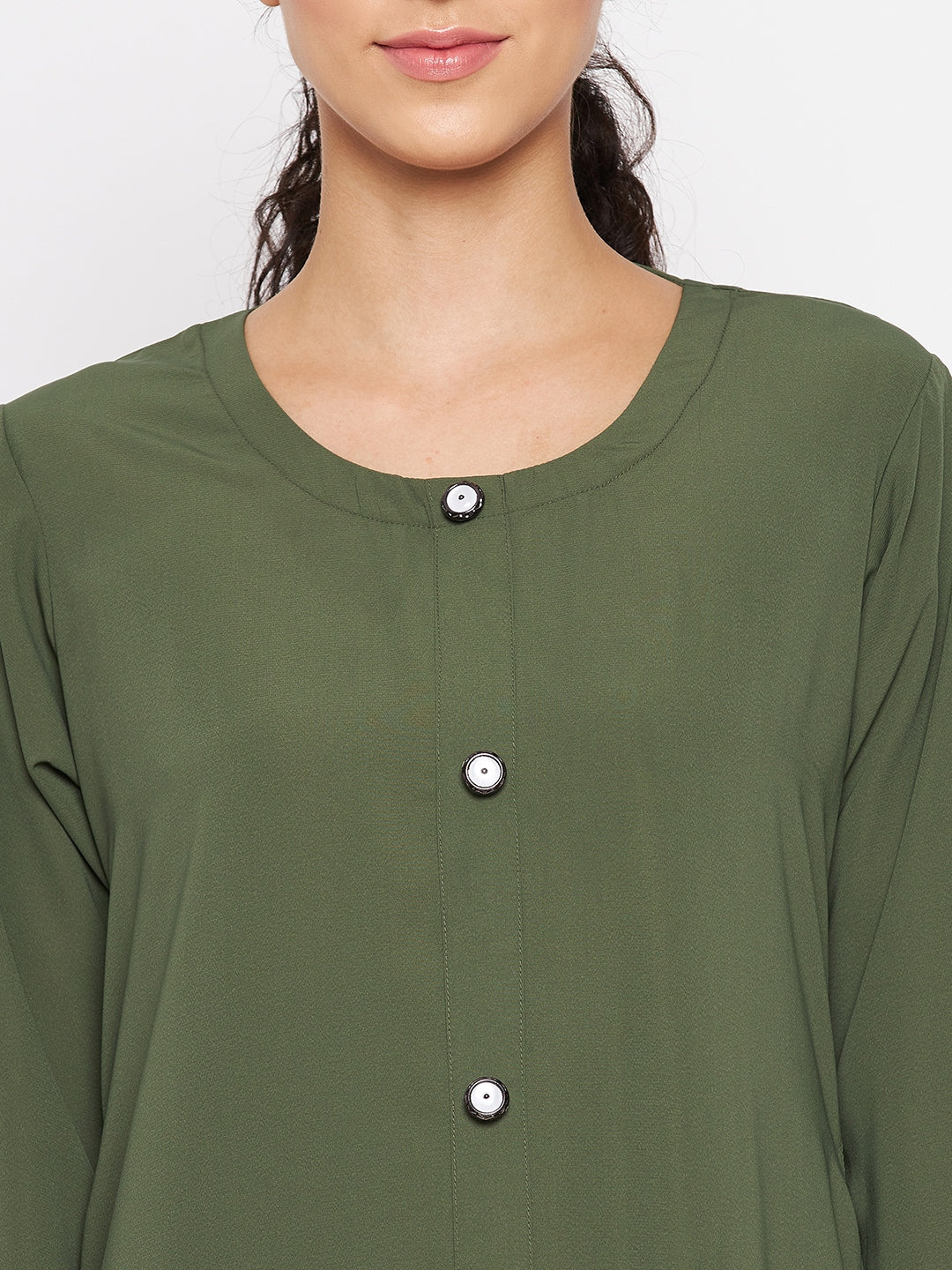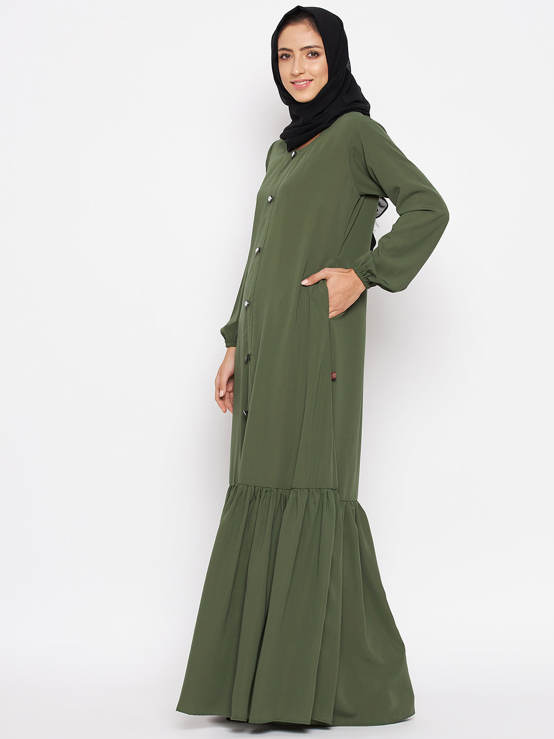 Nabia's Jade Green Abaya for women is a stylish choice in luxurious Nida Matte fabric. With long sleeves featuring elastic for adjustment and front buttons for enhanced detailing, it combines fashion and comfort seamlessly. This abaya is ideal for modern Muslim women seeking a contemporary yet modest look.