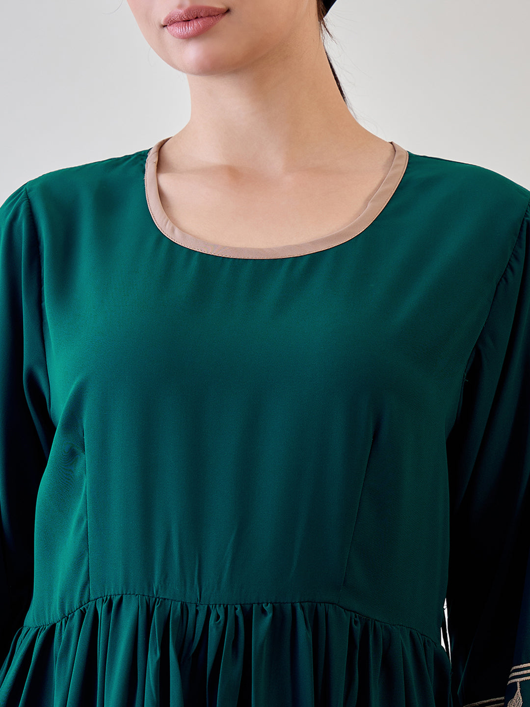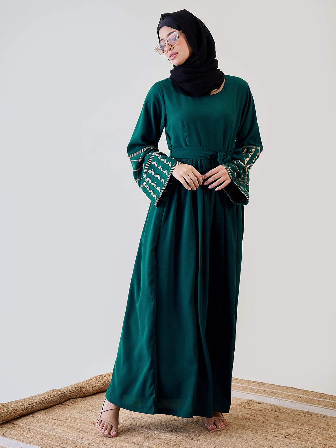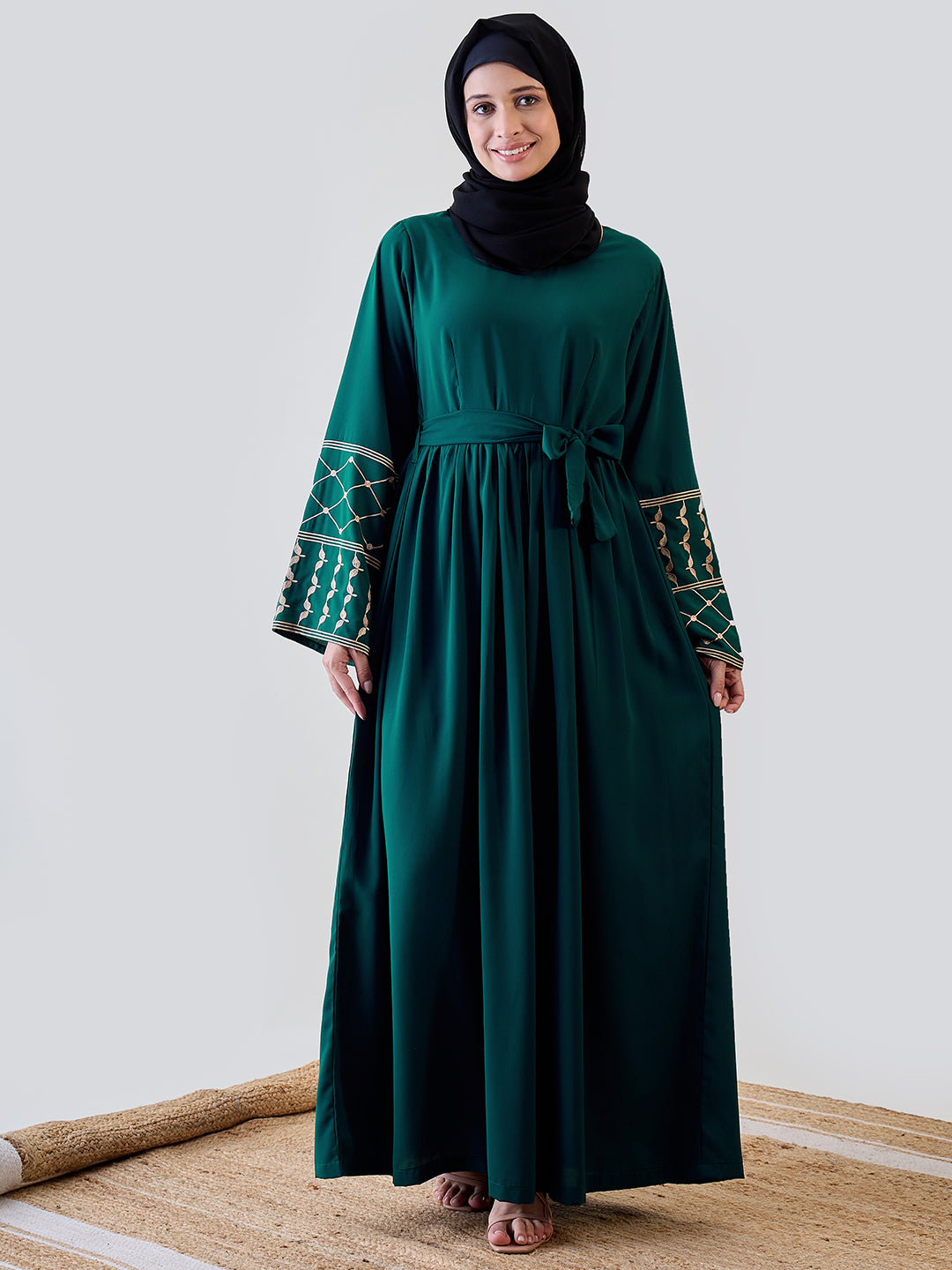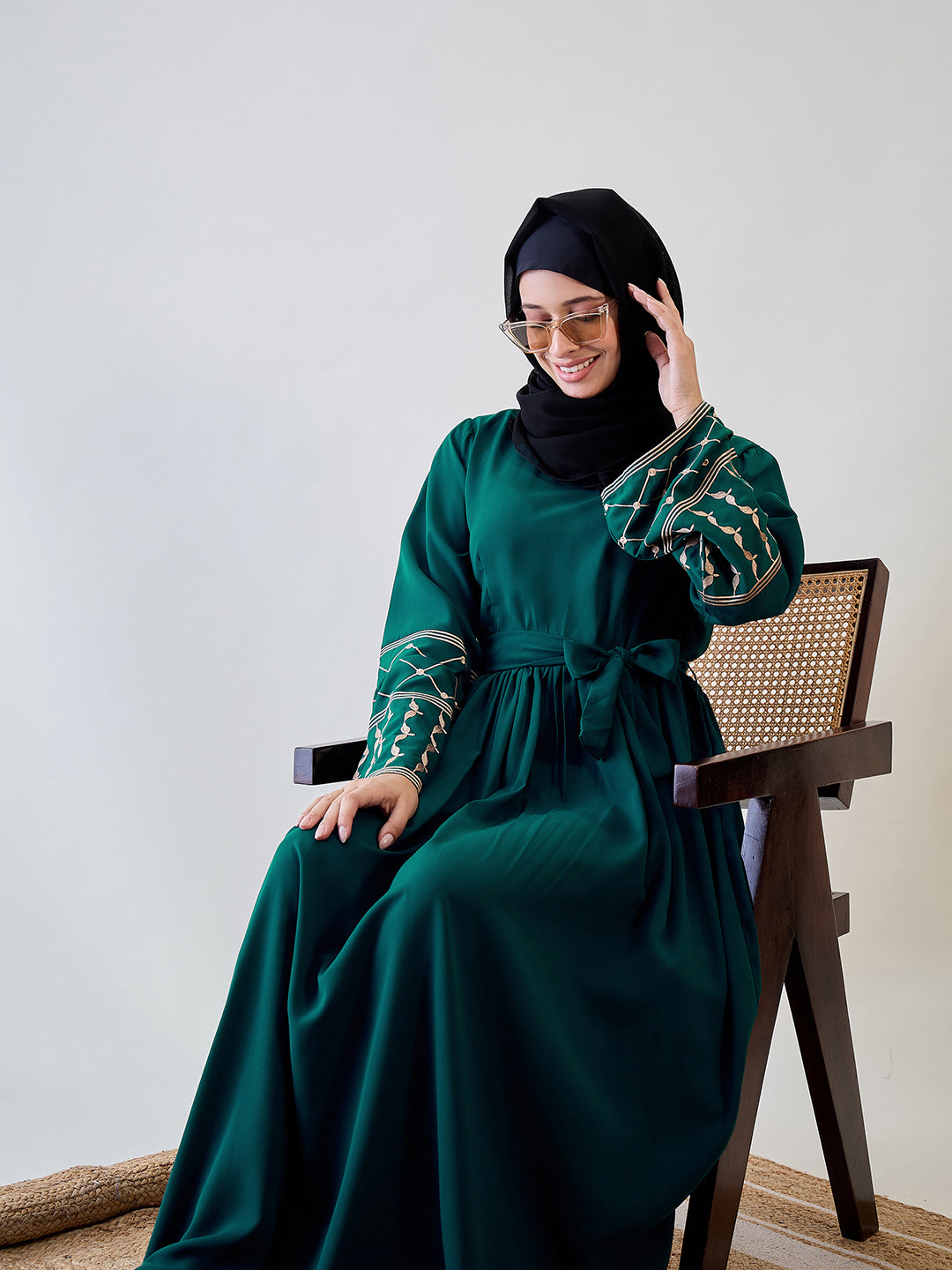 This bottle green kafiyyeh embroidered abaya burqa, crafted from soft Nida Matte fabric, offers a perfect blend of comfort and elegance for today’s modest Muslim women. Featuring a round neck and intricate embroidery detailing on the sleeves, its solid design combines traditional modesty with a contemporary, stylish flair, making it ideal for both daily wear and special occasions.