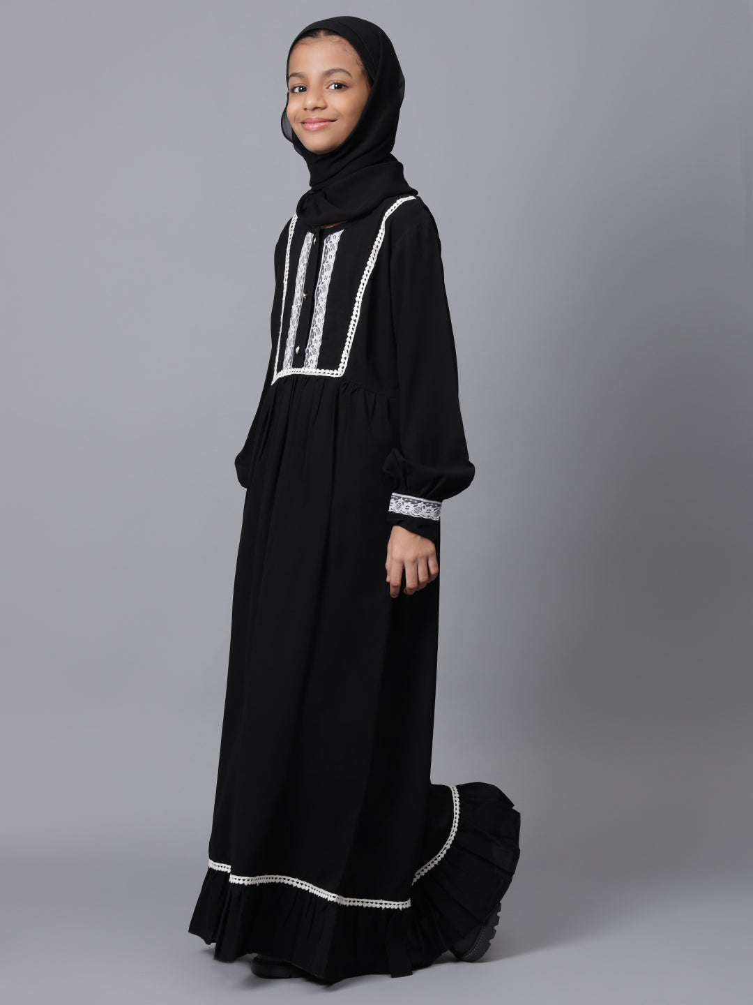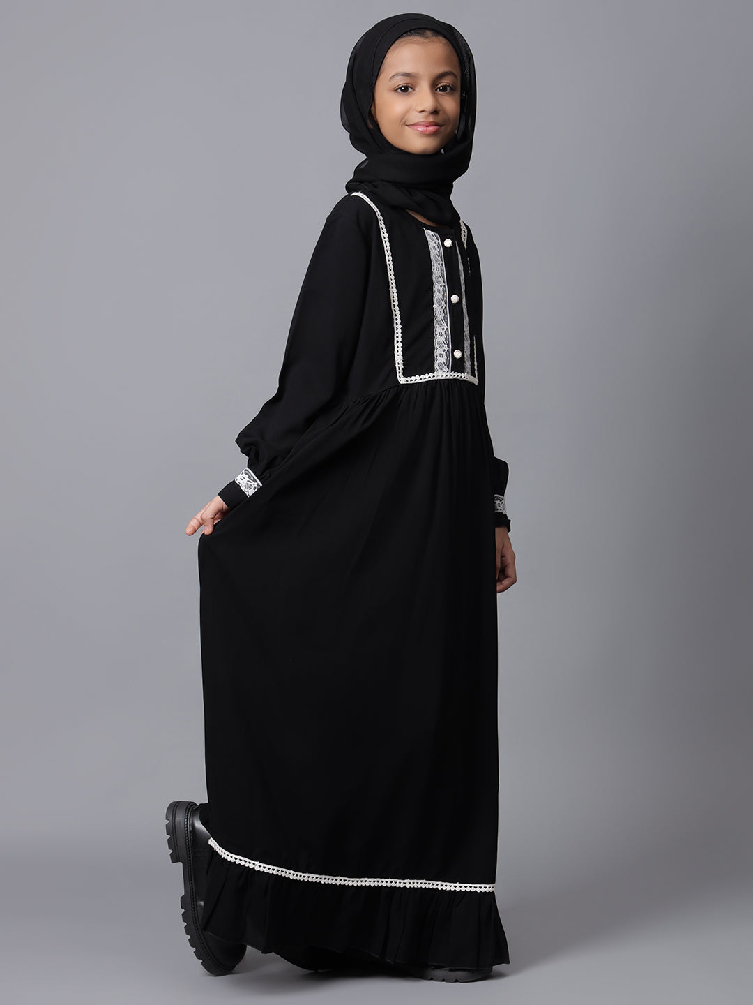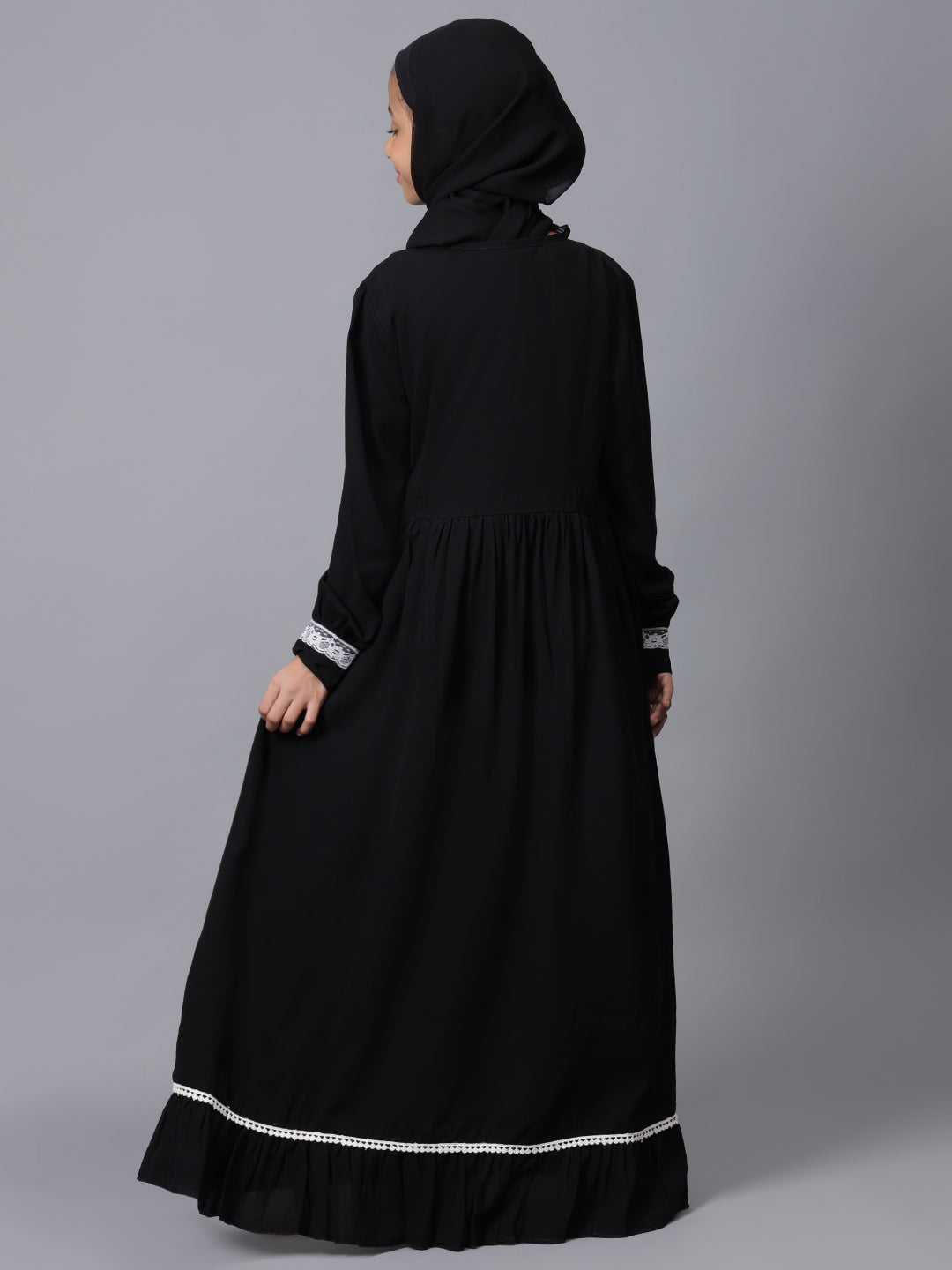 This black solid Abaya for Muslim girls features elegant lace detailing, adding a touch of sophistication to its modest design. With a relaxed fit for comfort, it's perfect for daily wear. Crafted with durability in mind, this Abaya combines the latest fashion trends with long-lasting use, ensuring your child remains stylish and modest for any occasion.