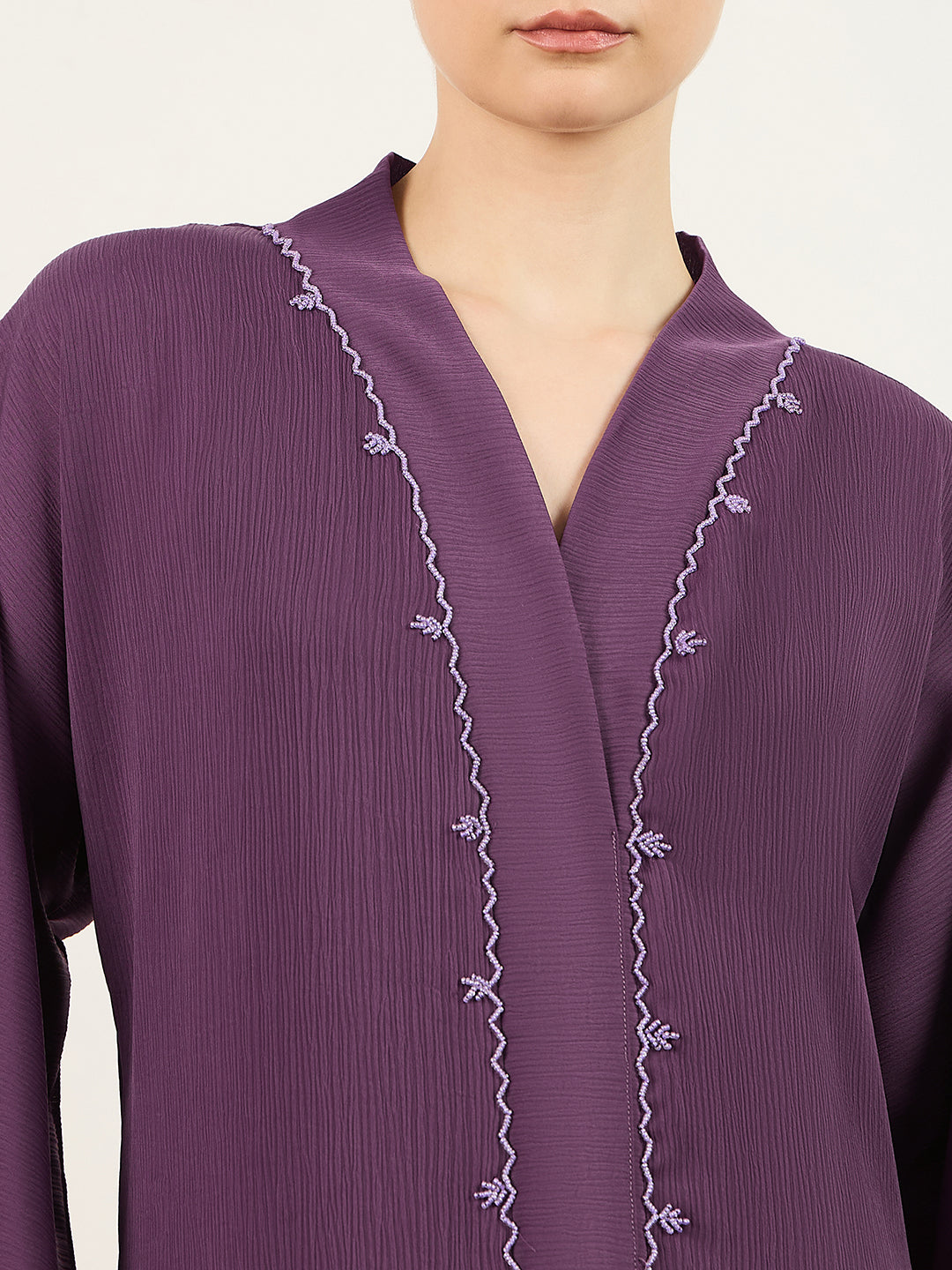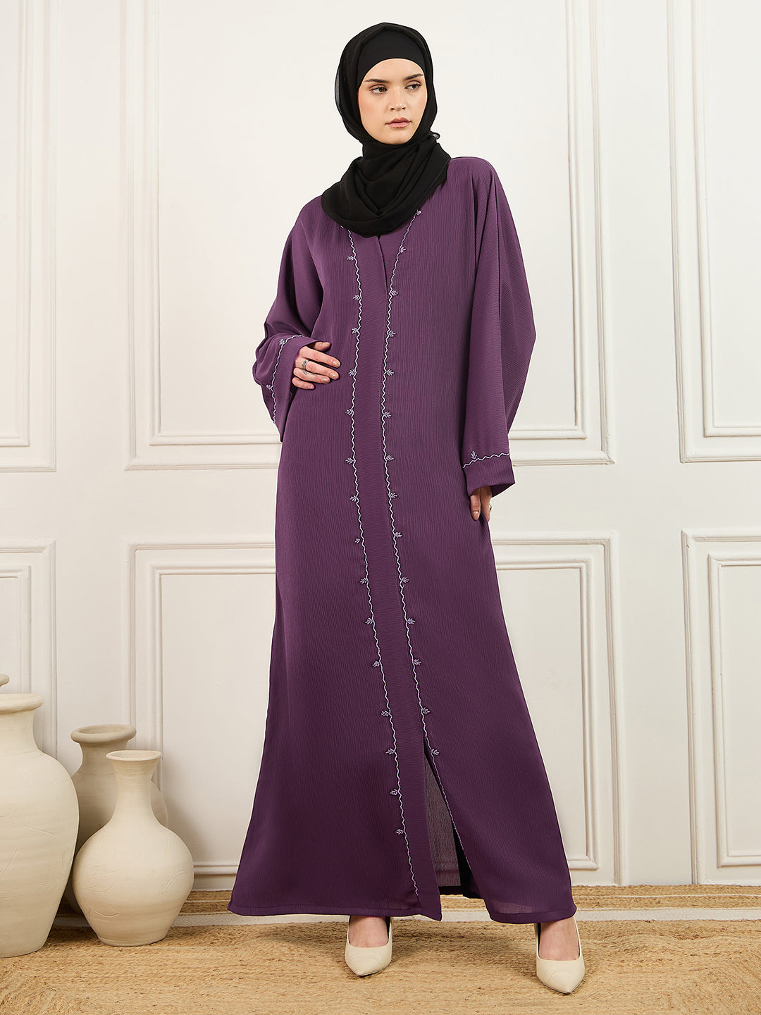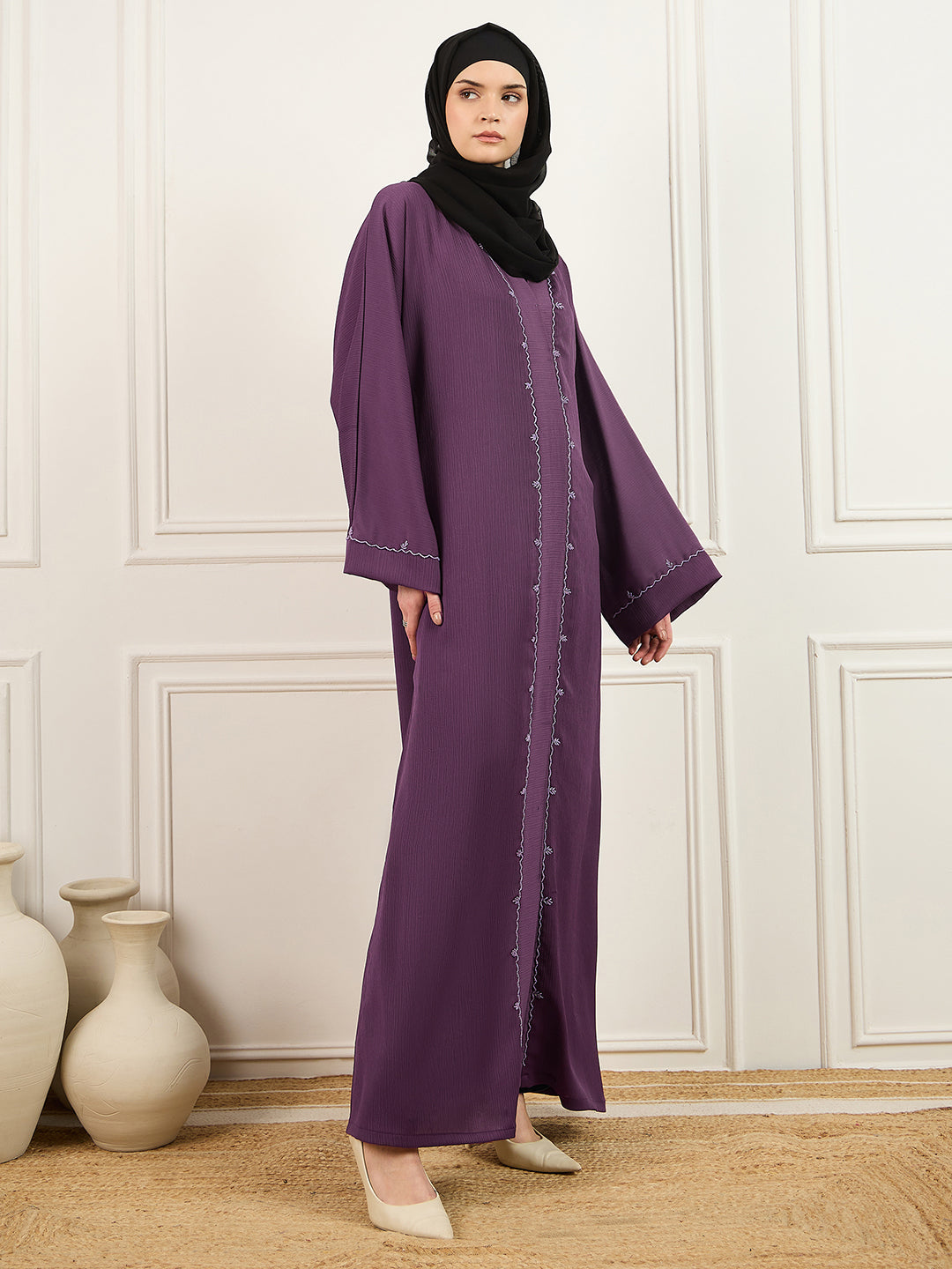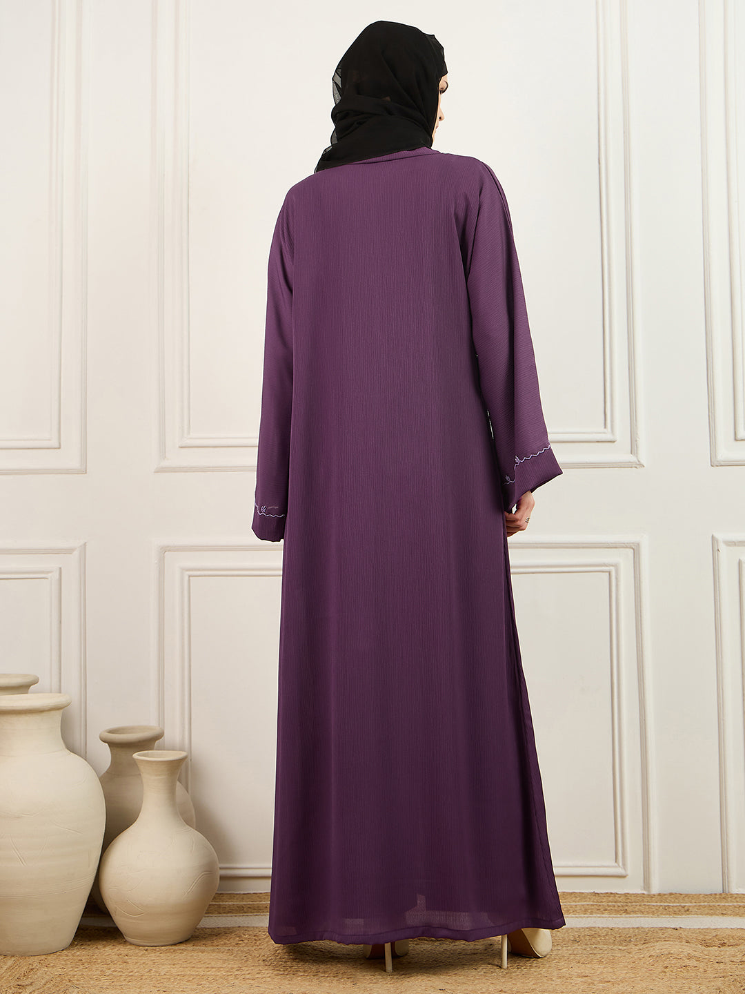 Enhance your modest style with this lavender luxury abaya burqa, made from premium zoom fabric for a soft, elegant drape. Delicate handwork on the front and sleeves adds a touch of timeless charm and sophistication. Designed with a relaxed fit for all-day comfort, it features a graceful V neckline and easy slip-on closure. Ideal for Islamic women, this abaya beautifully merges tradition with contemporary fashion—perfect for festive gatherings, special occasions, or elegant everyday wear.