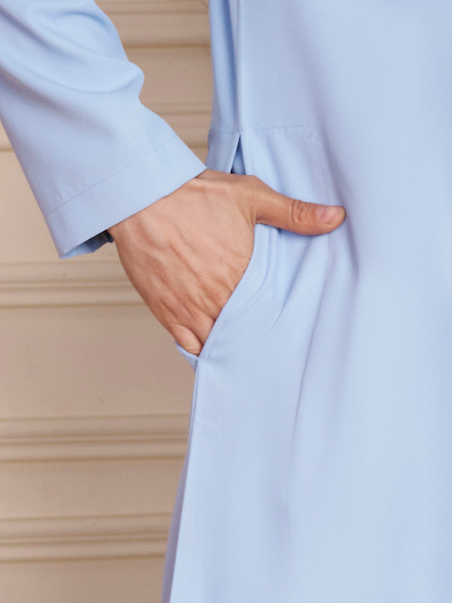 Enhance your traditional style with this light sky blue men’s hooded thobe / jubba, crafted from premium poly cotton material for a soft feel, airflow, and durability. Designed with a stand collar, full-length sleeves, and a comfortable straight cut, it ensures ease of movement. Featuring a front button closure and plain modern finish, this Islamic men’s jubba is ideal for namaz, mosque wear, Ramadan, Eid celebrations, daily use, cultural events, and formal occasions, delivering modest elegance with contemporary comfort.