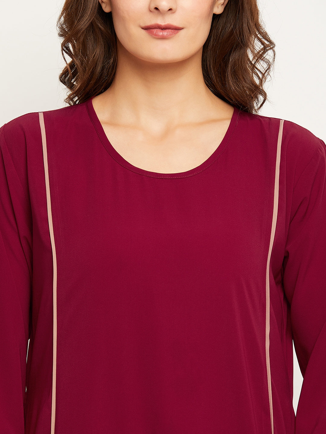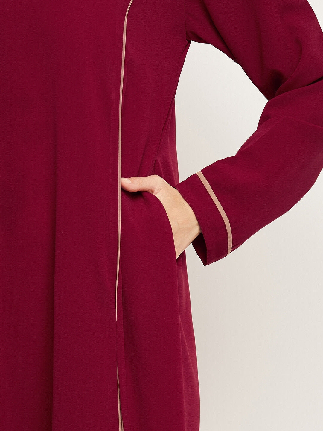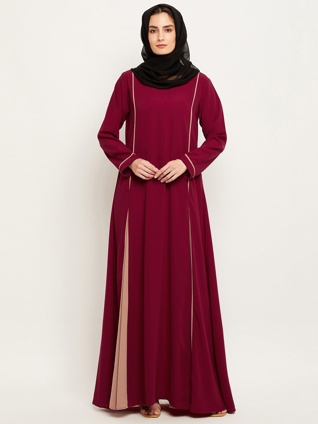 The Nabia A-Line beige and maroon color combination abaya for women features elegant contrast beige piping on the sleeves and front. Crafted from comfortable Nida Matte fabric, it offers both style and practicality with convenient side pockets. This abaya is a perfect blend of fashion and utility.
