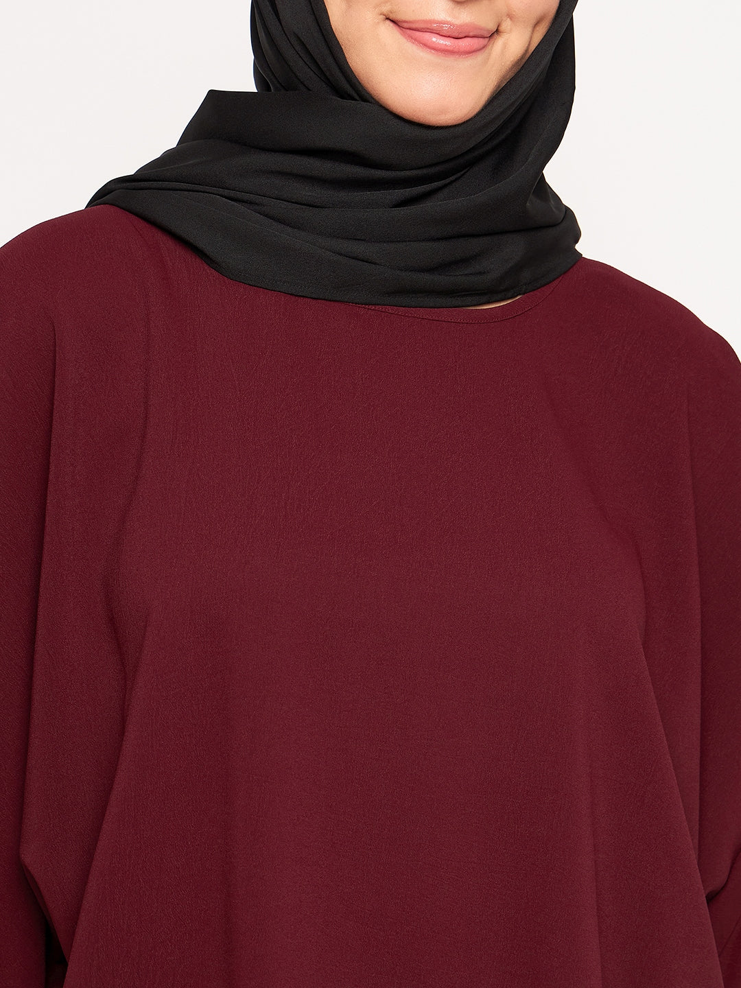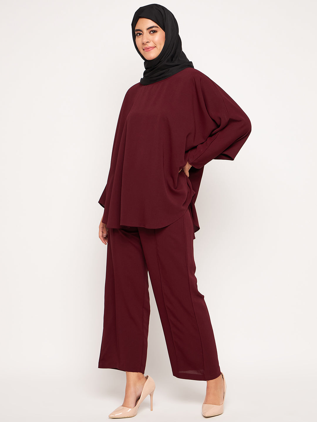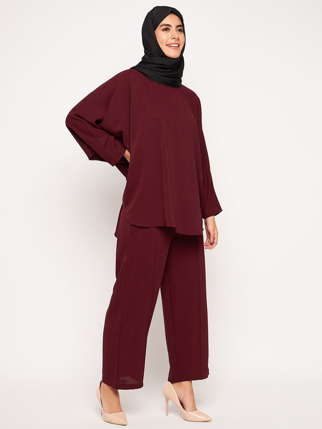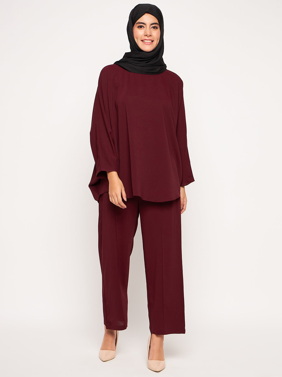 The Nabia Modest Matching Set combines a full-sleeved top with wide-leg pants, both made from premium maroon solid cy crush fabric. This ensemble strikes the perfect balance between style and modesty, offering a comfortable and fashionable option. Ideal for those embracing modest fashion, it allows for a modestly elegant and stylish look