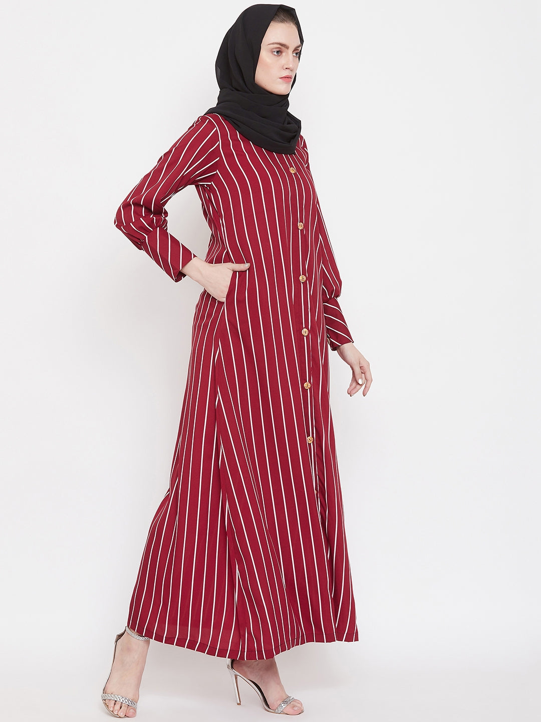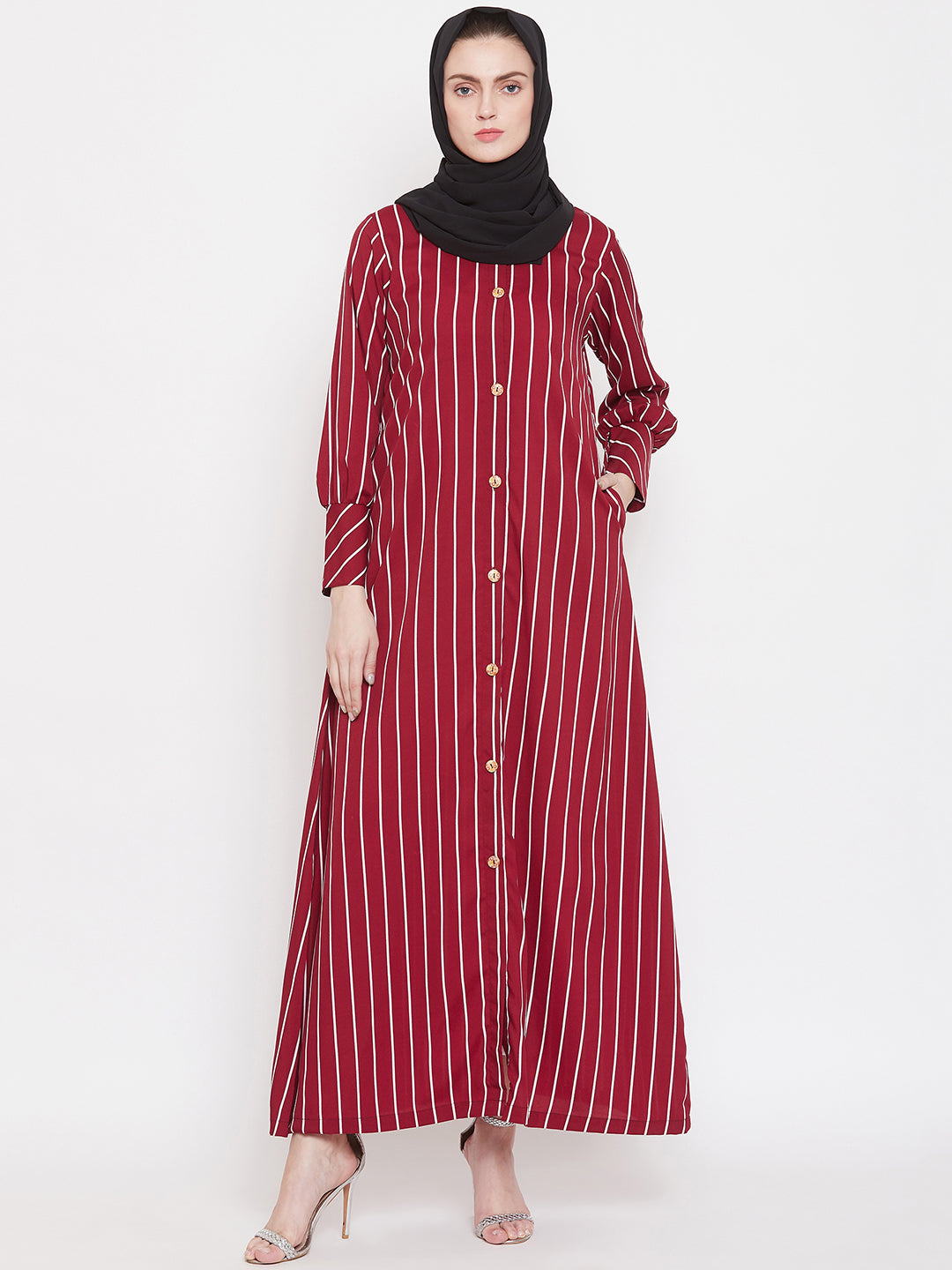Stripes can never go out of trend. Nabia has a striped abaya design that is very highly appreciated that allows you to make a fashion statement wherever you go. This maroon and white daily wear front open side pocket Abaya dress is an enduring addition to your wardrobe collection.
