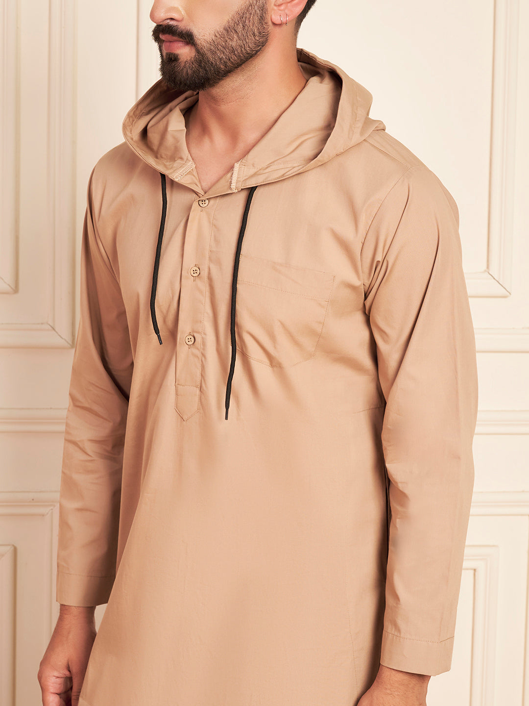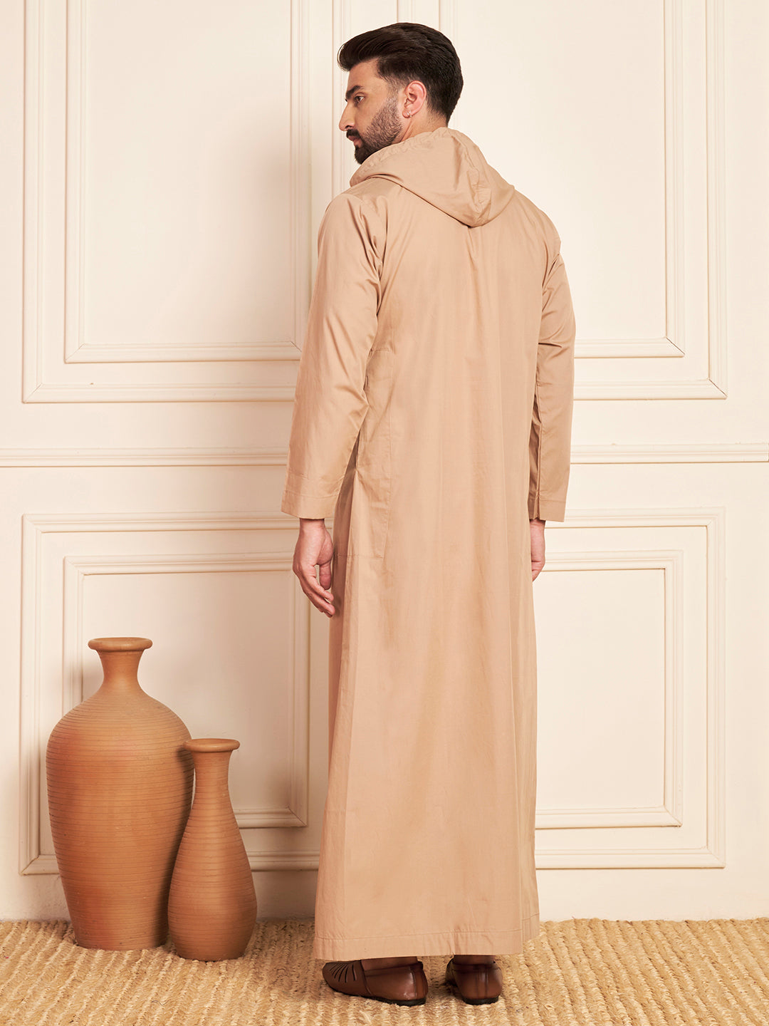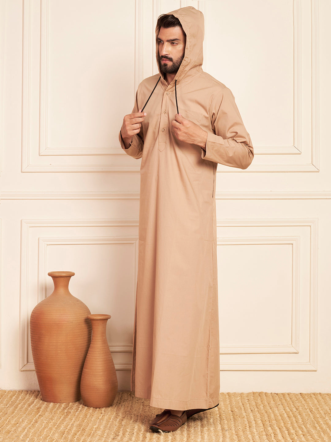 Look elegant and stay comfortable with this beige thobe featuring a smart hooded design. The soft fabric and relaxed fit make it perfect for daily wear, casual gatherings, or religious occasions. The attached hood with drawstrings and front button placket gives this traditional outfit a modern touch.