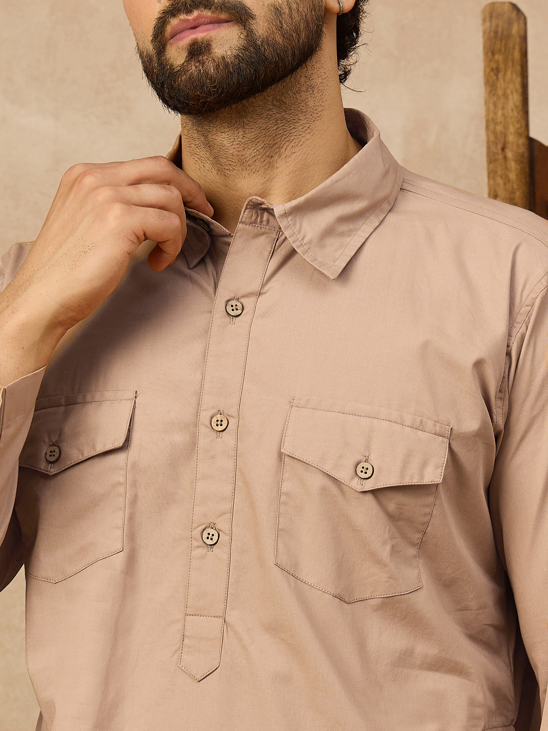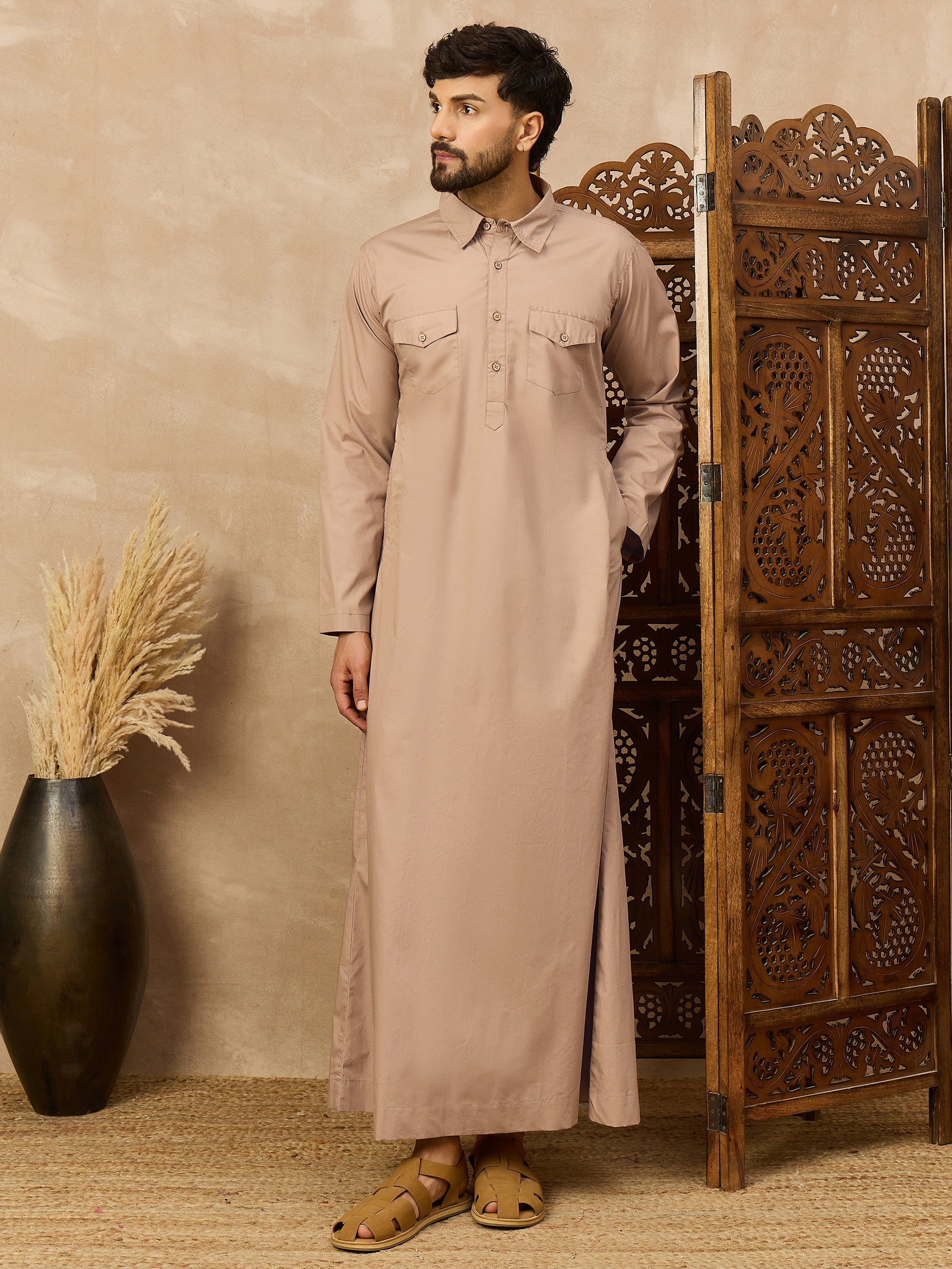 Blend classic style with traditional comfort in this light beige thobe for men. Featuring a shirt-style collar and two flap chest pockets, this long robe offers a smart, semi-casual look ideal for both daily wear and special gatherings. Made from soft, breathable fabric, it ensures comfort all day long while keeping you stylish and modest.