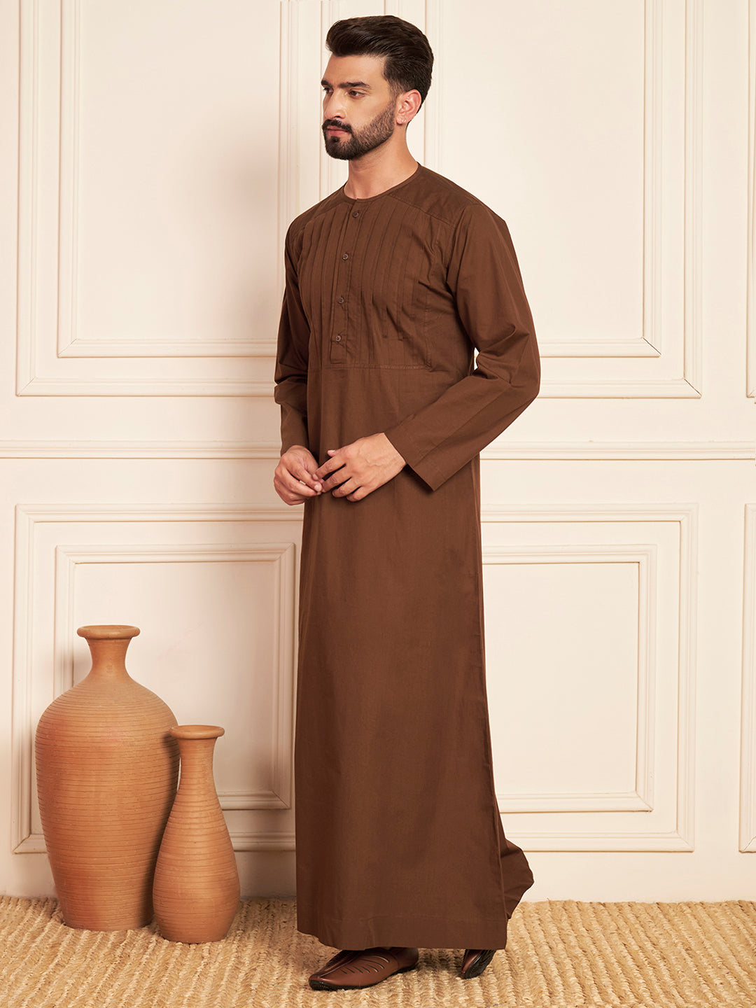 Elevate your modest wardrobe with this brown men’s pleated thobe, crafted from soft, breathable cotton fabric for all-day comfort. Designed with long sleeves, a button-down front, and functional side pockets, this Islamic men’s robe offers both style and practicality. The elegant pleated design adds a refined touch, making it suitable for daily wear, Jummah prayer, mosque visits, Ramadan, Eid, and special religious occasions.