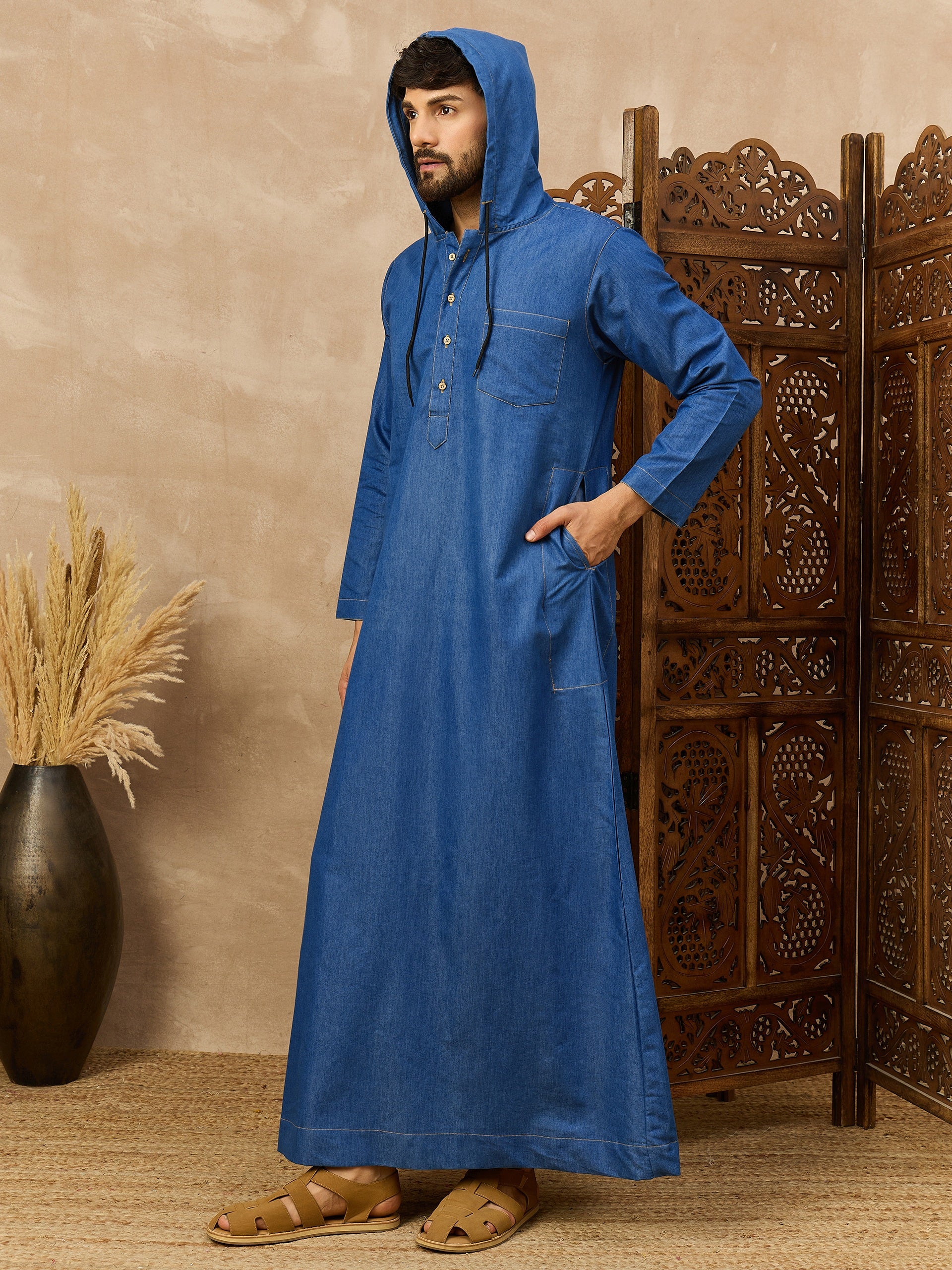 Add a modern touch to your modest wear with this denim blue hooded thobe. Designed with a relaxed fit, it features a stylish hood, a chest pocket, and a convenient side pocket. The soft denim-look fabric offers comfort, making it ideal for casual and daily wear.