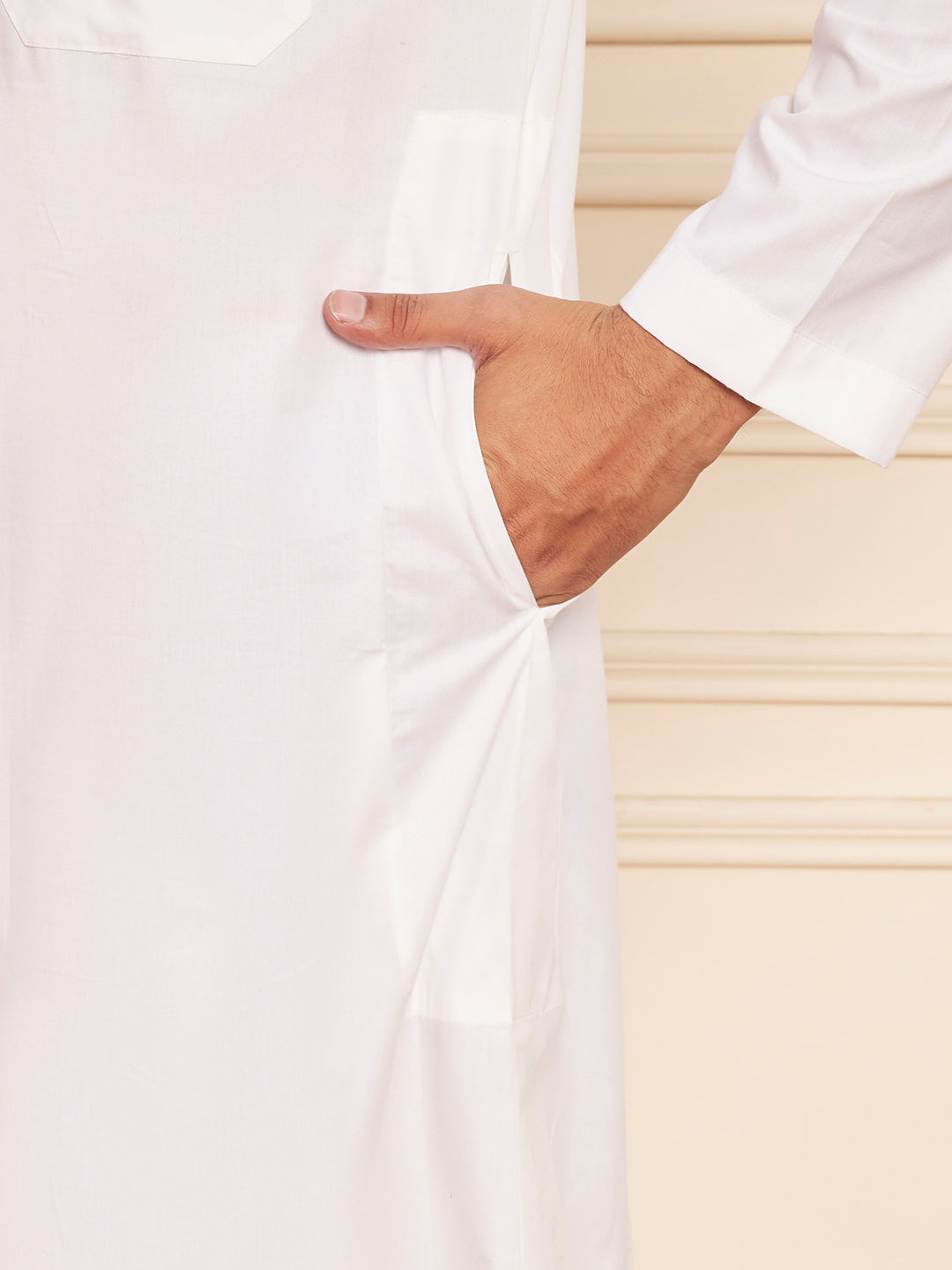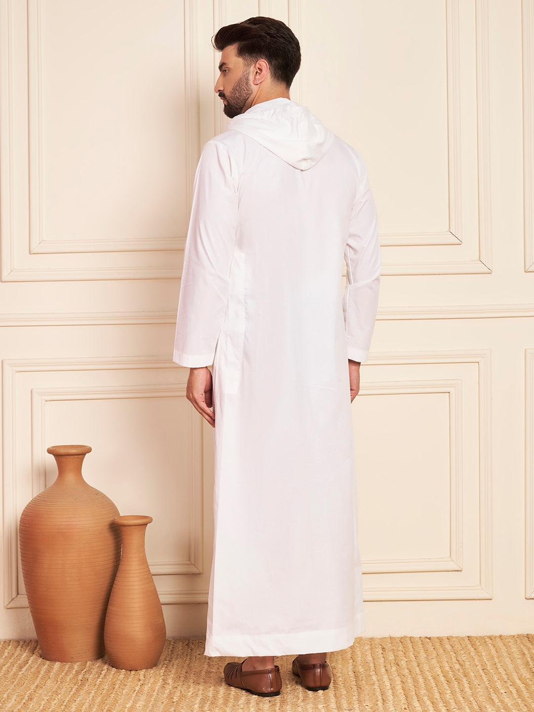 Look elegant and stay comfortable with this white thobe featuring a smart hooded design. The soft fabric and relaxed fit make it perfect for daily wear, casual gatherings, or religious occasions. The attached hood with drawstrings and front button placket gives this traditional outfit a modern touch.