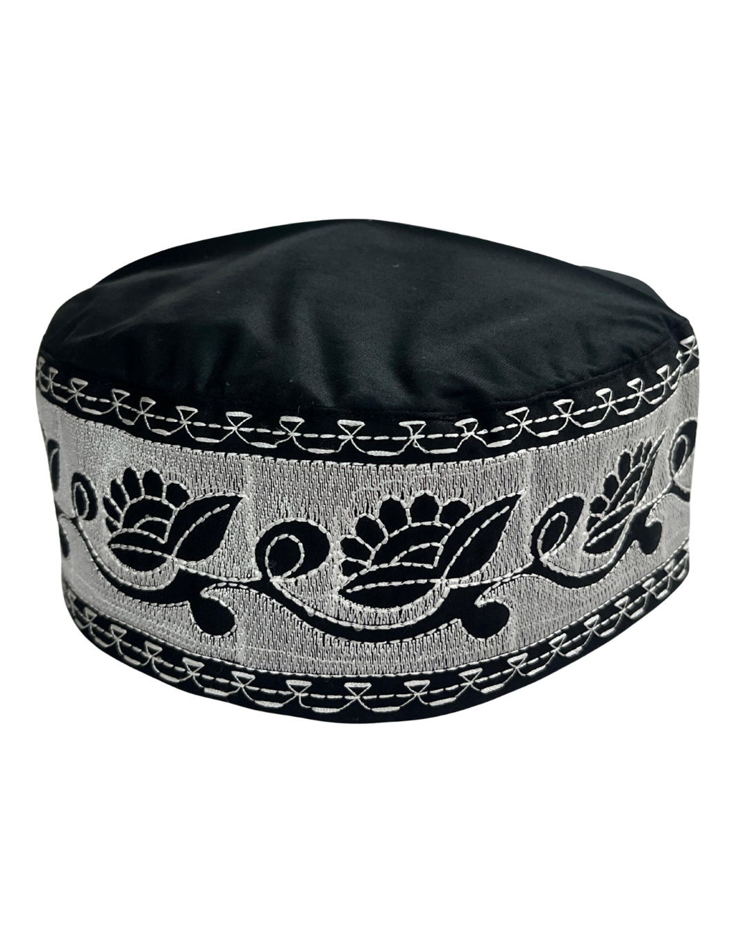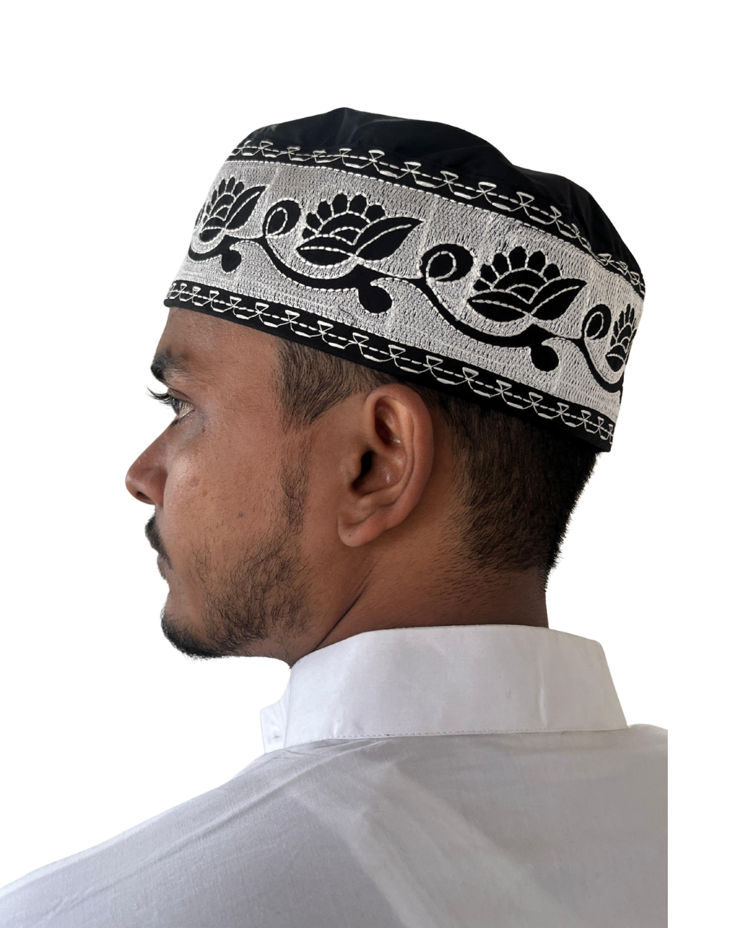 Elevate your traditional look with this black embroidered cotton kufi cap for Muslim men. Crafted from soft and breathable cotton, it features elegant silver and black floral embroidery along the border for a refined touch. Perfect for Islamic wear, daily prayers, Jummah, Eid, Ramadan, or mosque visits, this prayer cap ensures comfort and timeless style.