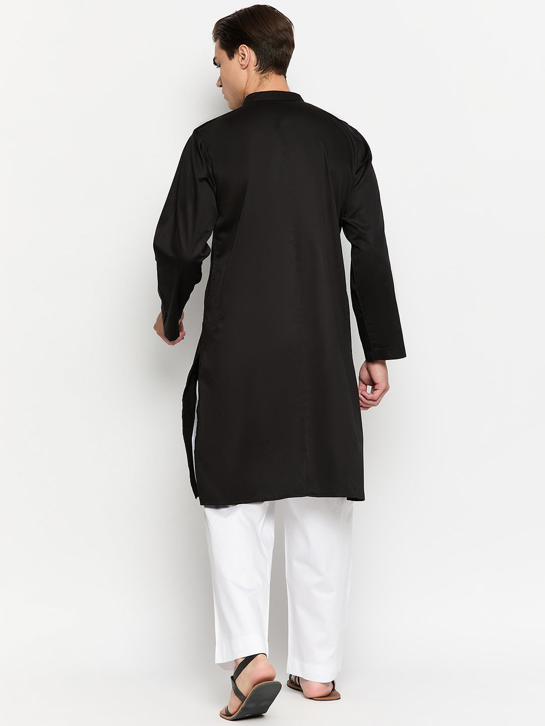 This men's black solid kurta features intricate embroidery on the side placket, long sleeves, and a mandarin collar. Designed for a loose fit and equipped with side pockets for convenience, it combines modern style with traditional elements. Made from soft cotton fabric, it's perfect for comfortable, everyday wear.