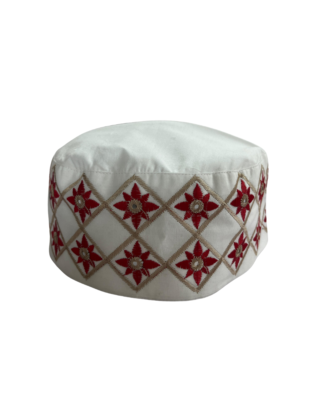 Enhance your traditional attire with this elegant white embroidered cotton kufi cap for Muslim men. Crafted with intricate red and gold floral embroidery in diamond patterns, it offers both style and cultural elegance. Lightweight, breathable, and comfortable, this Islamic prayer cap is perfect for daily Salah, Jummah, Eid, Ramadan, and other religious or special occasions.