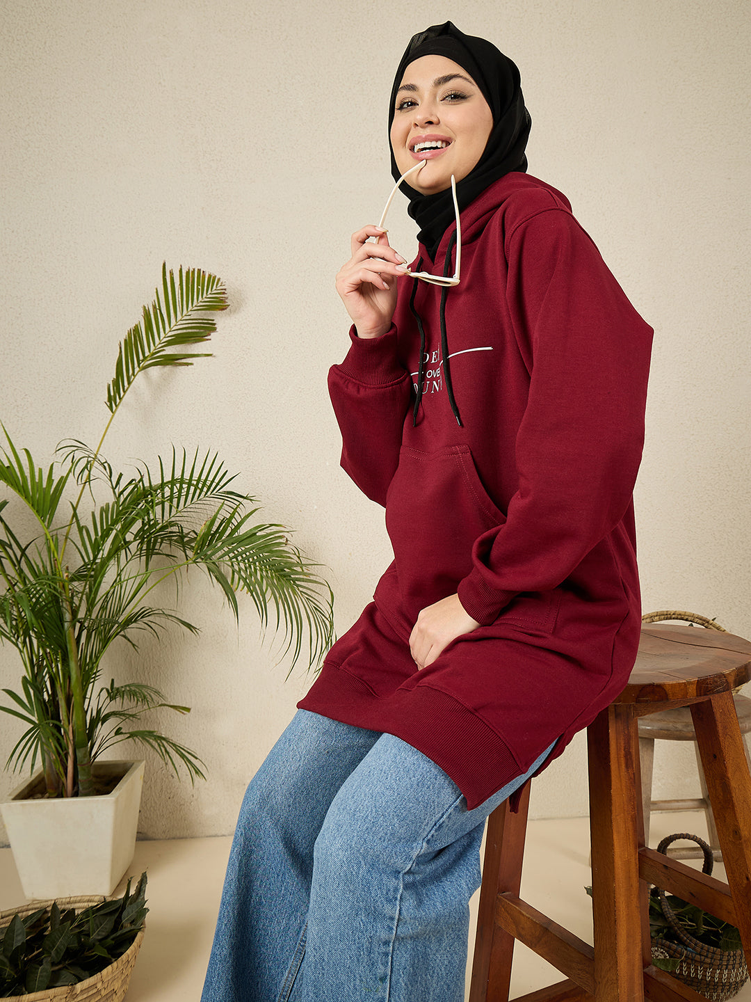 Stay cozy and covered this winter with this maroon solid fleece hoodie for women. Crafted from ultra-soft premium fleece, this longline, full-length hoodie delivers superior warmth and all-day comfort. Designed with an easy slip-on style, protective hood, roomy pockets, and relaxed long sleeves, it’s ideal for winter layering. Perfect for casual wear, office, college, travel, and everyday modest fashion—your go-to modest winter hoodie for women.
