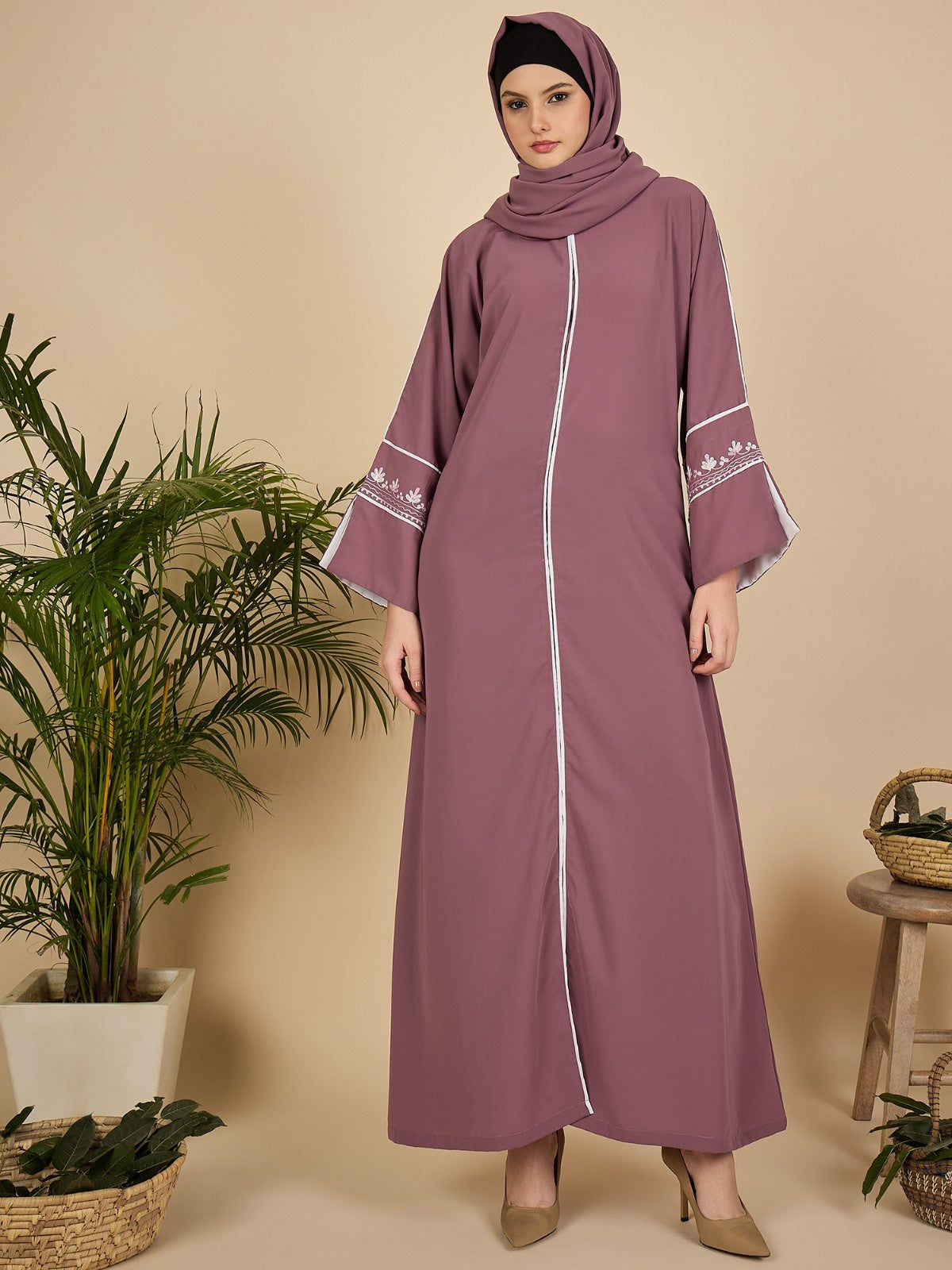 Elevate your modest wardrobe with this puce pink embroidered abaya burqa for women, designed for Muslim and Islamic women who appreciate elegance and comfort. Crafted from premium Nida matte fabric, it showcases delicate embroidery on the sleeves with stylish white piping on the neck, front, and sleeves for a refined contrast. Featuring bell long sleeves, a secure button closure, and a relaxed fit, this modest embroidered abaya is perfect for daily wear, prayer, gatherings, and special occasions.