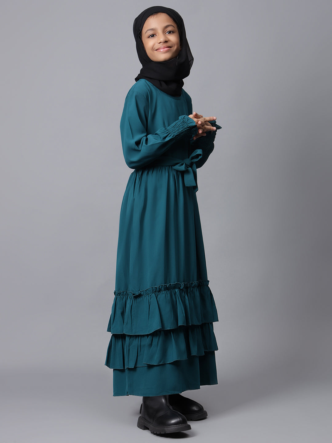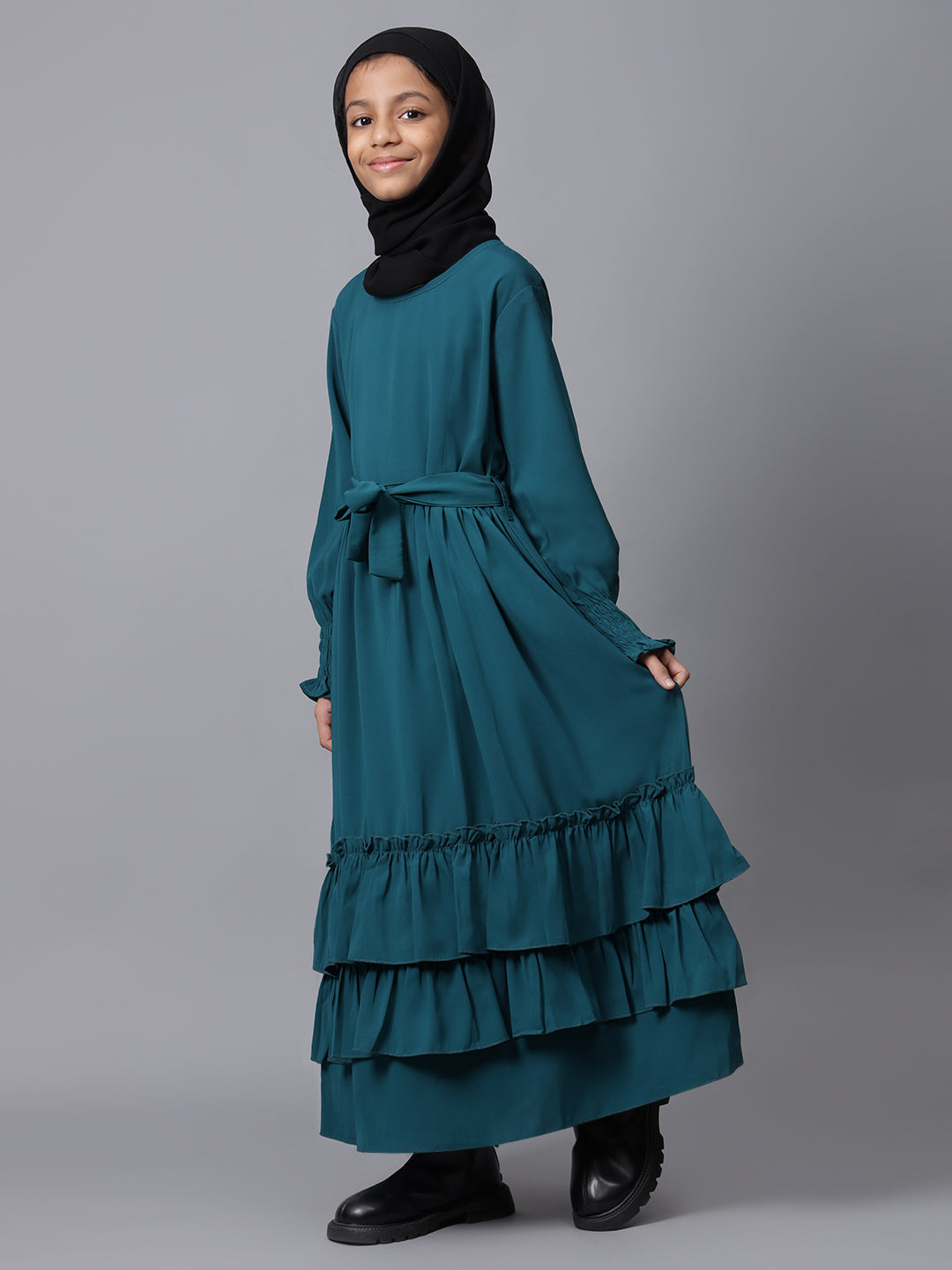 This bottle green solid Abaya for Muslim girls features charming frills and an attached belt, blending modesty with the latest fashion trends. Designed for a stylish yet comfortable fit, it ensures your child looks fashionable while maintaining modesty. Perfect for various occasions, this Abaya offers a modern touch with timeless elegance.