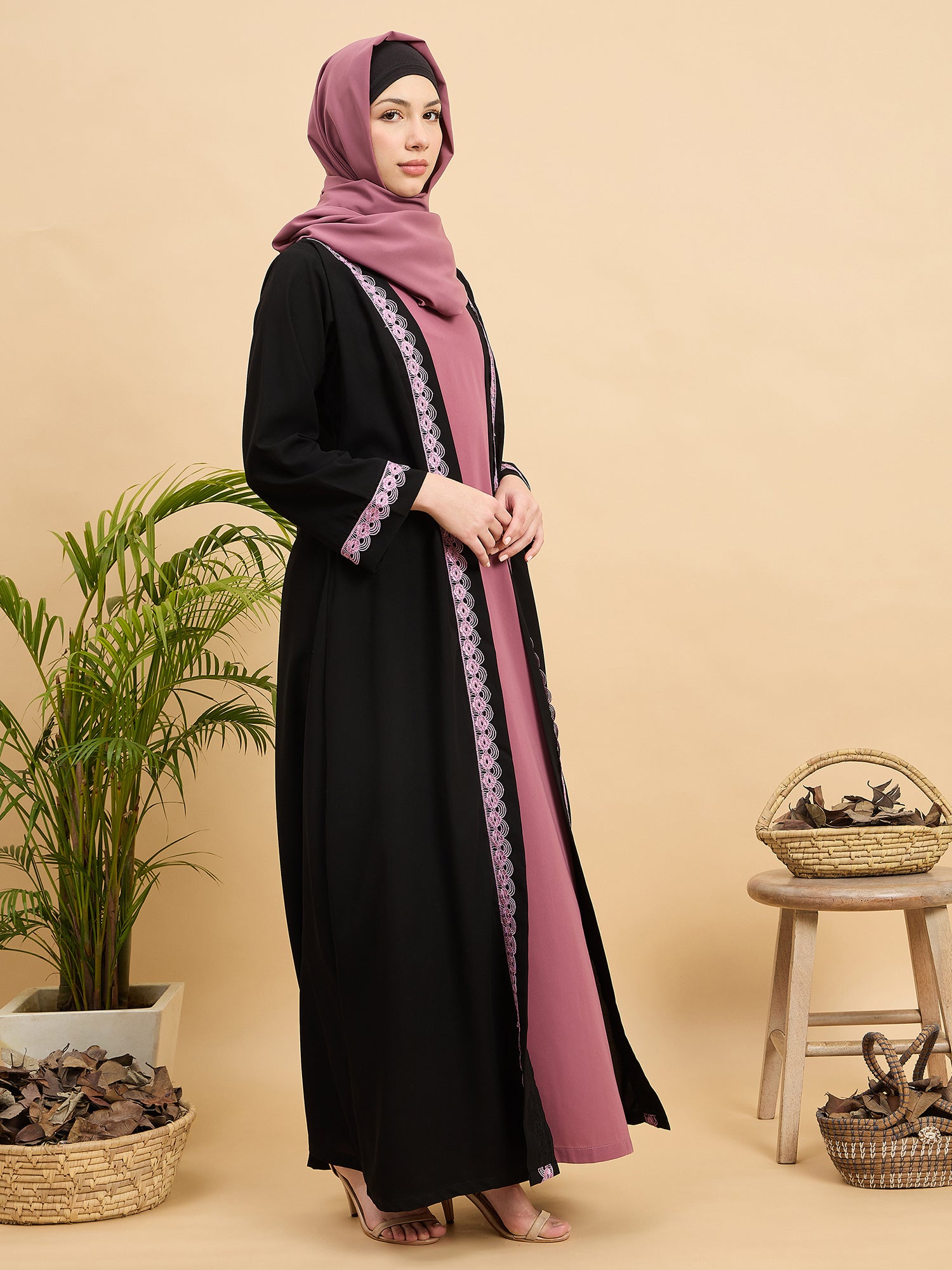 Upgrade your modest wardrobe with this elegant black abaya burqa for Islamic and Muslim women. Made from premium nida matte fabric, it offers a soft, breathable, and flowy drape for lasting comfort. The inner attached design with delicate lace detailing adds refined elegance. Perfect for daily wear, office, prayers, Ramadan, Eid, and formal occasions, it blends timeless modest fashion with graceful style.
