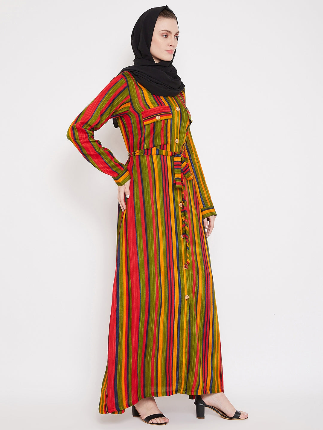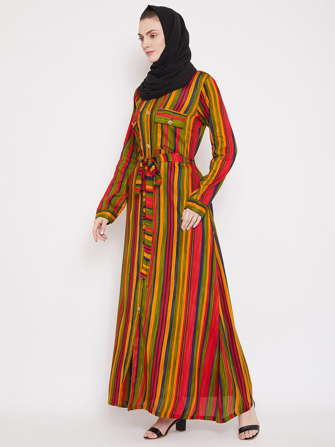 Stripes can never go out of trend. Nabia has a striped abaya design that is very highly appreciated that allows you to make a fashion statement wherever you go. This multi colours daily wear front open, shirt collar, long cuffed sleeves and 2 front pockets Abaya dress with waist belt is an enduring addition to your wardrobe collection.