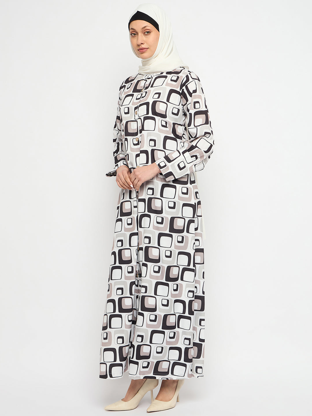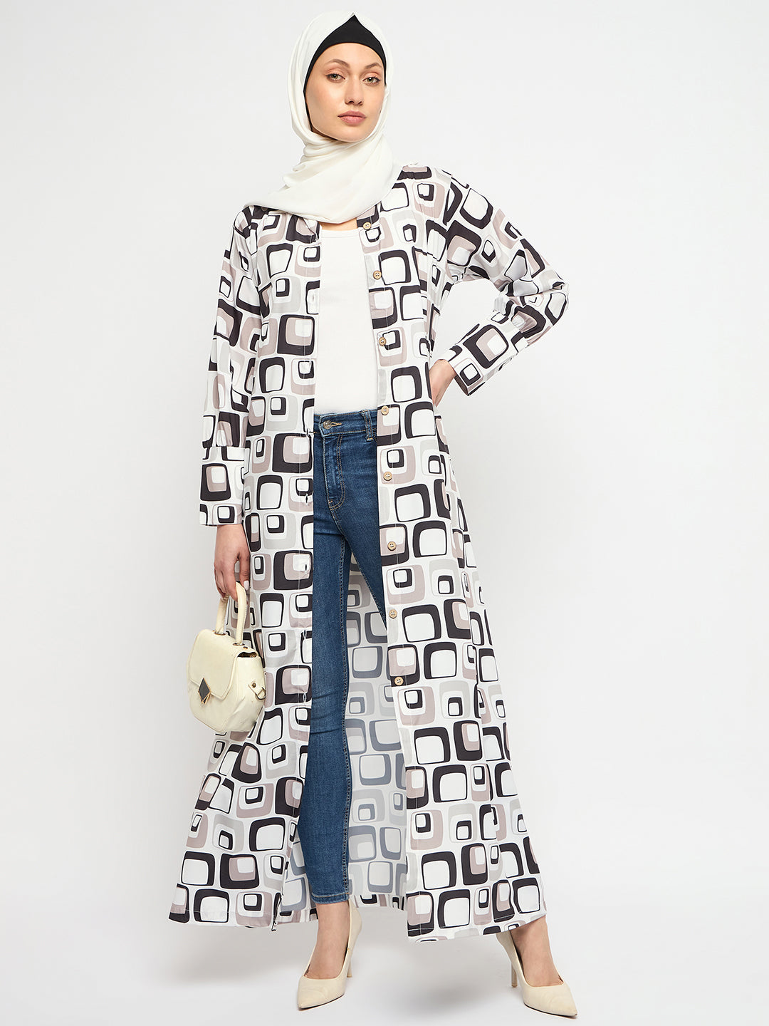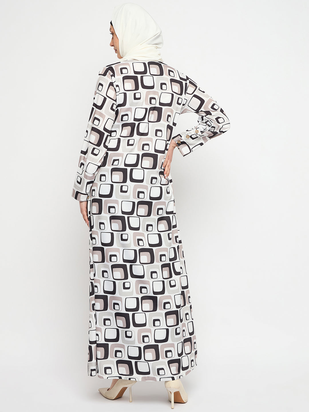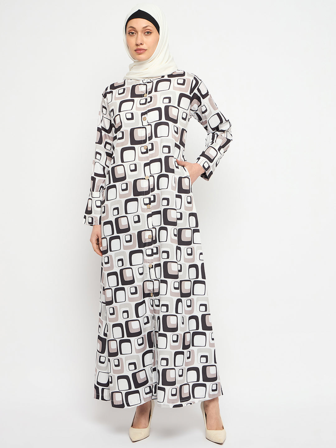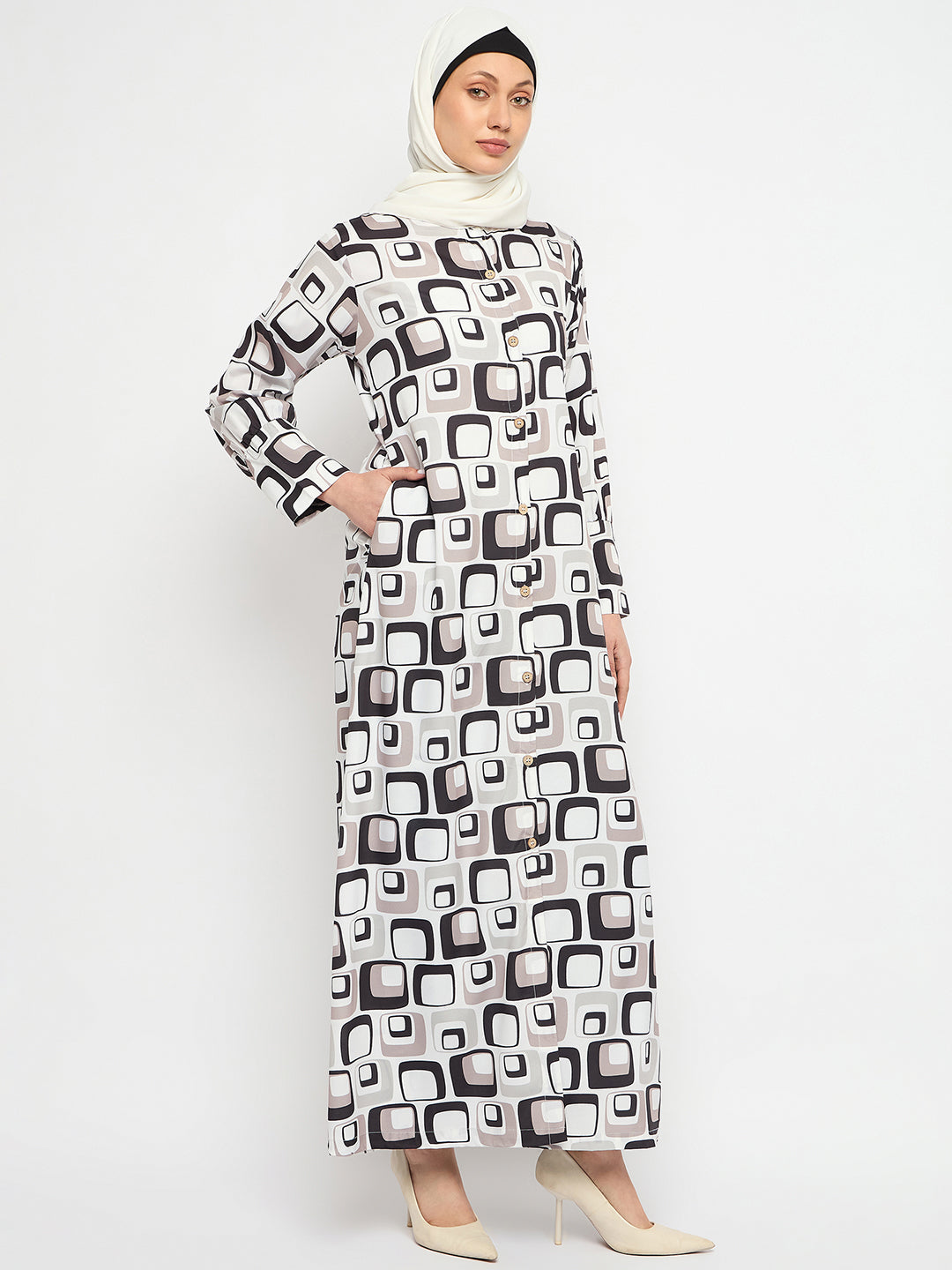 Printed can never go out of trend. Nabia has a printed abaya design that is very highly appreciated that allows you to make a fashion statement wherever you go. This multi-colored daily wear front open side pocket Abaya dress is an enduring addition to your wardrobe collection.