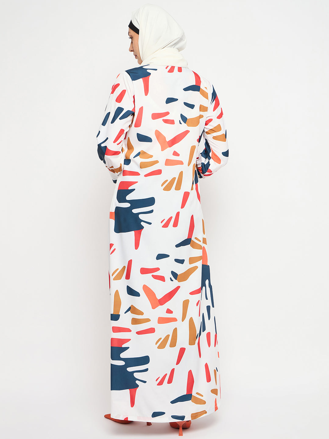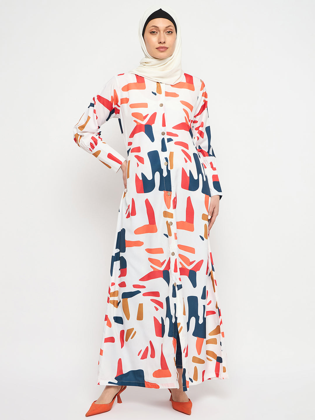 Printed can never go out of trend. Nabia has a printed abaya design that is very highly appreciated that allows you to make a fashion statement wherever you go. This multicolored daily wear front open side pocket Abaya dress is an enduring addition to your wardrobe collection.