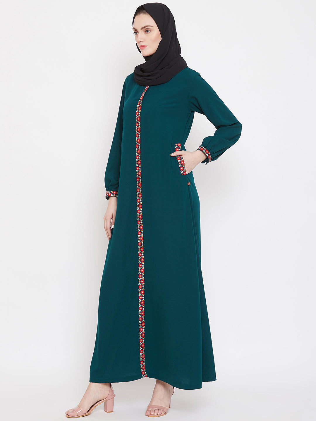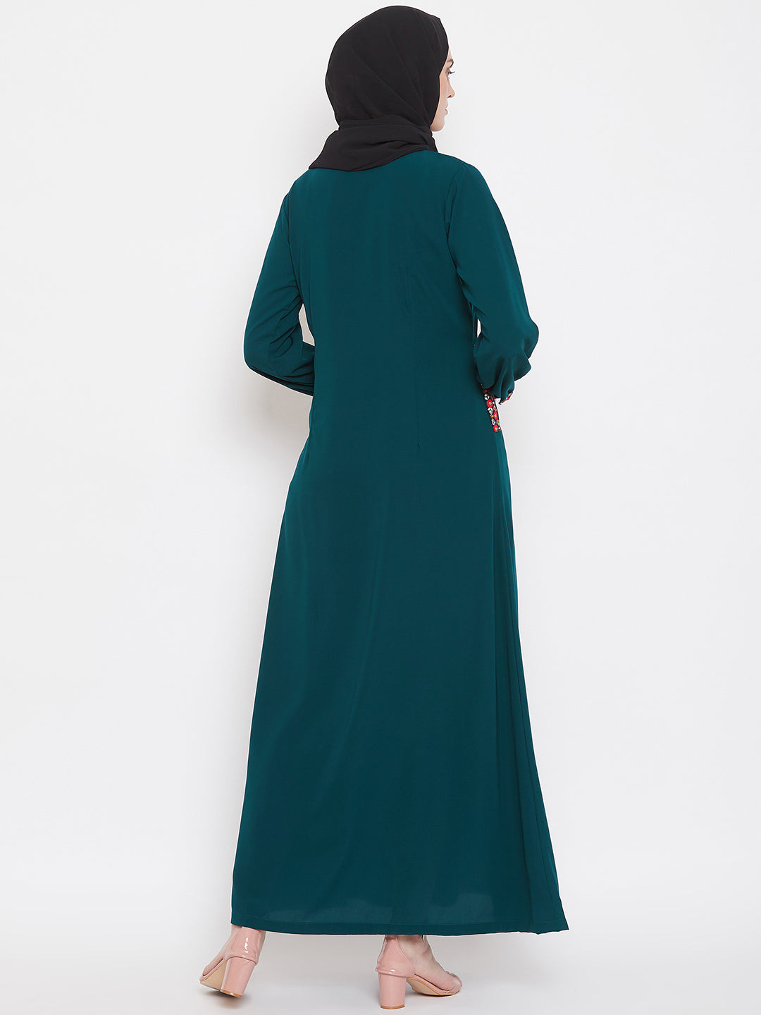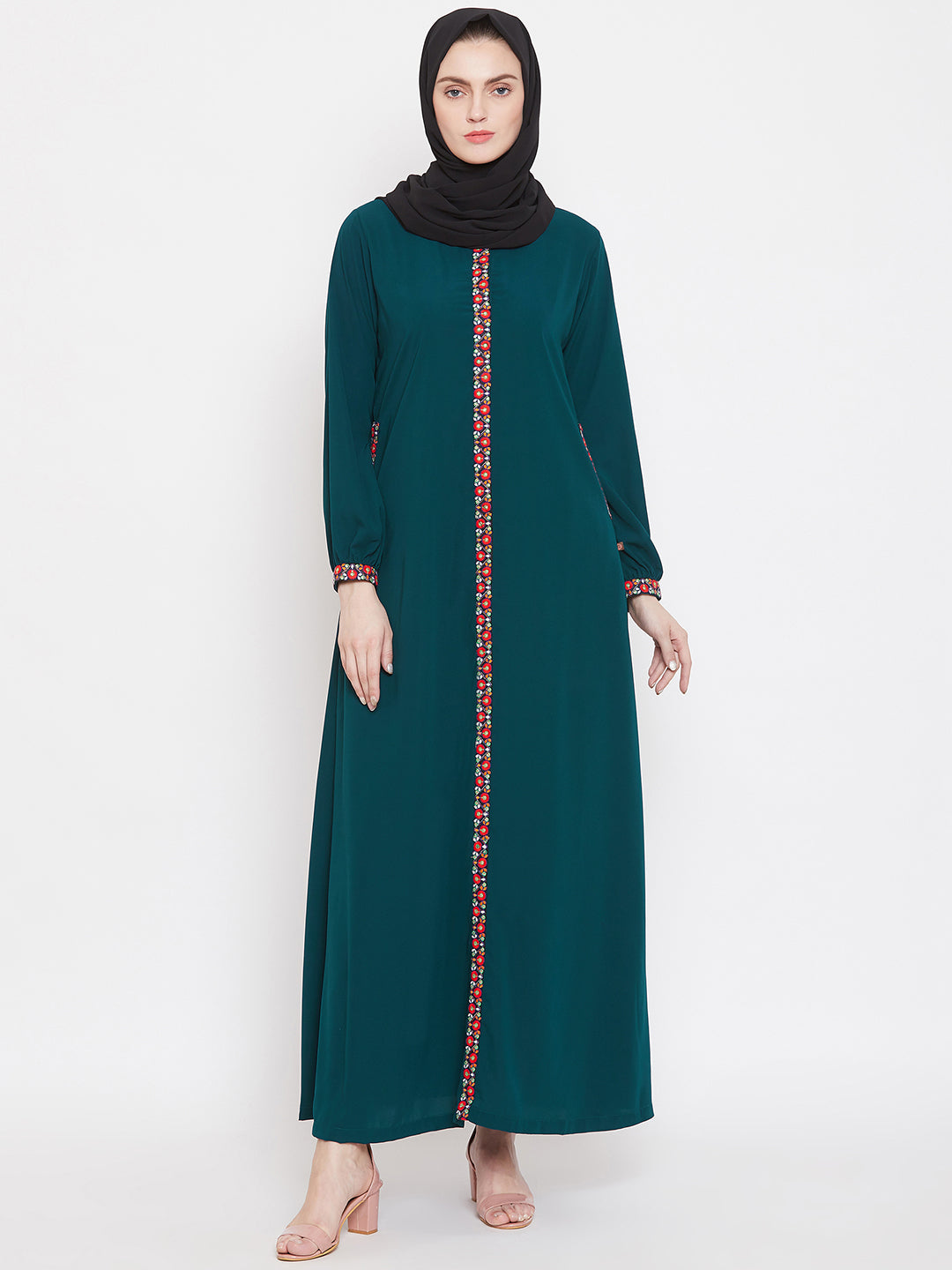 This elegant abaya blends the soft, earthy tones of a bottle green color. Its timeless chikankari hand embroidery at the front, neck and hand edges, along with its modest silhouette, makes it perfect for a special occasion or an everyday statement. The full length, A line fitting abaya is prepared with a fine Nida Matte fabric, giving a comfortable fit.