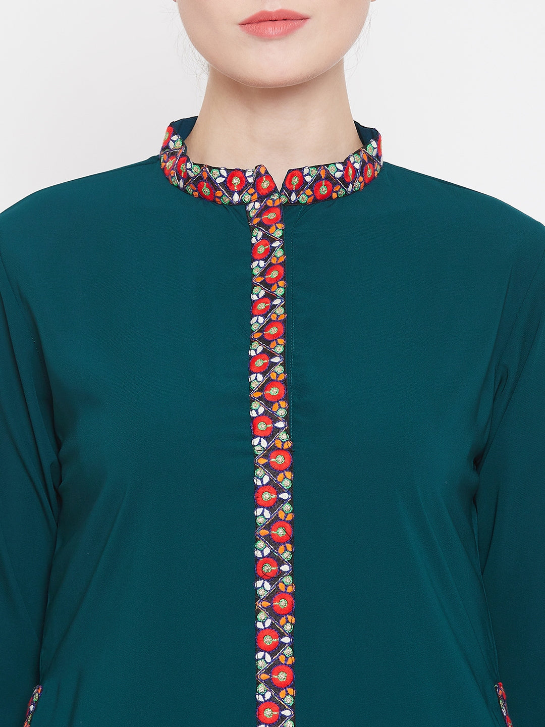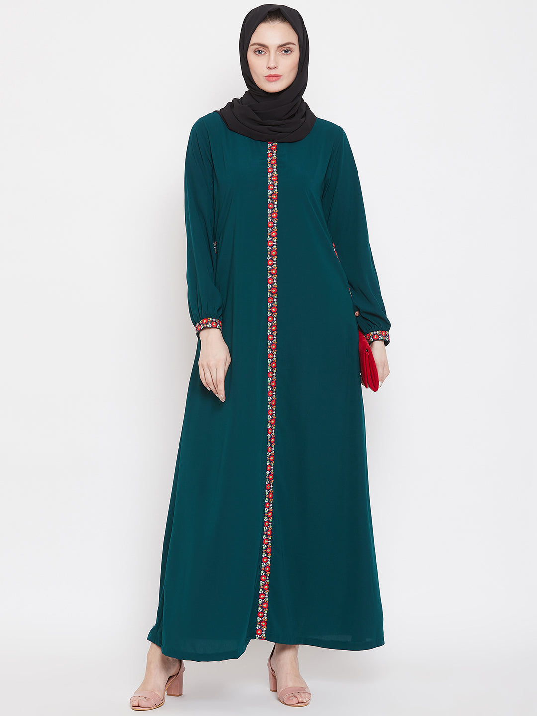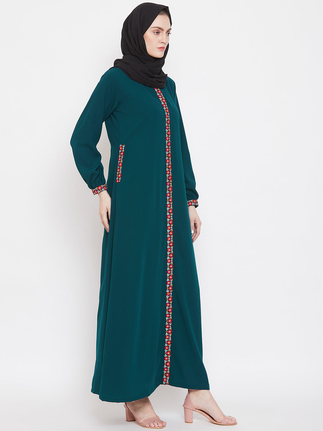 This elegant abaya blends the soft, earthy tones of a bottle green color. Its timeless chikankari hand embroidery at the front, neck and hand edges, along with its modest silhouette, makes it perfect for a special occasion or an everyday statement. The full length, A line fitting abaya is prepared with a fine Nida Matte fabric, giving a comfortable fit.