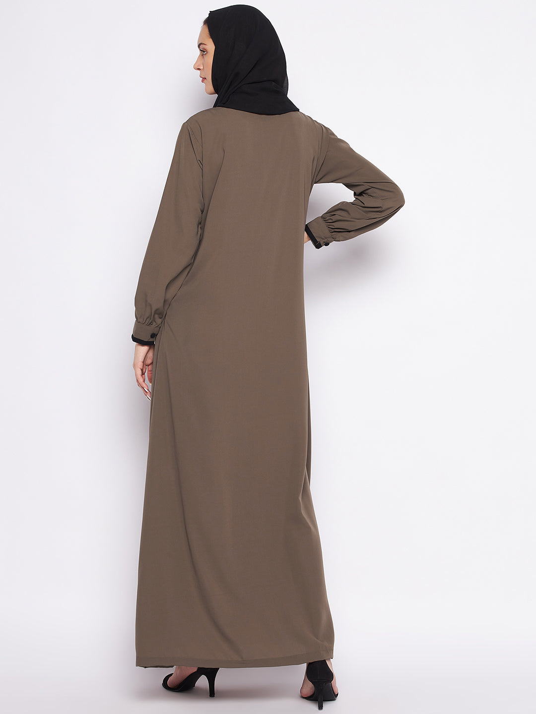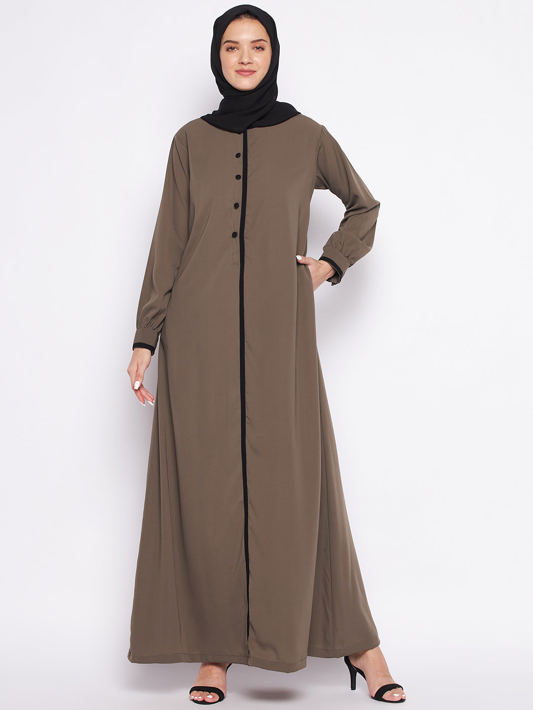 This beautiful Oat Abaya is adorned with delicate piping, long sleeves, and a charming round neck. It is a regular fit which will suit any body type, round neck and is made with comforting ‘Nida Matte’ fabric and has side pockets wherein you can carry your belongings without any worry. The pockets are specially provided to carry stuff which would otherwise require a separate handbag. The Abaya is full length to provide you free movement without hesitation.
