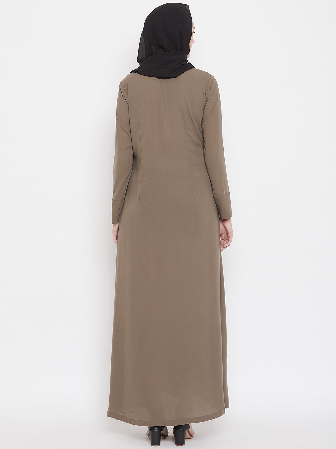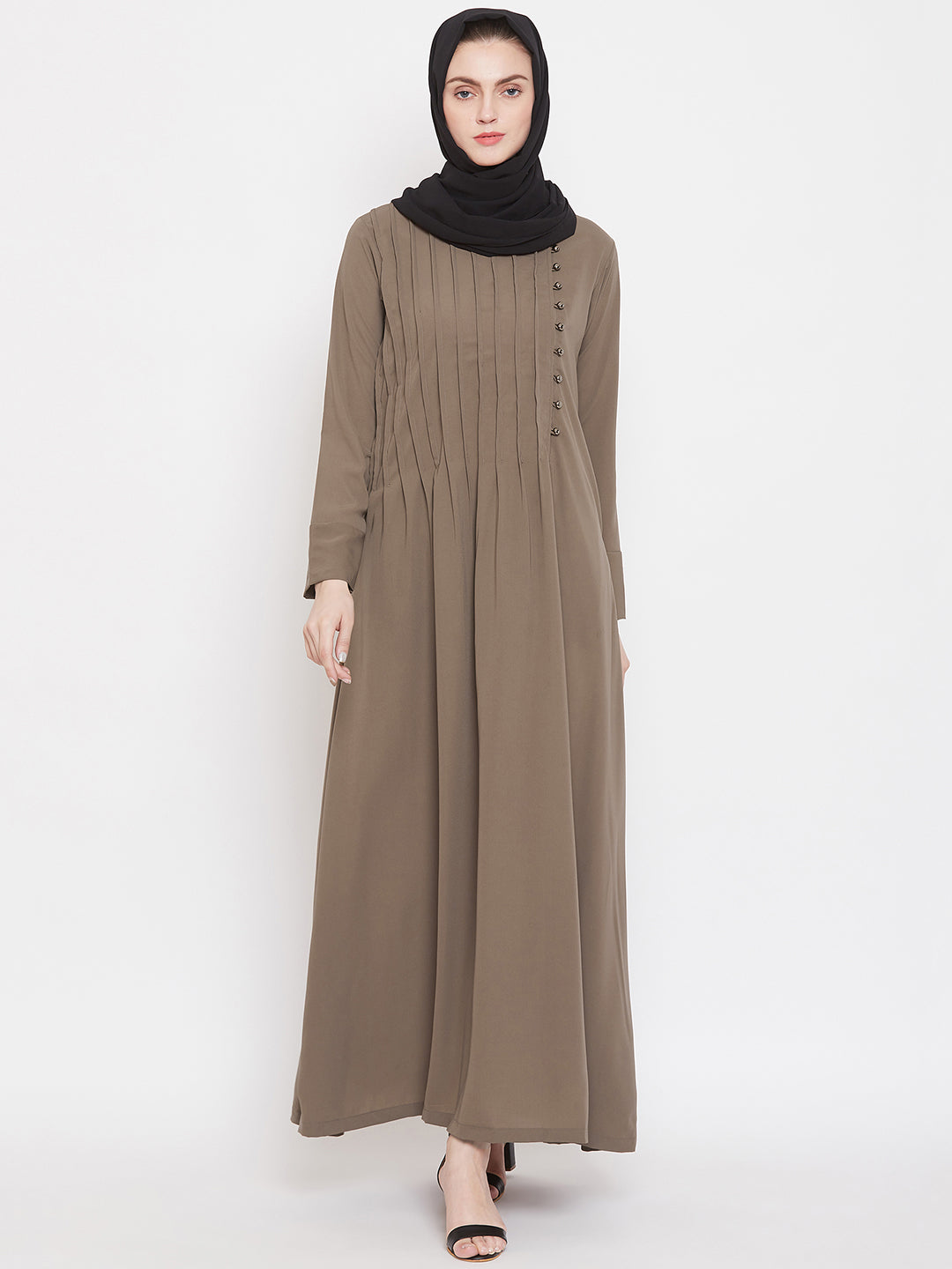 Capture the essence of contemporary fashion in this oat abaya. The round neck and long sleeves abaya is crafted from a Nida Matte fabric. The buttons on the side along with pleats on the front, add a graceful flow to this garment.