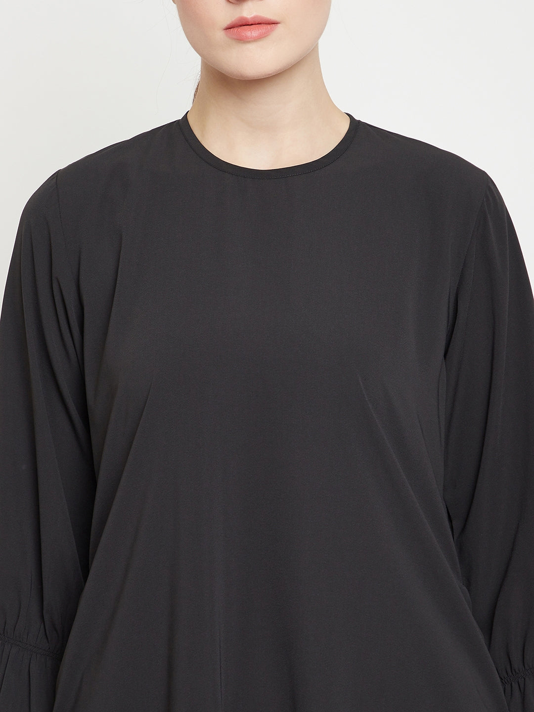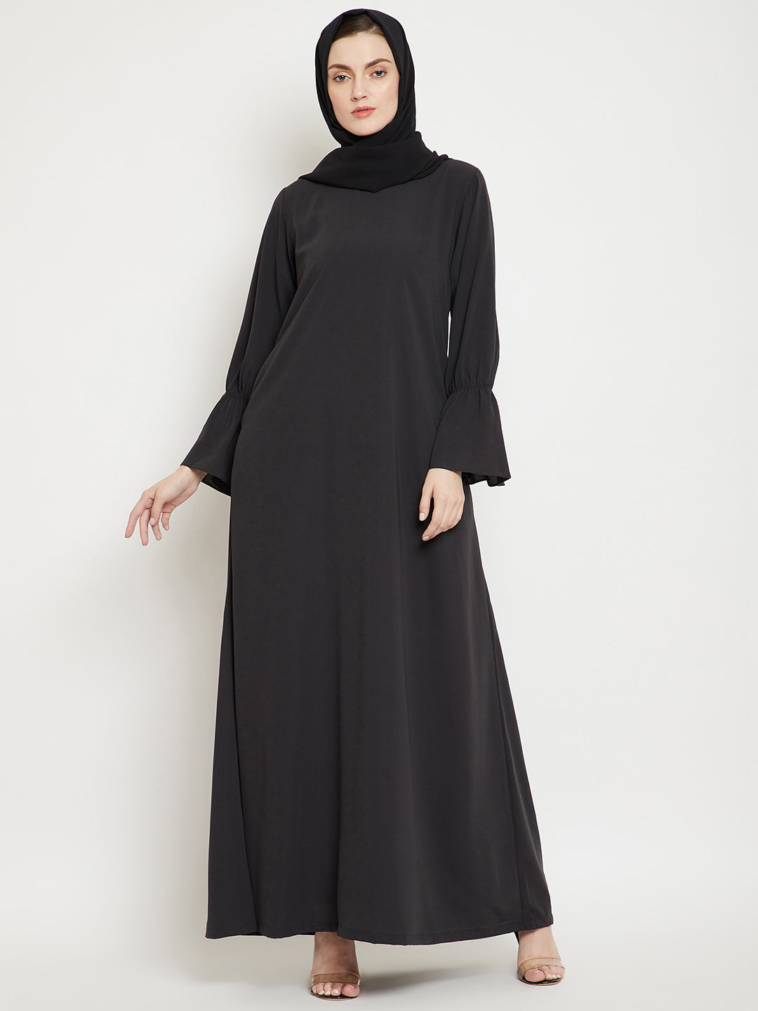 A solid-colored olive black makes a bold fashion statement that effortlessly elevates your look for any occasion. The round neck and long bell sleeves Abaya is crafted from a smooth Nida Matte fabric. While perfect for a casual, everyday style, it also holds its own at various events. This contemporary choice is versatile, allowing you to flaunt it year-round.