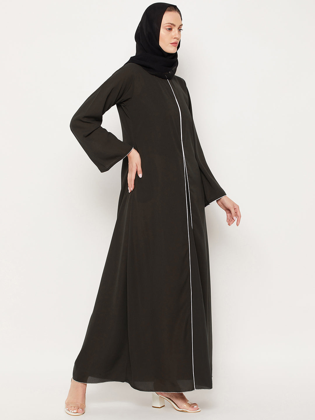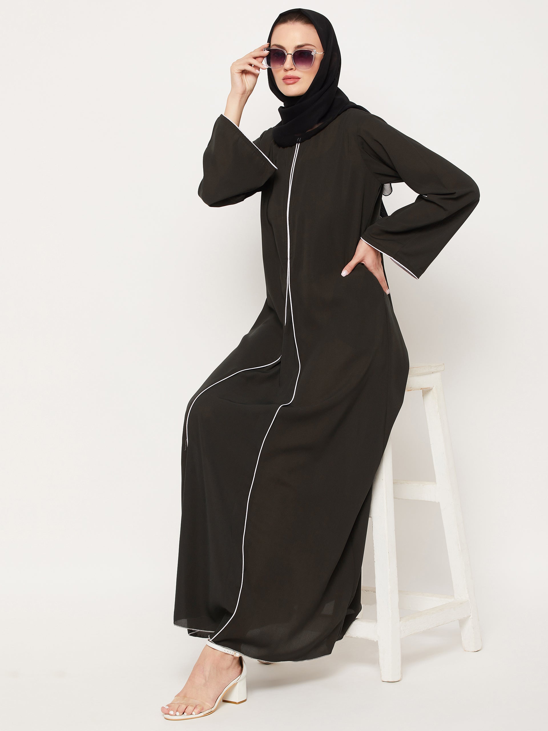 This beautiful Olive Green Abaya is adorned with delicate piping, long sleeves, and a charming round neck. It is a regular fit which will suit any body type, round neck and is made with comforting ‘Nida Matte’ fabric and has side pockets wherein you can carry your belongings without any worry. The pockets are specially provided to carry stuff which would otherwise require a separate handbag. The Abaya is full length to provide you free movement without hesitation.