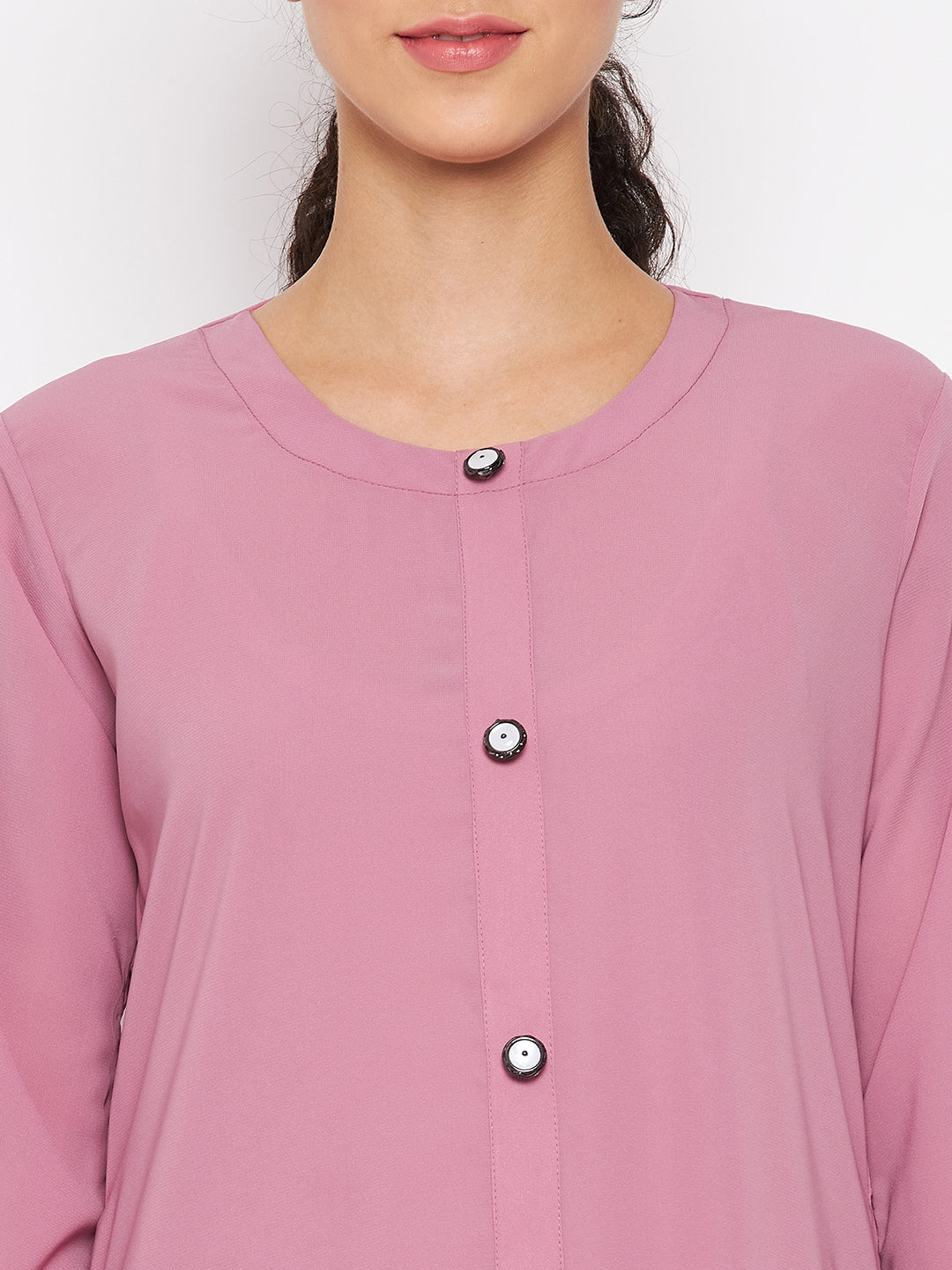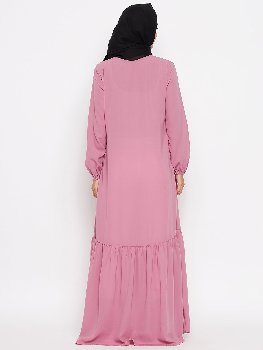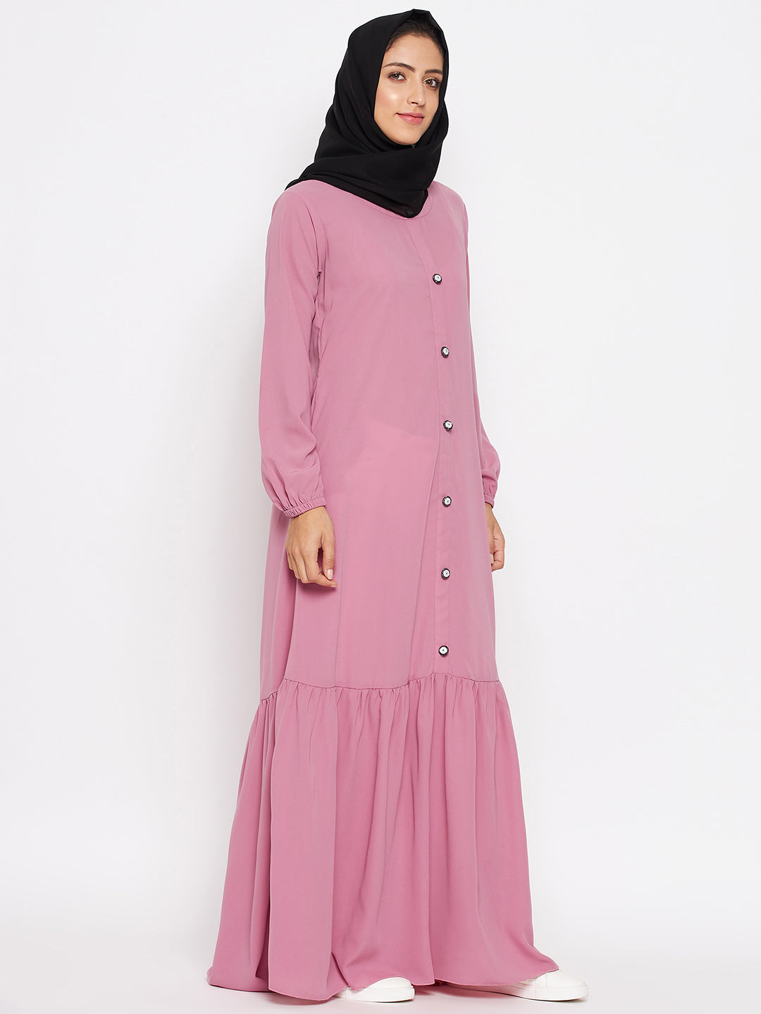 Nabia's Puce Pink Abaya for women is a stylish choice in luxurious Nida Matte fabric. With long sleeves featuring elastic for adjustment and front buttons for enhanced detailing, it combines fashion and comfort seamlessly. This abaya is ideal for modern Muslim women seeking a contemporary yet modest look.