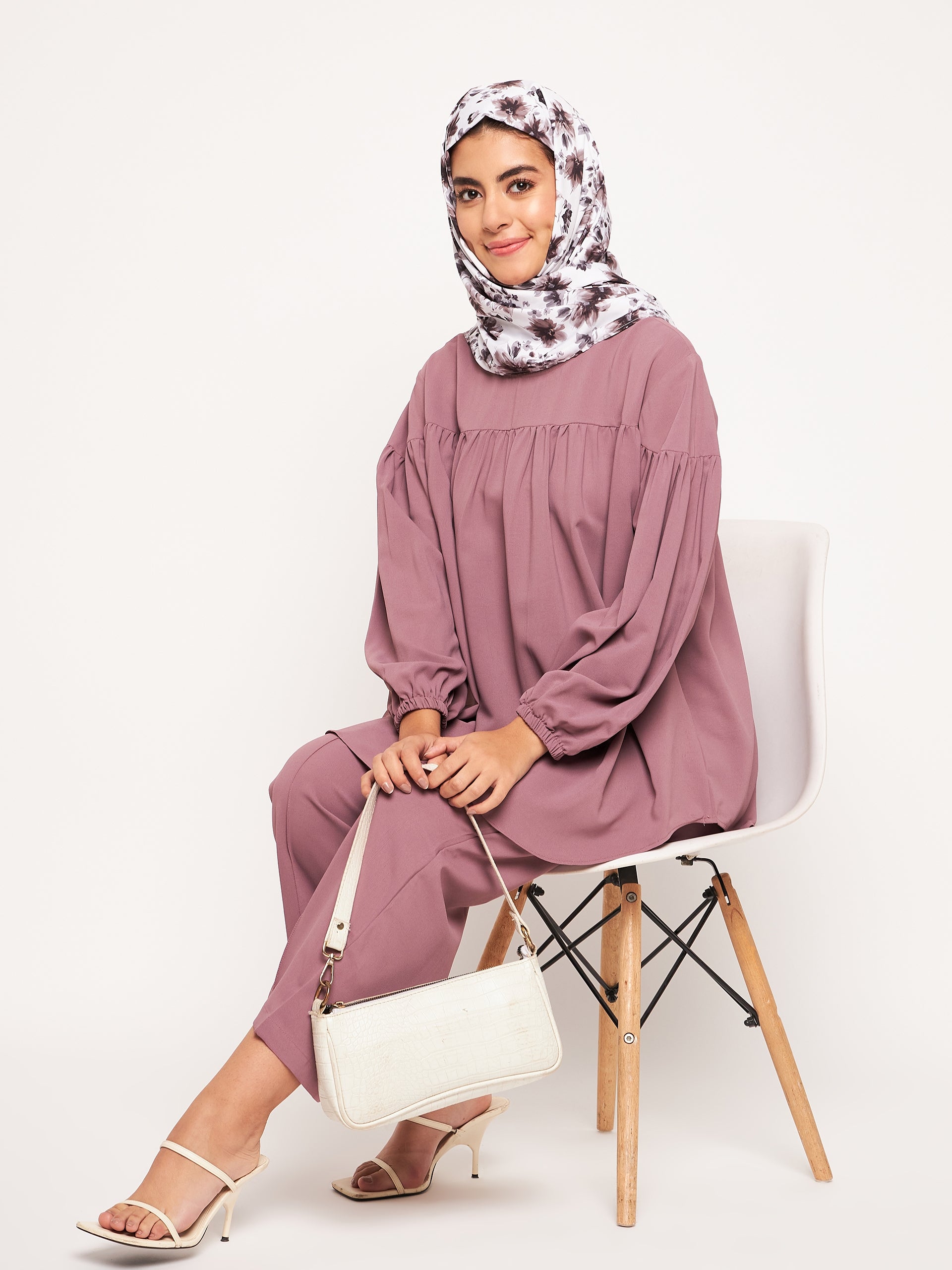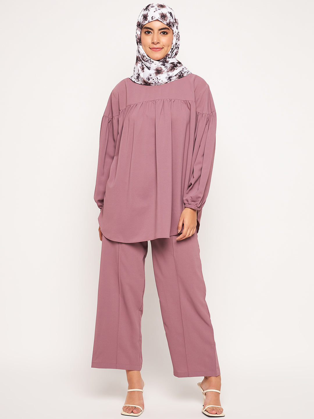 The Nabia Modest Matching Set combines a full-sleeved top with wide-leg pants, both made from premium pink solid cy crush fabric. This ensemble strikes the perfect balance between style and modesty, offering a comfortable and fashionable option. Ideal for those embracing modest fashion, it allows for a modestly elegant and stylish look