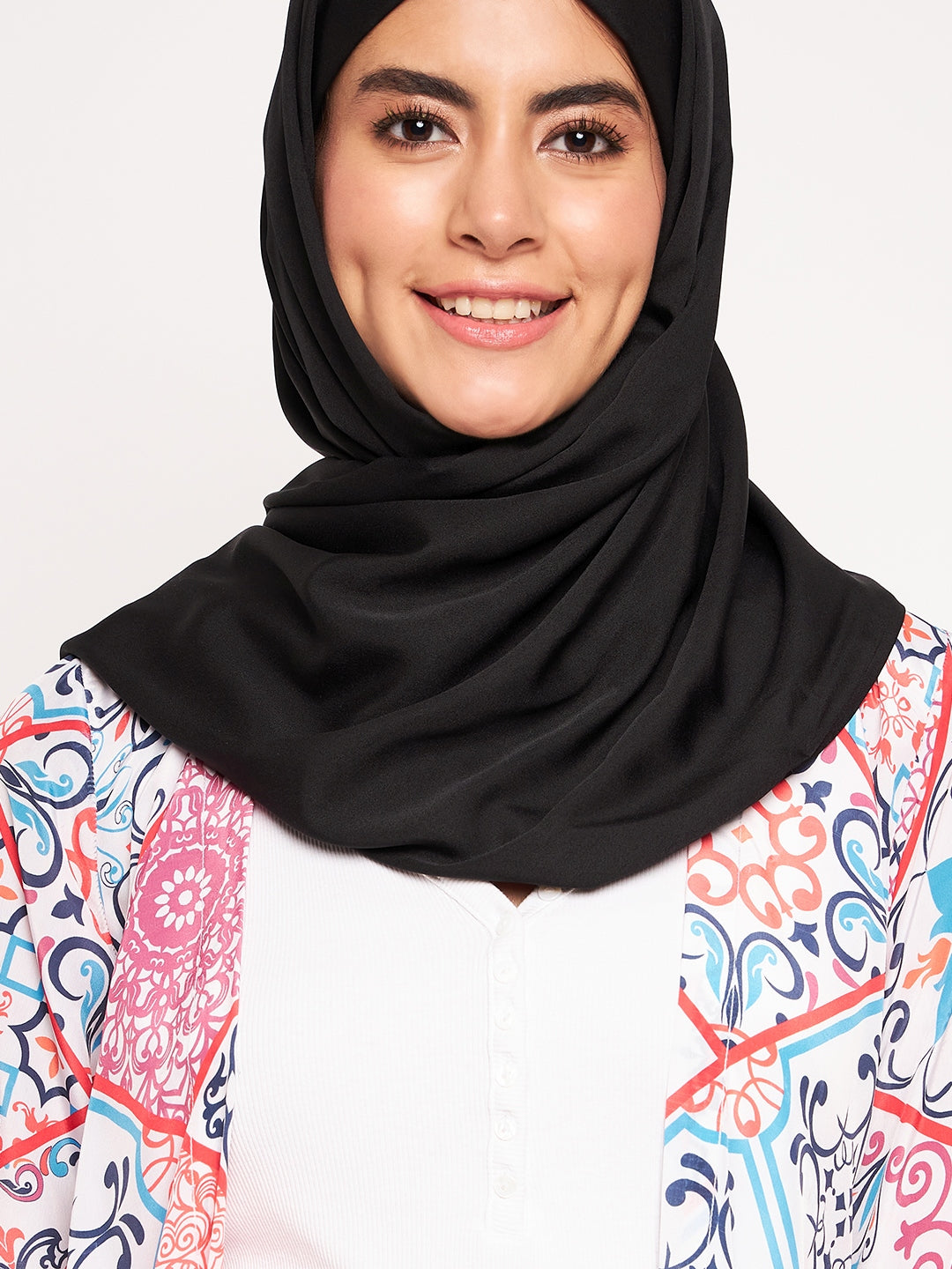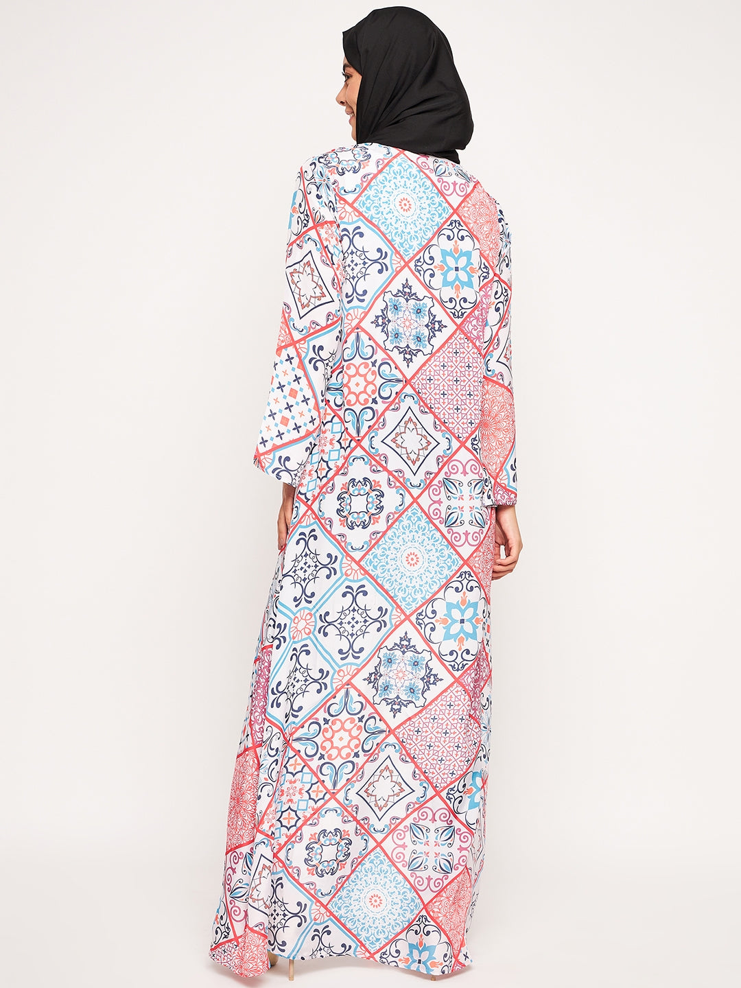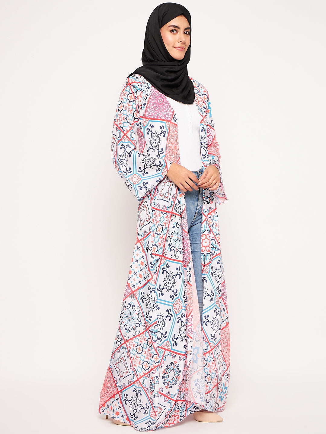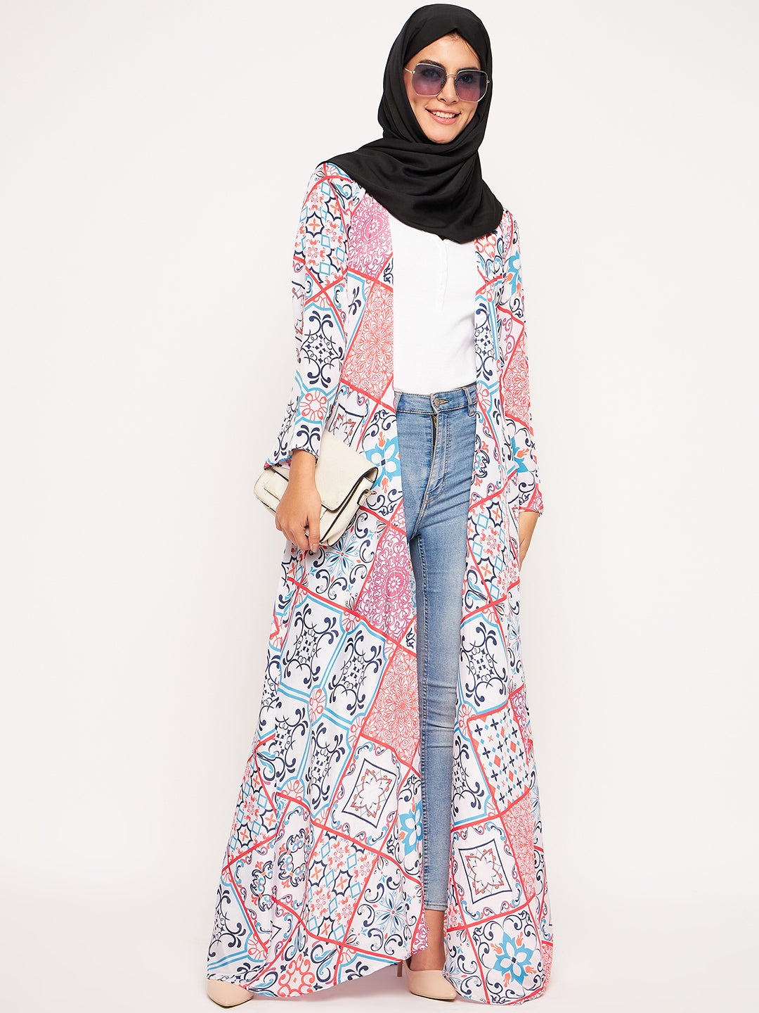 Introducing a vibrant multicolor Printed Front Open Shrug for Islamic and Muslim women. The long and free sleeves, round neck, and loose fit provide a relaxed feel. Crafted from satin fabric, this shrug is a stylish choice for various occasions, blending modesty with contemporary fashion.