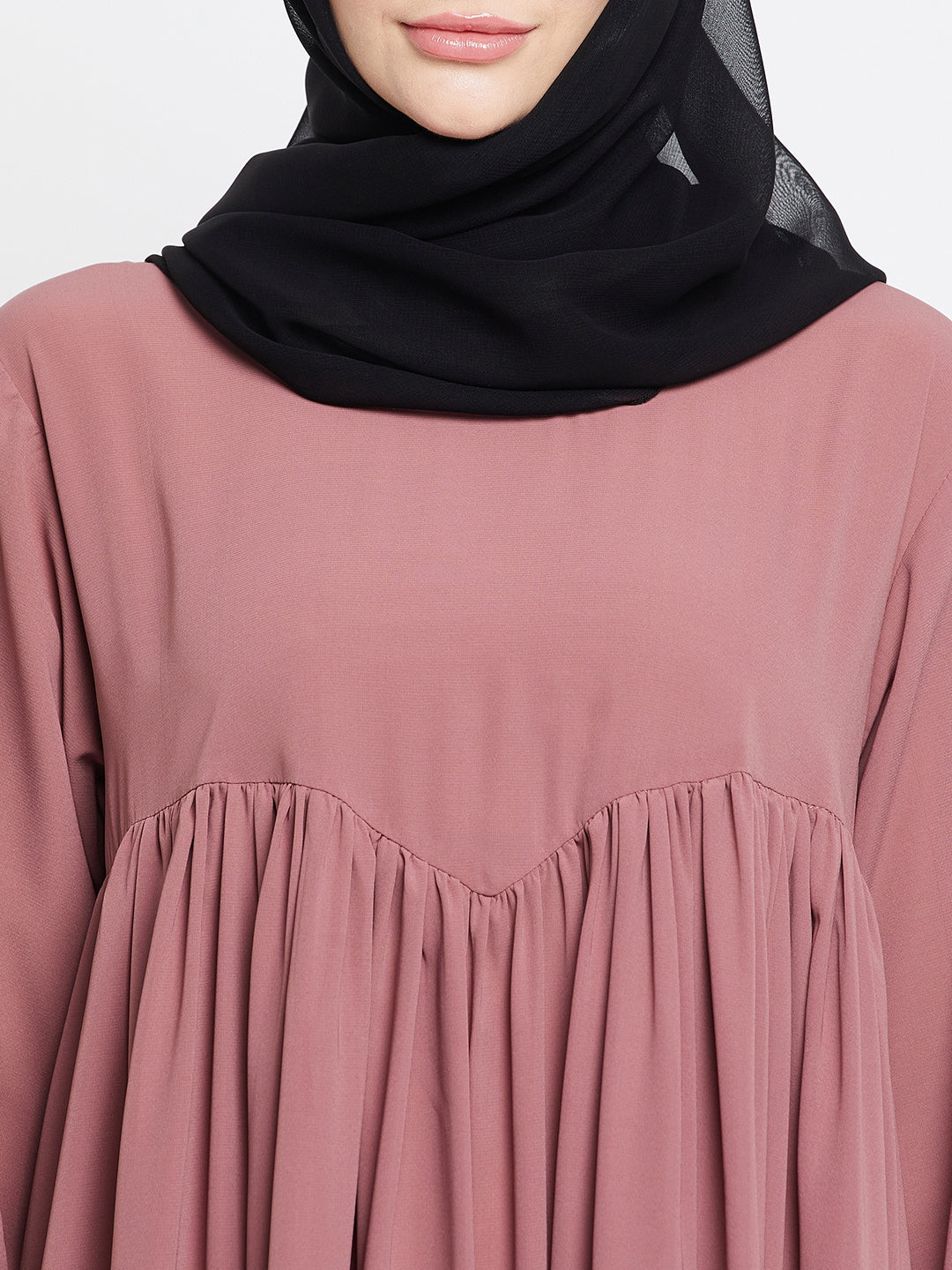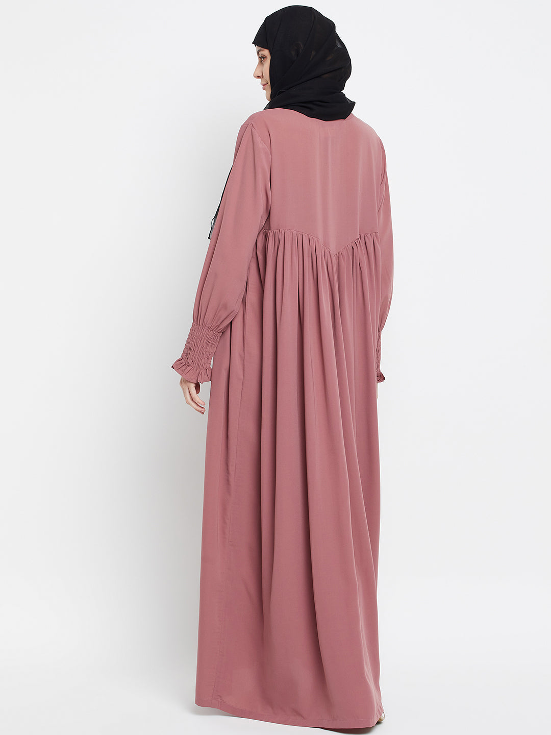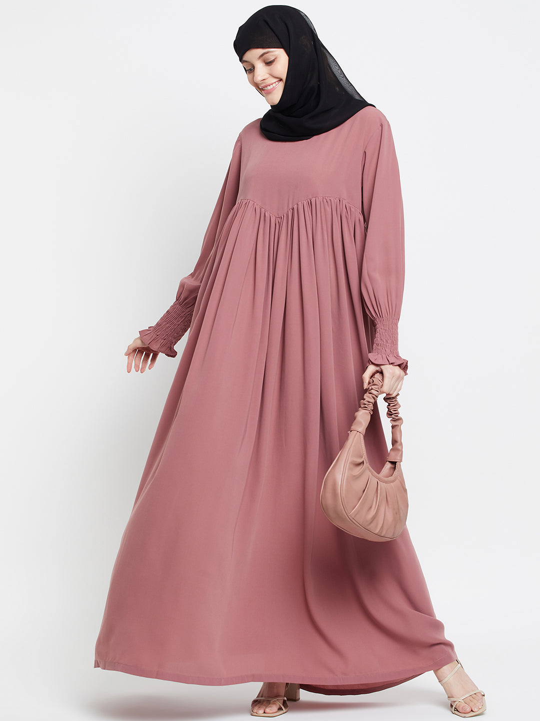 The Nabia puce pink abaya for women is designed for both style and comfort. Featuring elastic sleeves for easy adjustment, it's made from Nida Matte fabric and boasts long and puff sleeves, adding a touch of elegance to this modest attire.