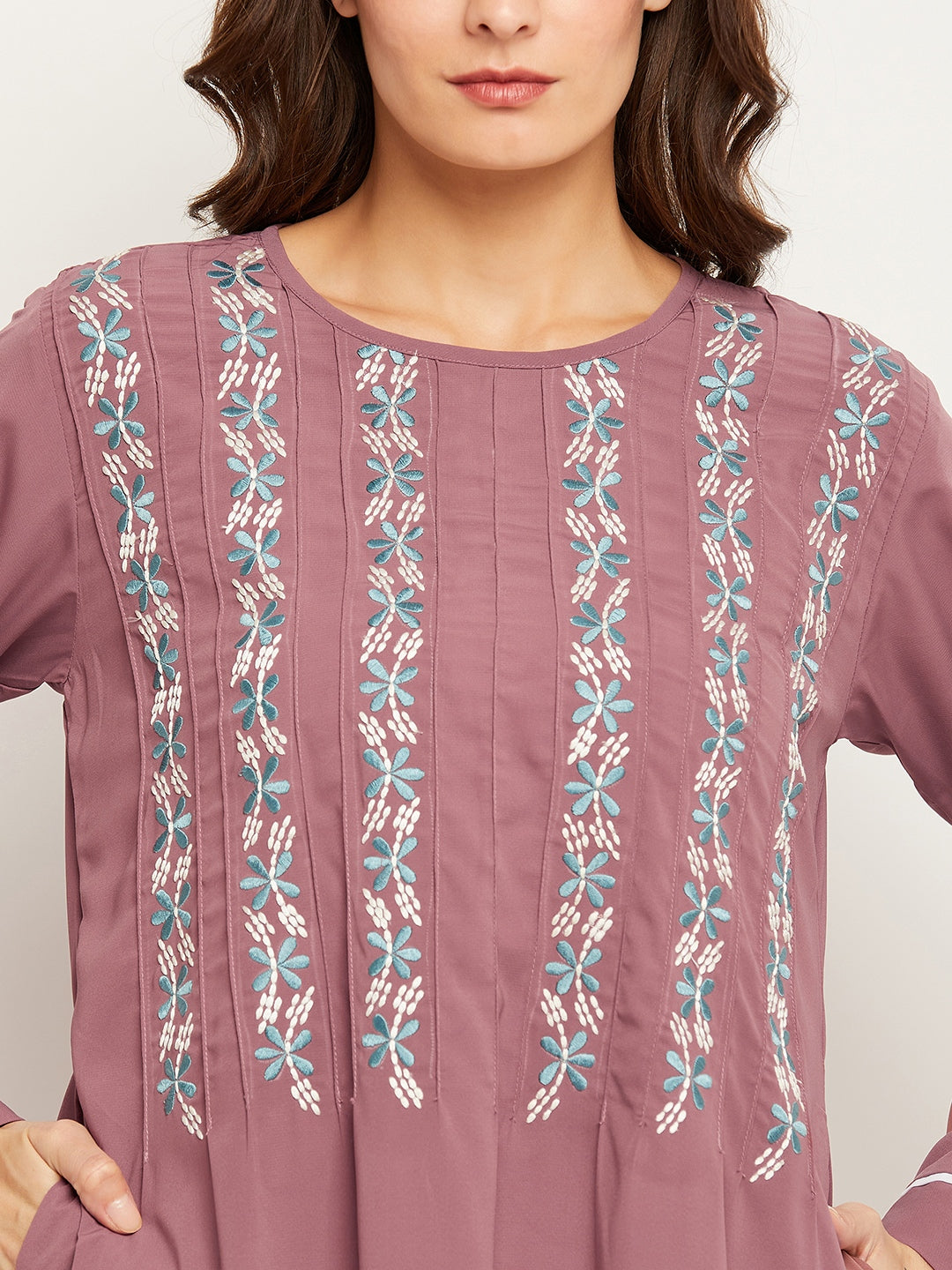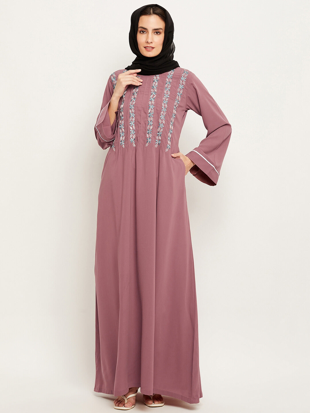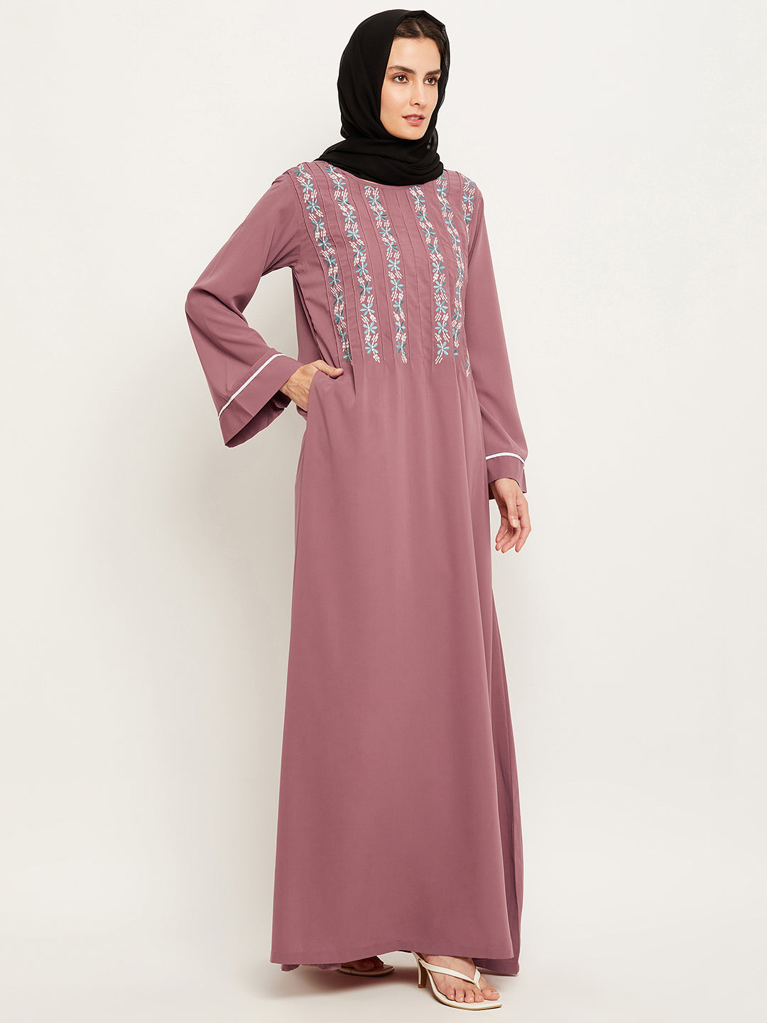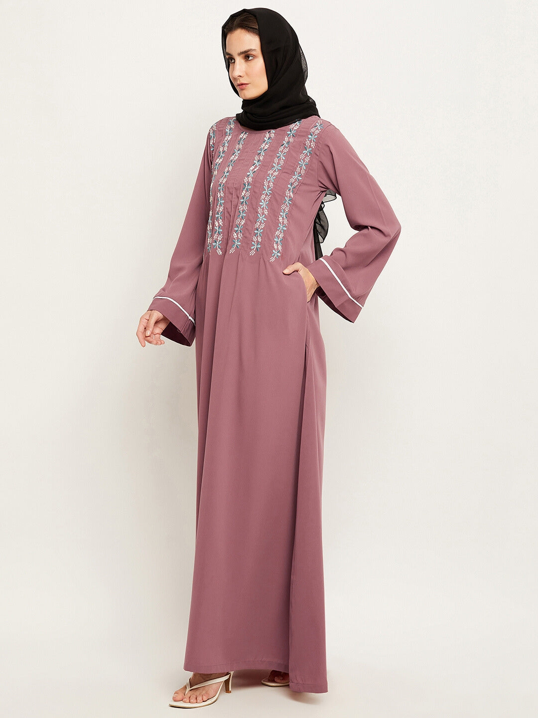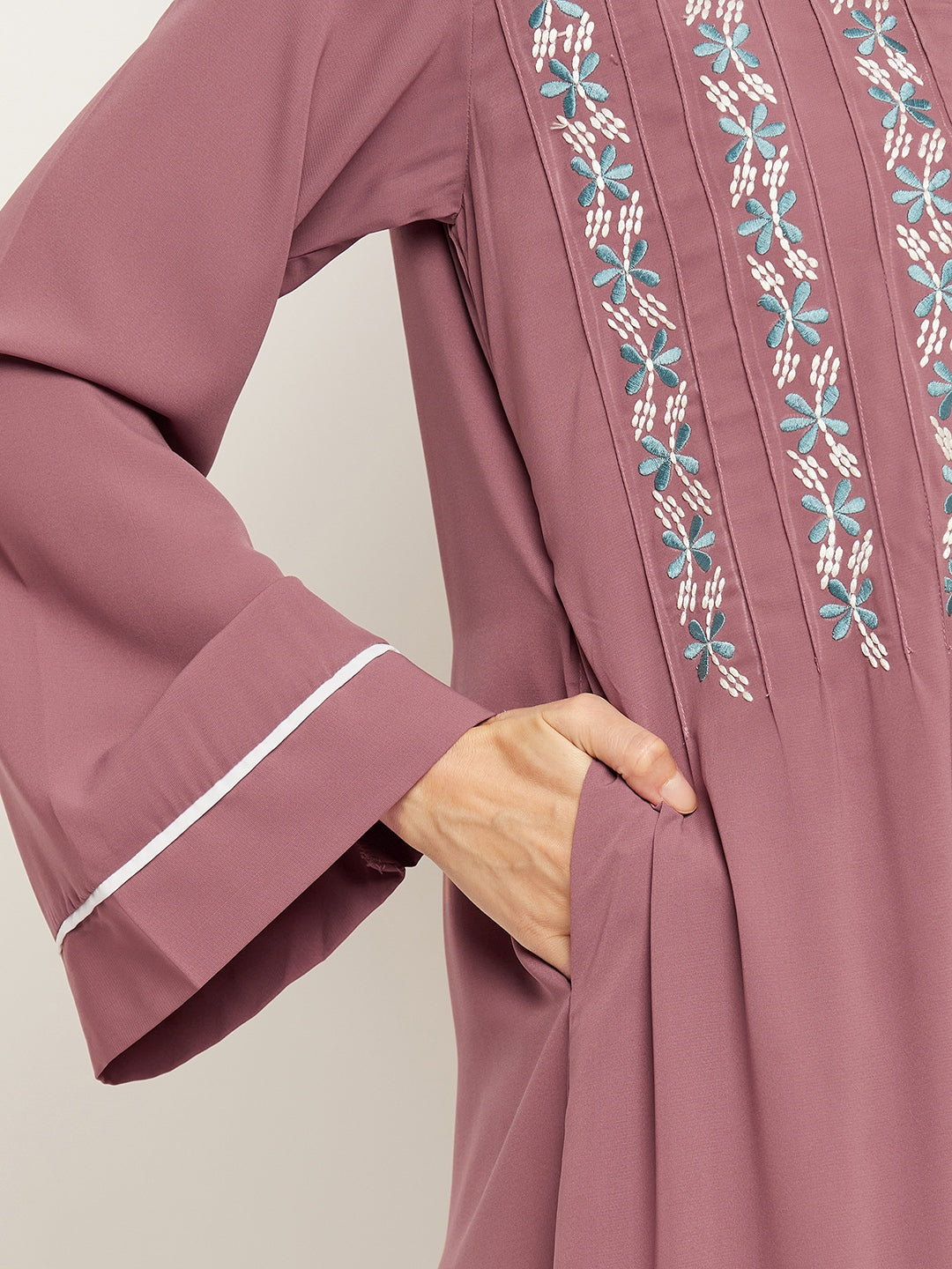 Explore the Puce Pink Embroidery Abaya by Nabia, conveniently available online. This Islamic attire combines modesty and style, featuring elegant embroidery on the front and striking piping design on the sleeves. Ideal for Muslim women, it offers a graceful expression of faith with contemporary flair.