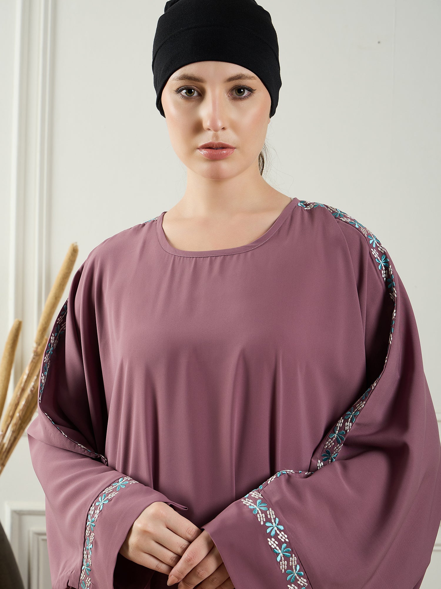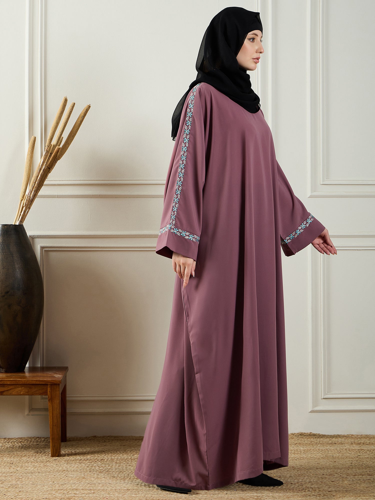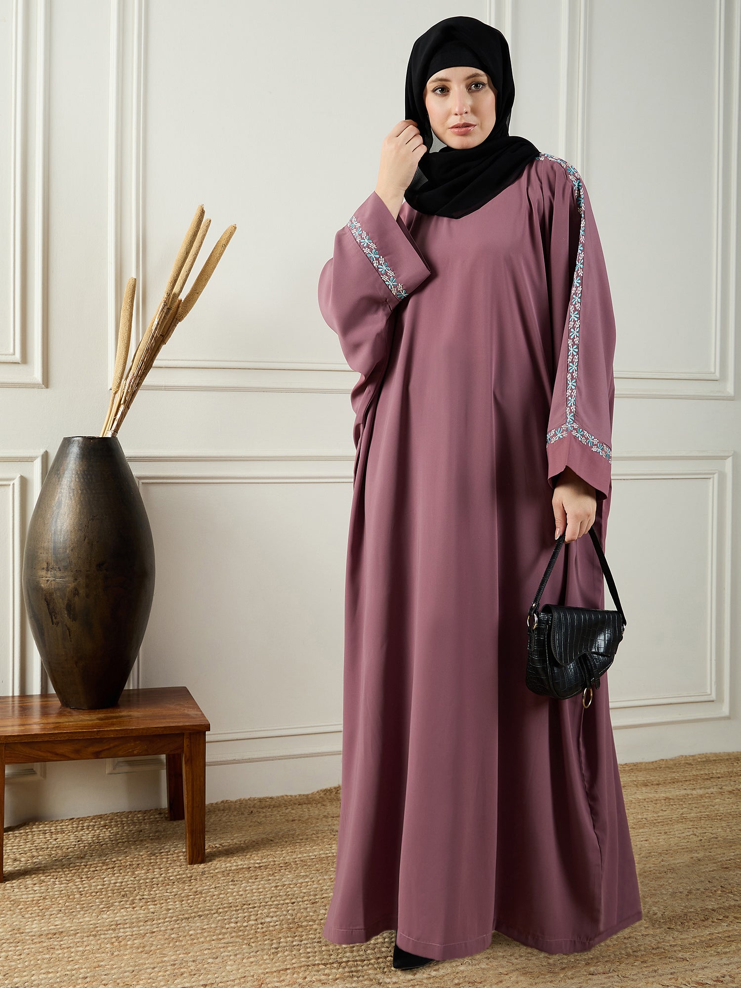 This puce pink abaya burqa showcases intricate embroidery detailing, ideal for Islamic and Muslim women seeking a loose fit and modest fashion. The latest trending design combines contemporary aesthetics with traditional elegance, offering an attractive look for everyday wear. Its relaxed silhouette enhances comfort while maintaining a chic appearance, making it a perfect addition to any modest wardrobe.
