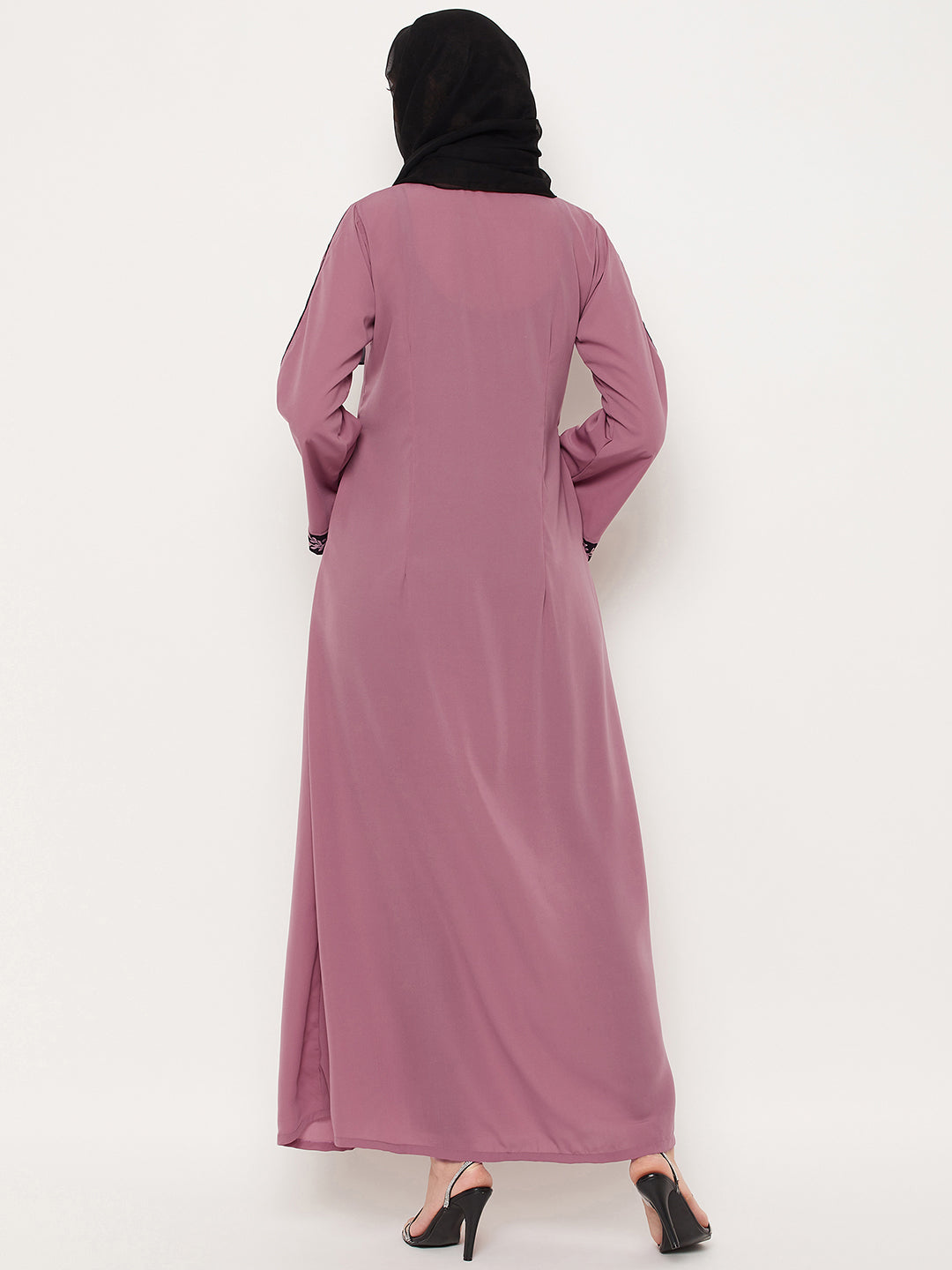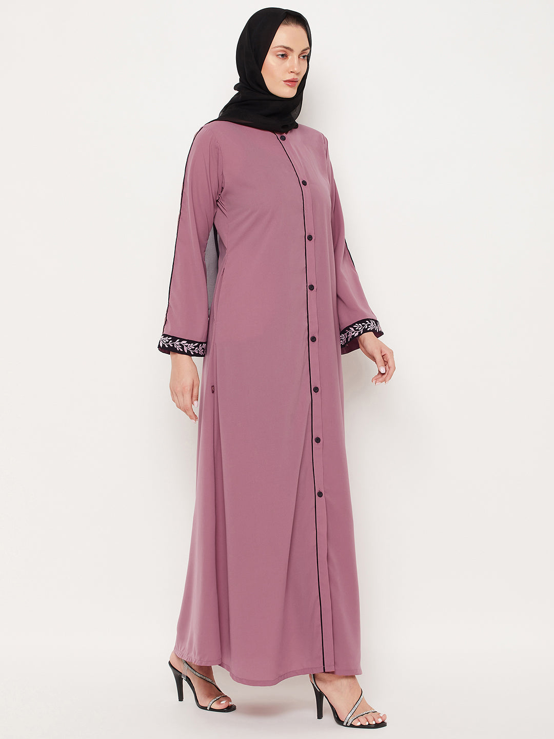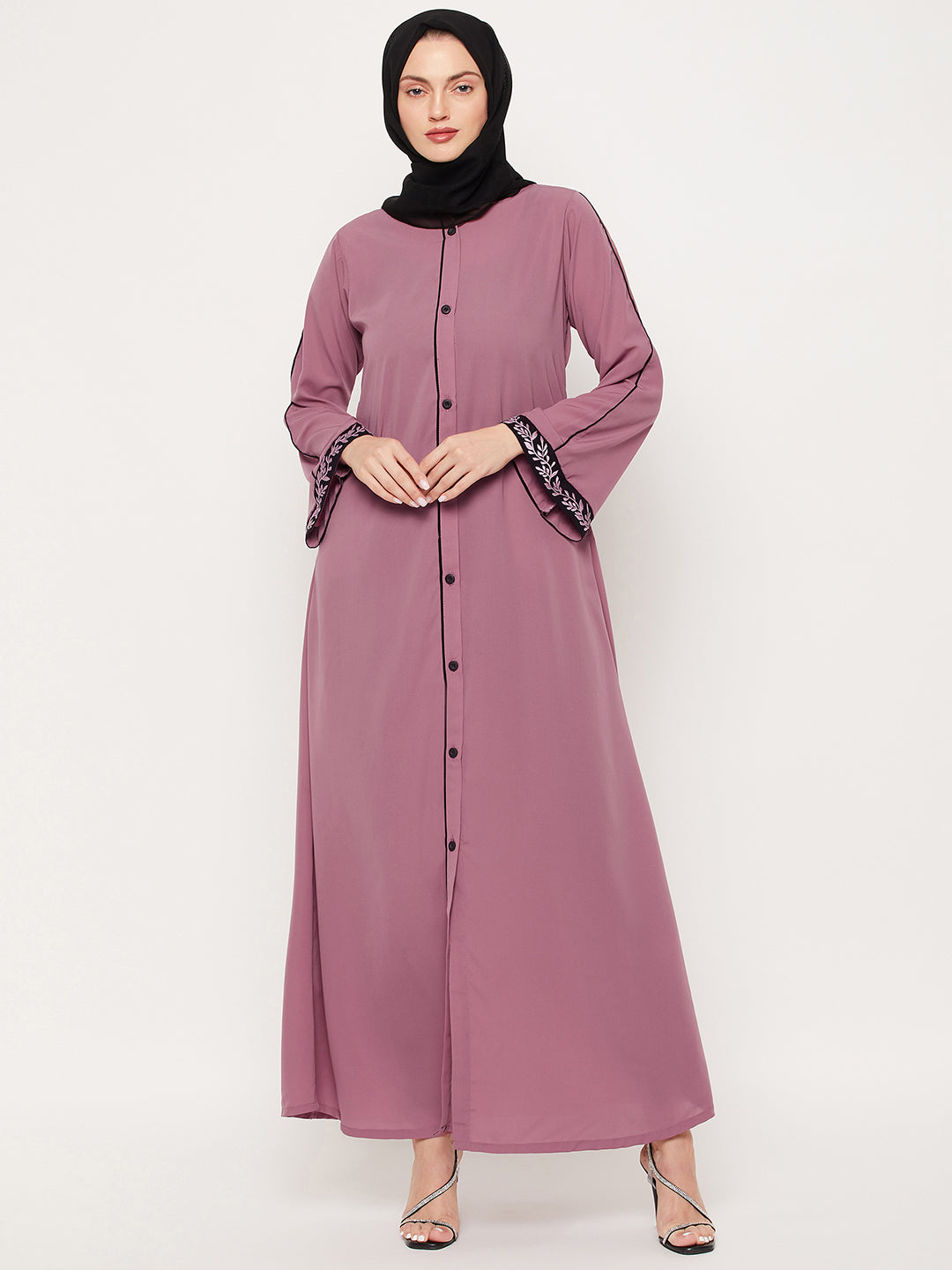 Be a proud symbol of elegance with this Hand-Embroidered front open A-Line fit Abaya, being made by ‘Nida Matte’ fabric gives it a niche. Made for your modesty and elegance while being a perfect comforting wear, it is adorned with traditional hand embroidery, long sleeves, and round neck. The A-Line fit and front open ensures supreme comfort and free movement while you are wearing it.