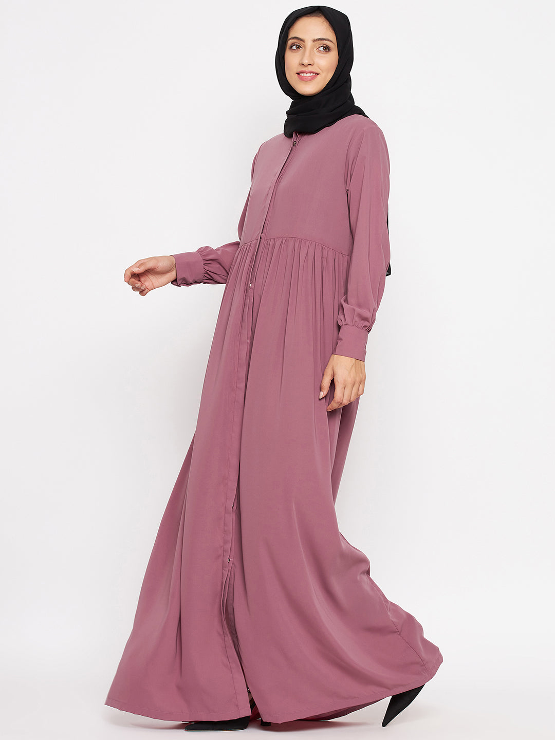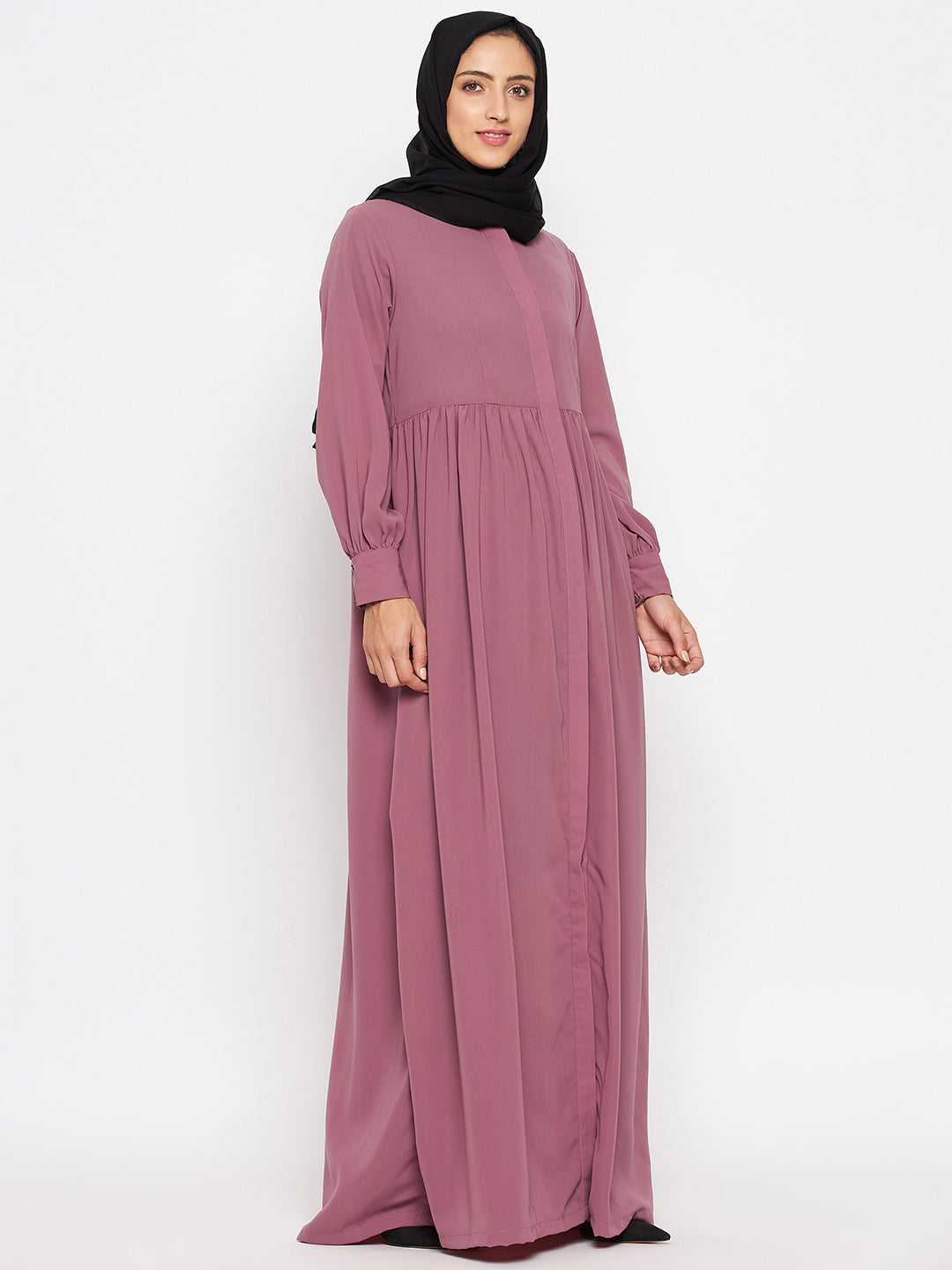 Nabia's Puce Pink Color Front Open Abaya Dress for women features a chic frill design, providing a trendy and modest appearance. The inclusion of a belt allows for adjustments, and the cuffed long sleeves add an elegant touch, making it a versatile and stylish choice.